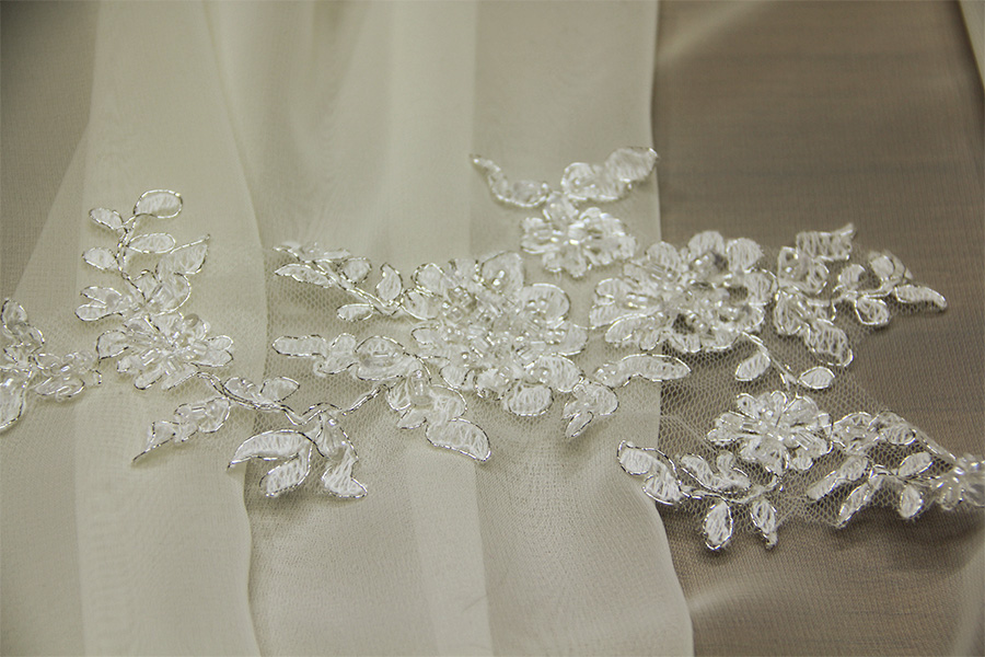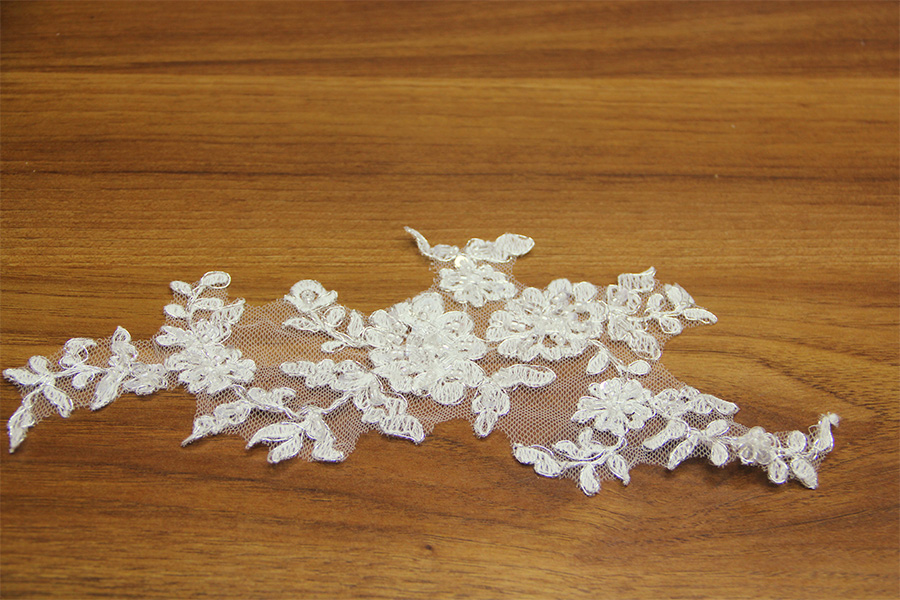 APPLICATIONS IN VALENCIENNE LACE ALREADY CUT SIZE 22X10 CM. VERY LIGHT IVORY COLOR (SILK) WITH SILVER REBRODE ‘THREAD SUITABLE FOR WEDDING / CEREMONY APPLICATIONS