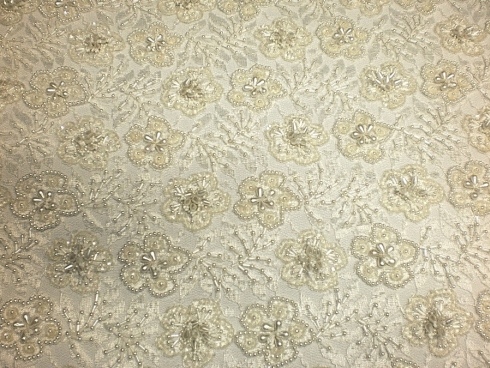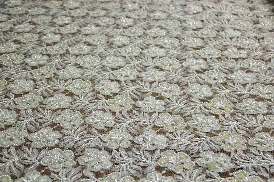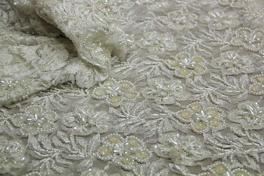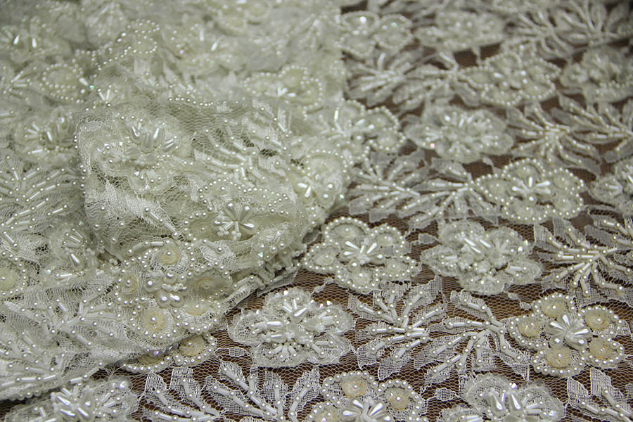 PIZZO RICAMATO CON PERLE BIANCO SETA ART 3002 H: 90 CM €200,00 AL MT 60% COTONE 40% VISCOSA RICAMATO A MANO CON: TUBICINI IN VETRO TESSILE, PERLINE, GOCCE IN RILIEVO, PAILETTES AVORIO. SENZA FESTONI. INDICATO PER: CORPETTI, APPLICAZIONI.