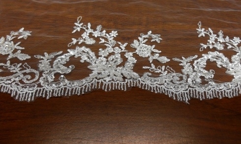 EDGE IN WHITE EMBROIDERED TULLE ART 0700 H: 14 CM € 29.00 / MT 80% VISCOSE 20% POLYESTER EMBROIDERED WITH: PEARLS, BEADS, TRANSPARENT SEQUINS AND TUBES IN WHITE TEXTILE GLASS
