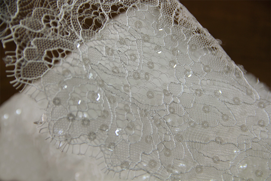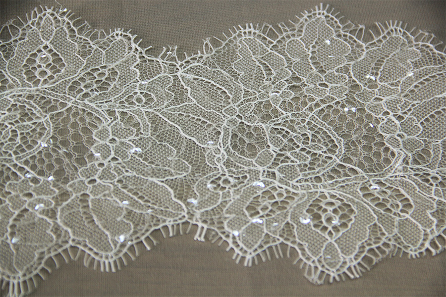 PRECIOUS BORDER IN VALENCIENNE LACE EMBROIDERED WITH TRANSPARENT SEQUINS, NATURAL SILK COLOR, FINISHED WITH 2 UGULI BOWLS ON BOTH SIDES. SUITABLE FOR: VEILS, WEDDING DRESSES ETC.