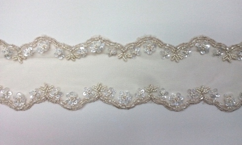 BORDO IN TULLE RICAMATO CON PERLINE, PAILETTES TRASPARENTI E TUBICINI IN VETRO TESSILE COLORE ECRU.