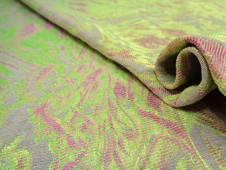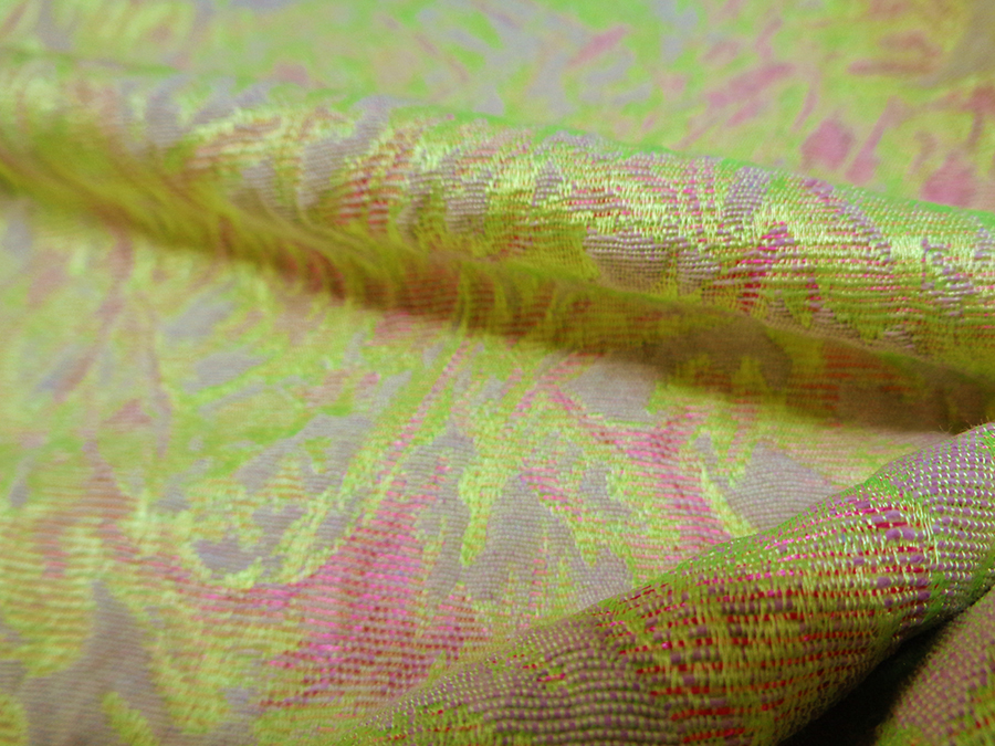 PREGIATISSIMO ED ESCLUSIVO TESSUTO IN BROCCATO IN SETA ALTA MODA. PESO MEDIO, CORPOSO CON MANO LEGGERMENTE RIGIDA CON LAVORAZIONE JAQUARD CANGIANTE STILIZZATA SUI TONI DEL LILLA, GIALLO E VERDE ACIDO. TESSUTO UNISEX INDICATO PER: GIACCHE, GONNE, ABITI, COMPLETI, PANTALONI, ECC..