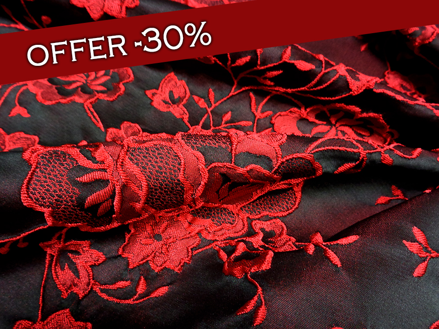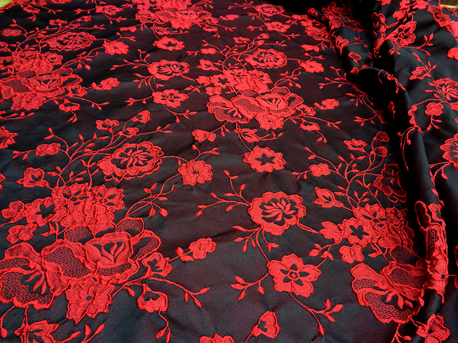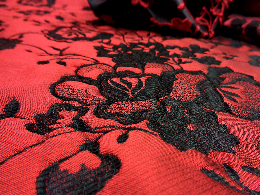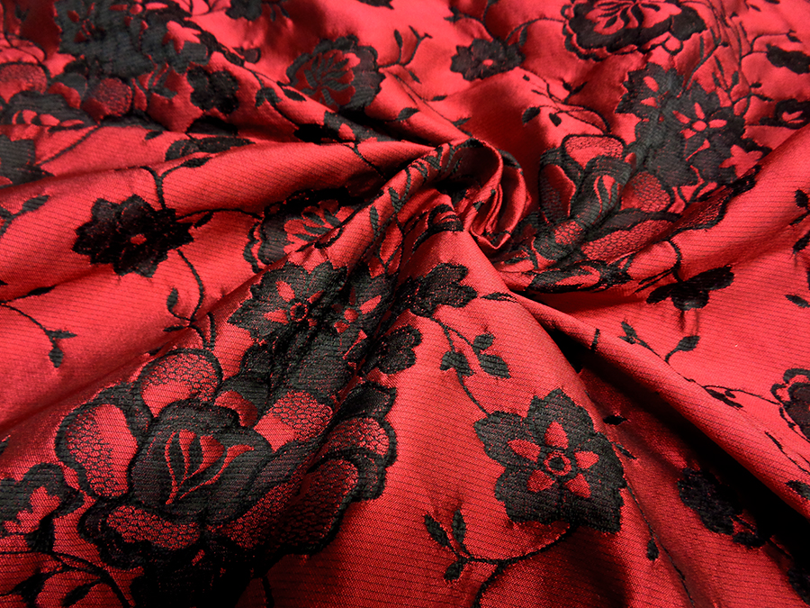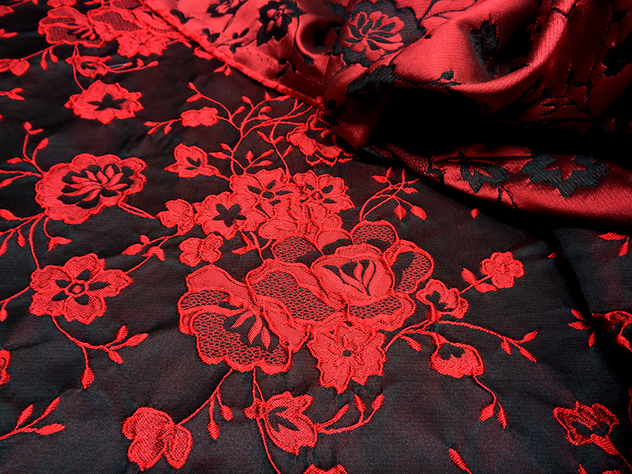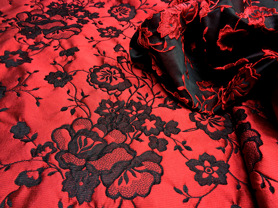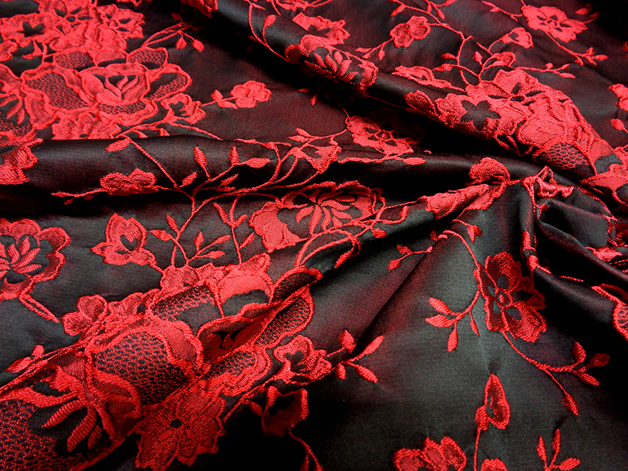 PREGIATO ED ESCLUSIVO BROCCATO JAQUARD DOUBLEFACE ALTA MODA. PESO MEDIO, CORPOSO E COMPATTO. DA UN LATO BASE DUCHESSE FONDO NERO CON ROSE IN RILIEVO ROSSE, DALL’ALTRO LATO ROSSO CON FANTASIA NERA. POSSIBILITA’ DI UTILIZZO DA AMBO I LATI. TESSUTO UNISEX INDICATO PER: GIACCHE, GONNE, ABITI, COMPLETI, PANTALONI, ECC..