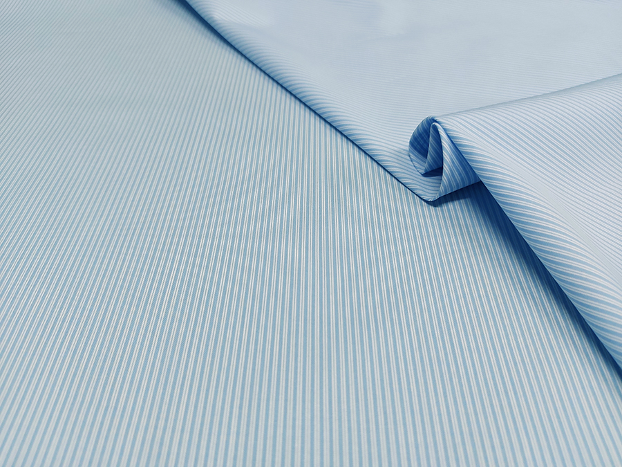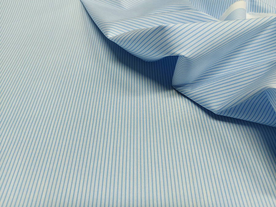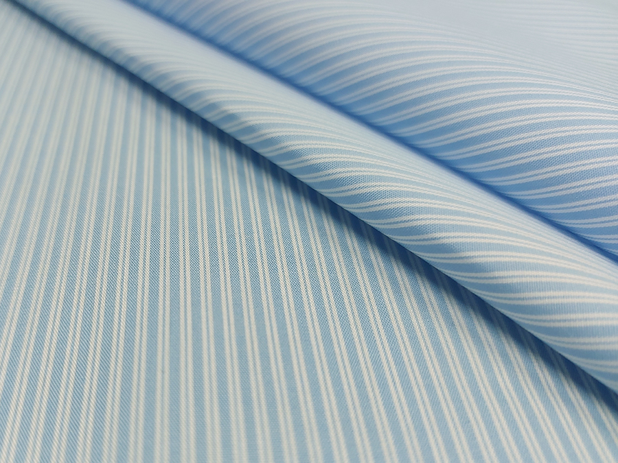 PREGIATO POPELINE DI PURO COTONE SETIFICATO DOPPIO RITORTO .LEGGERO, MORBIDO E SETOSO, FONDO AZZURRO CON MICRO BACCHETTATO CELESTE CHIARO. TESSUTO UNISEX. INDICATO PER: CAMICIE, ABITI, CAMICIONI, PIGIAMI, ECC..