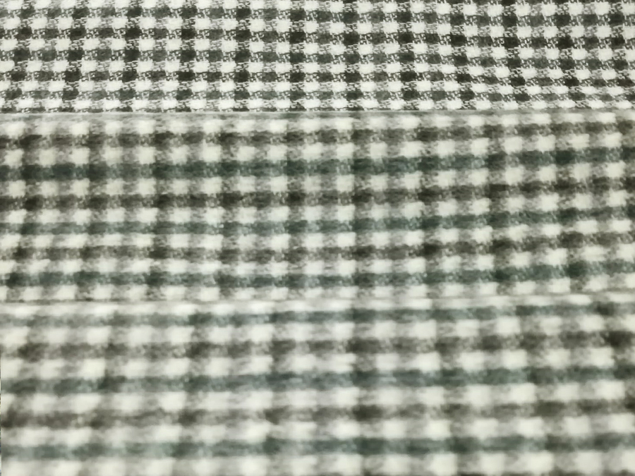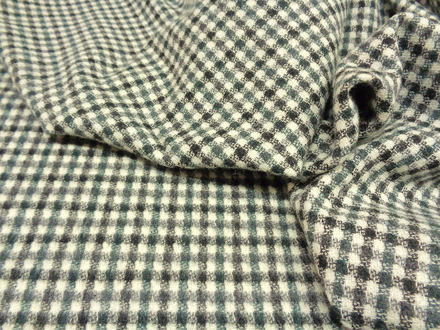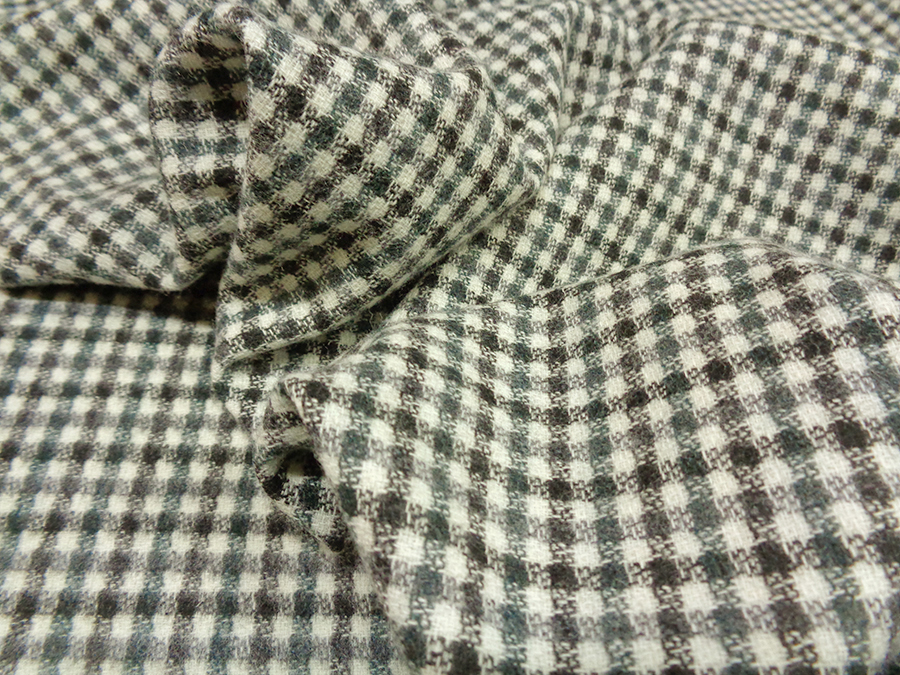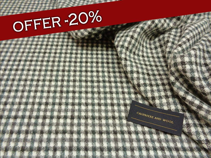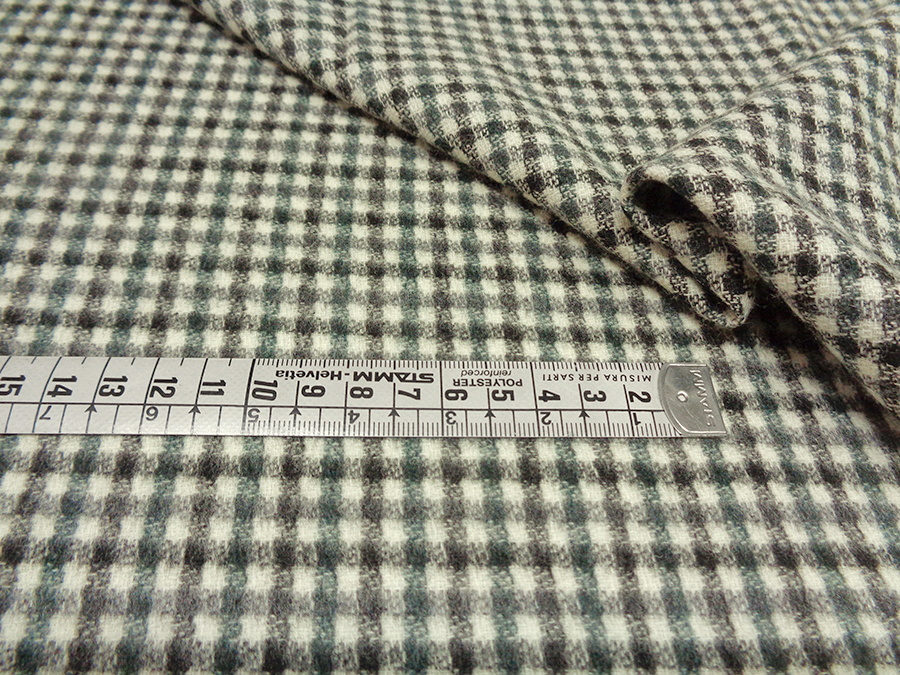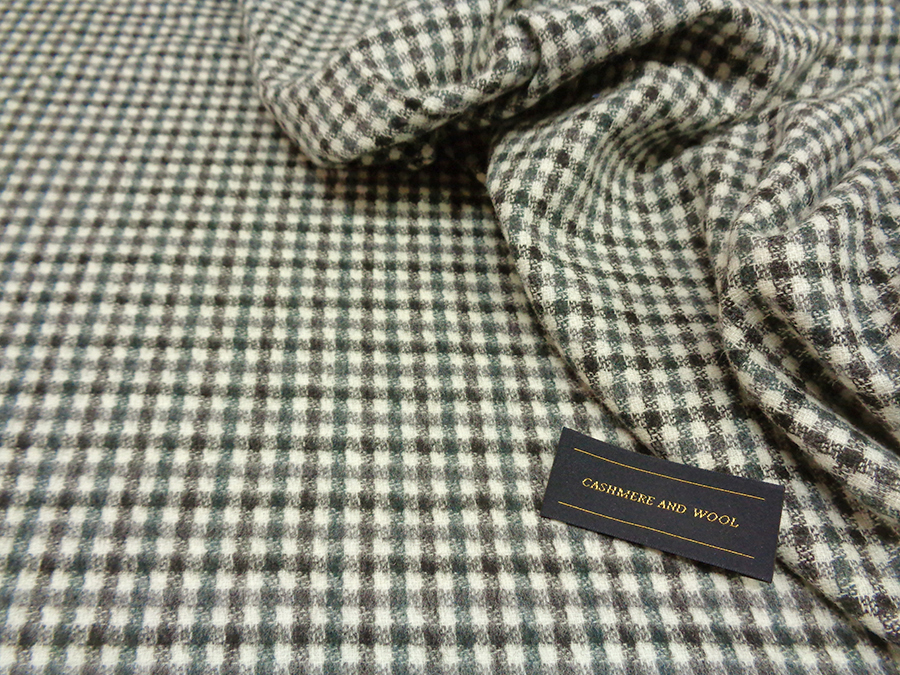 LANIFICIO CERRUTI STOCK (NO FIRMATO, NO CORREDATO DA ETICHETTE). PREGIATO ED ESCLUSIVO TESSUTO IN CASHMERE E LANA CARDATO, MORBIDISSIMO, CALDO, SETOSO ED OPACO. FONDO BIANCO CON QUADRETTATO SUI TONI DEL PENICILLINA E NERO. LAVORAZIONE DOUBLEFACE (NON APRIBILE). DA UN LATO CON LAVORAZIONE A PELO CHE RENDE IL QUADRETTO SFUMATO, DALL’ALTRO LATO LAVORAZIONE RASATA CON QUADRETTO PIU’ NETTO. TESSUTO UNISEX INDICATO PER: GIACCHE, TAILLEUR, PANTALONI, ABITI , GILET, VESTAGLIE, ECC..