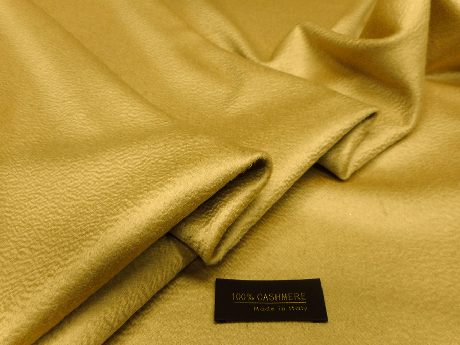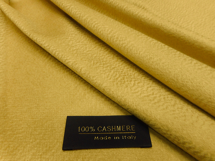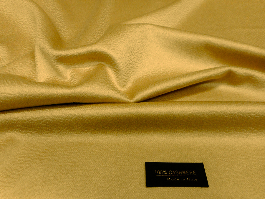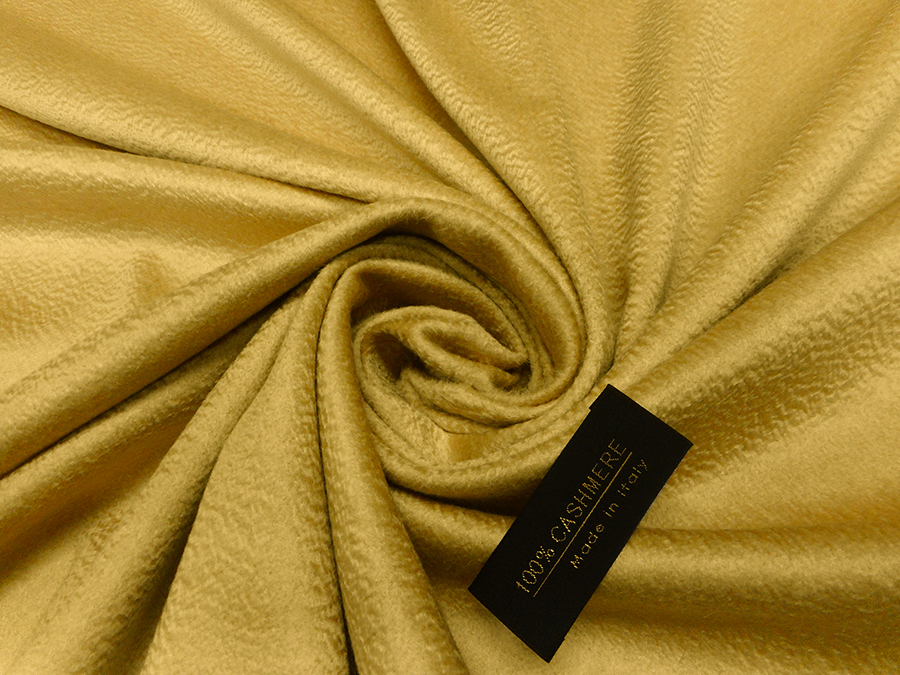 PREGIATO TESSUTO IN PURO CASHMERE CON LEGGERA LAVORAZIONE ZIBELLINO (ONDULATA), MORBDO SETOSO, CONSISTENTE E LUMINOSO. COLORE GIALLO CHIARO CON SFUMATURE ORO INDICATO PER: CAPPOTTI, SOPRABITI, MANTELLE, STOLE, ACCOPPIATI CON PELLICCE, ACCOPPIATI CON CAPI IN PELLE, VESTAGLIE, COPERTE, PLAIDS, CAPPELLI, ECC..