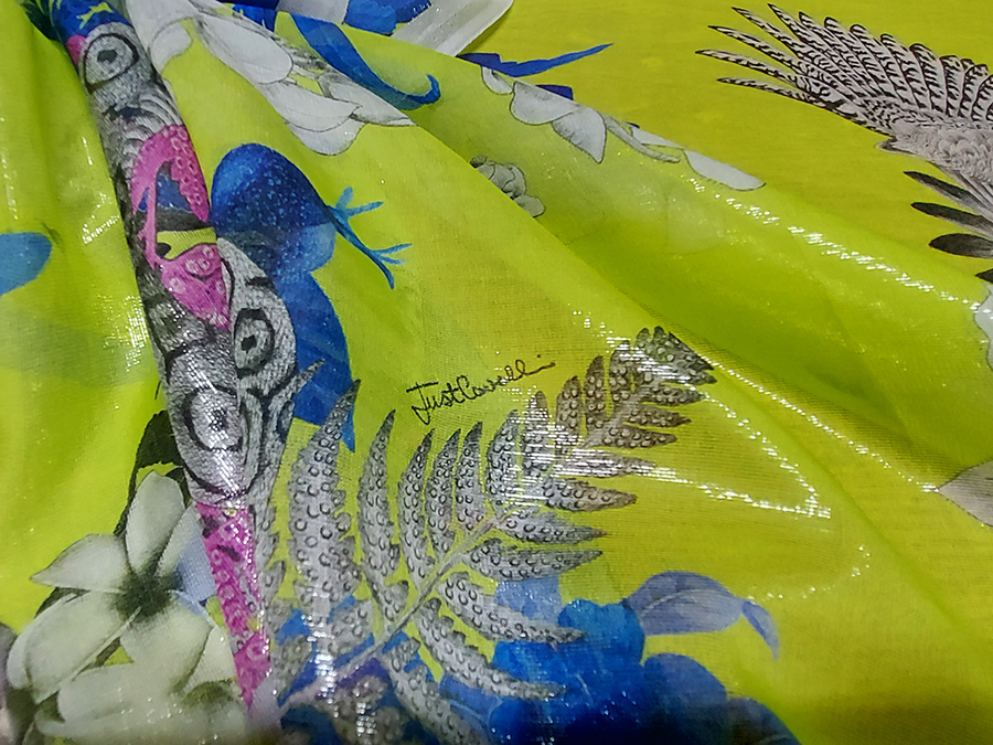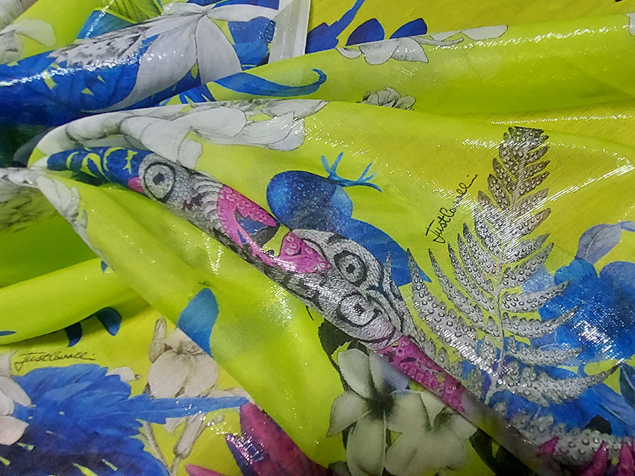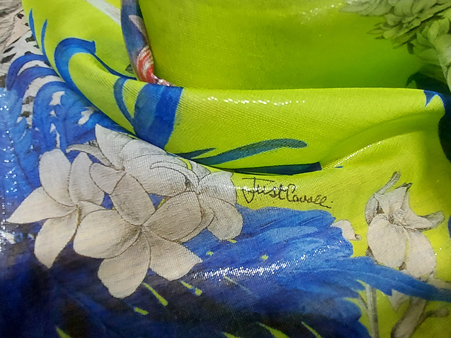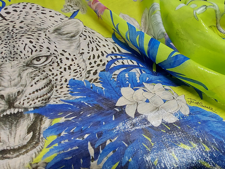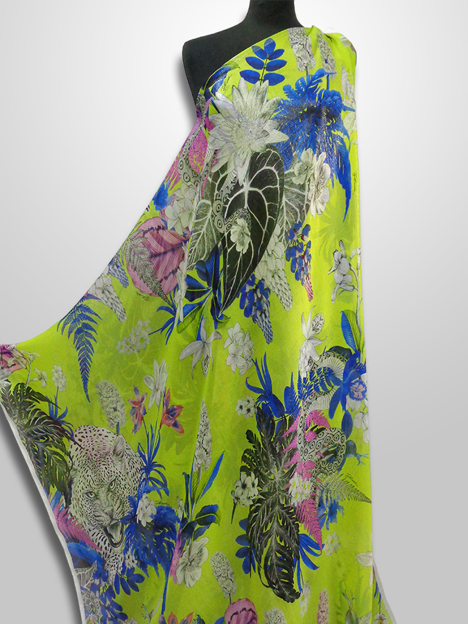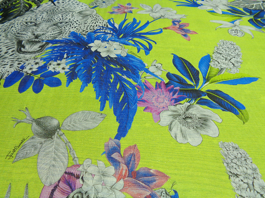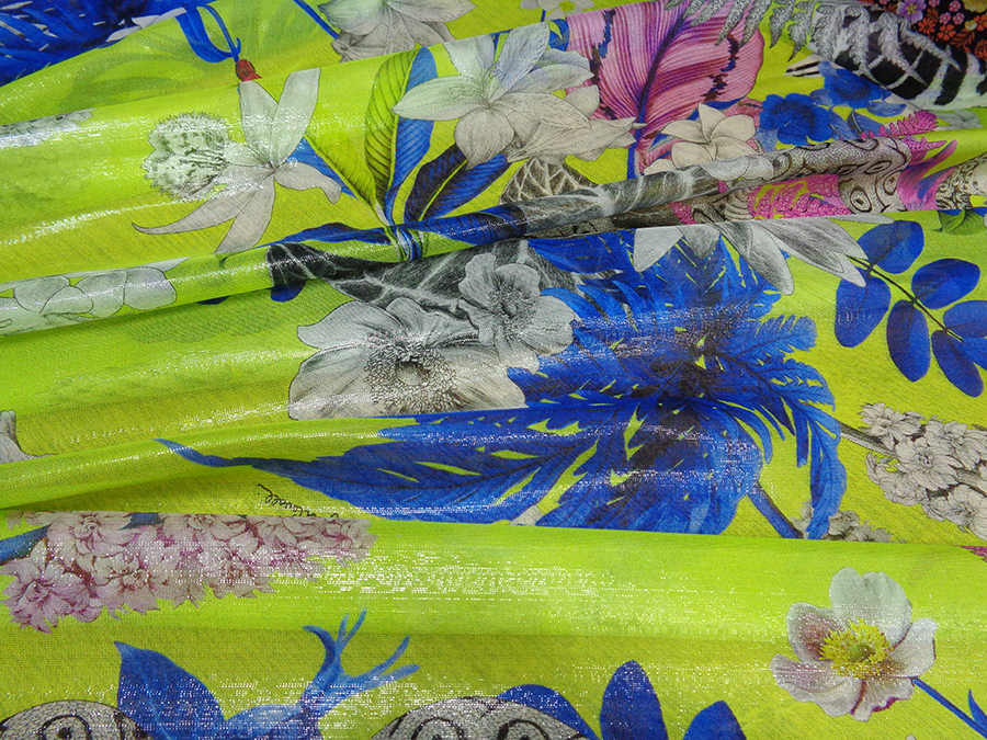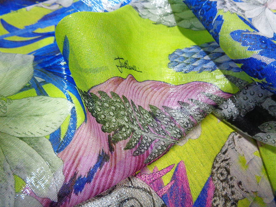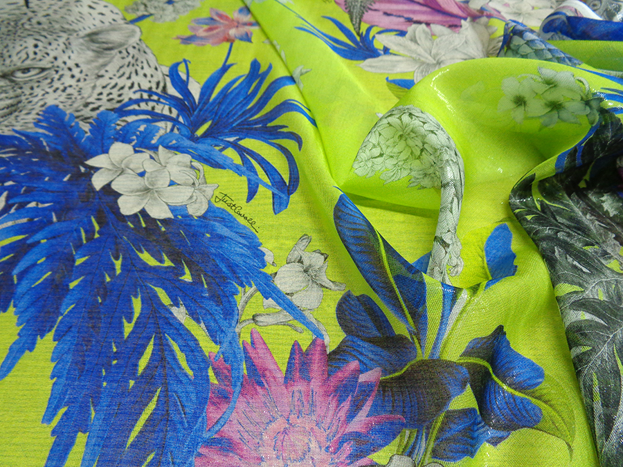 FIRMATO ‘’JUST CAVALLI’’ (STOCK, NO CORREDATO DA ETICHETTE) PREGIATA ED ESCLUSIVA CHARMEUSE IN SETA PURA, LEGGERISSIMA, MORBIDA, SOFFICE E VELATA, FONDO VERDE ACIDO CON  PARTICOLARE EFFETTO ACQUA / CANGIANTE OTTENUTO DAI FILATI DI METALLO IN CATENA, CON FANTASIA FLOREALE E ANIMALE. LA LAVORAZIONE ESCLUSIVA DEI FILI IN METALLO IN CATENA RENDE IL TESSUTO LEGGERMENTE VAPOROSO TIPO ORGANZA. INDICATO PER: ABITI, CAFTANI, BLUSE, GONNE, TOP, PIGIAMA PALAZZO, PANTALONI MORBIDI , ECC.. TESSUTO ESCLUSIVO NON RIASSORTIBILE.