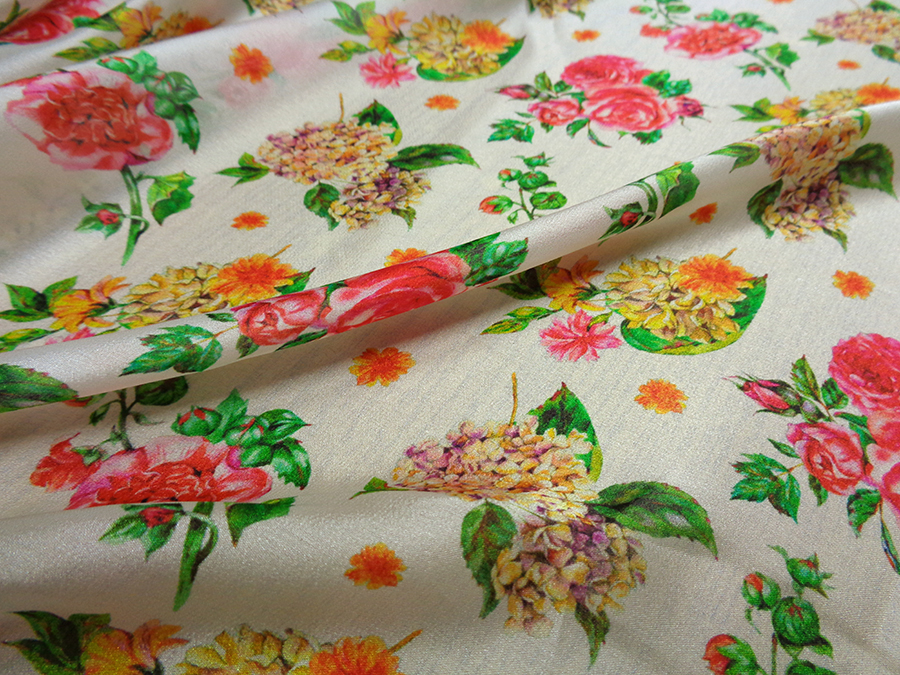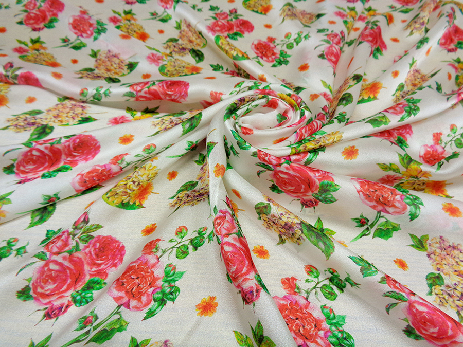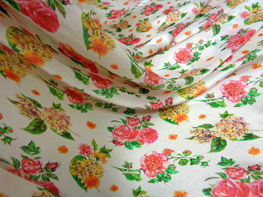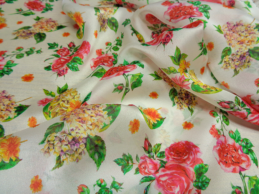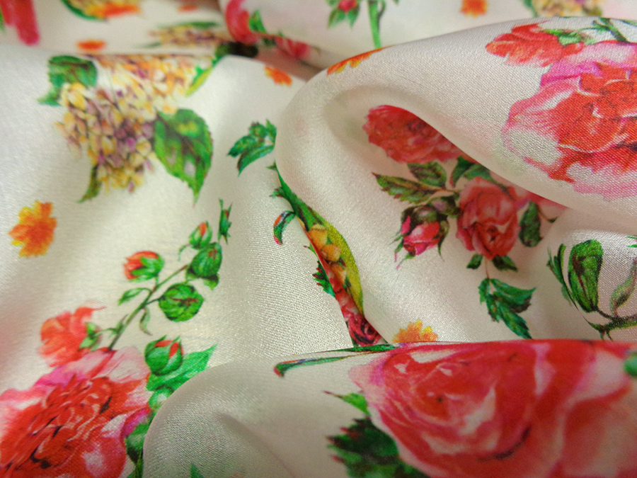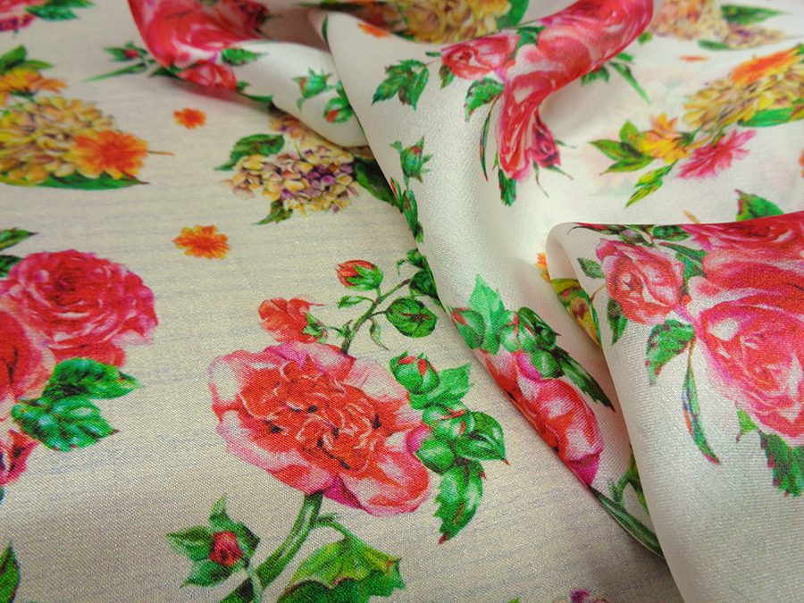 PREGIATO TESSUTO IN CHARMEUSE DI SETA PURA ALTA MODA. LEGGERISSIMA, VELATA, MORBIDA, SETOSO E LUMINOSA FONDO BIANCO CON DELICATI FANTASIA FLOREALE SUI TONI DEL ROSSO, FUCSIA, GIALLO E VERDE. INDICATO PER: BLUSE, CAMICIE, ABITI, GONNE, CAFTANI, STOLE, ECC..