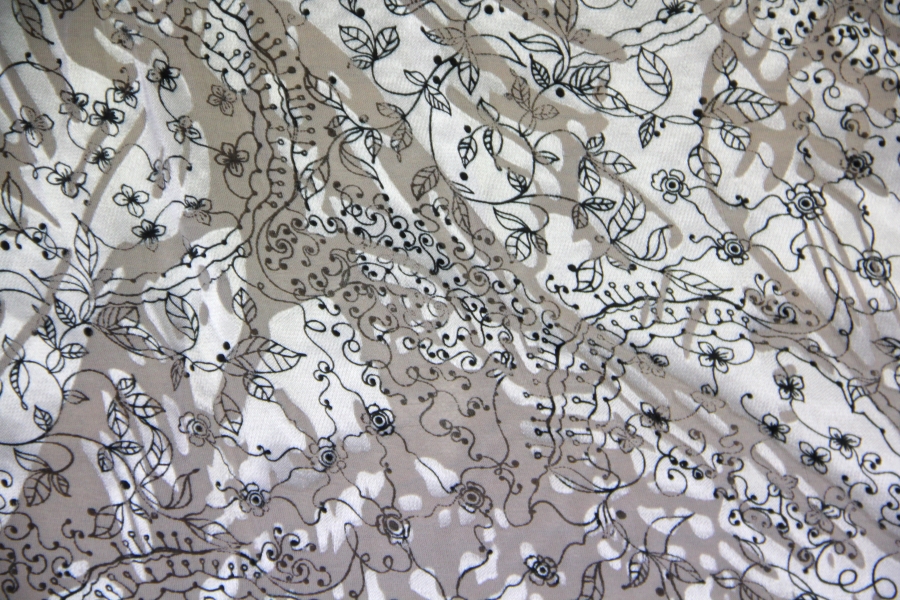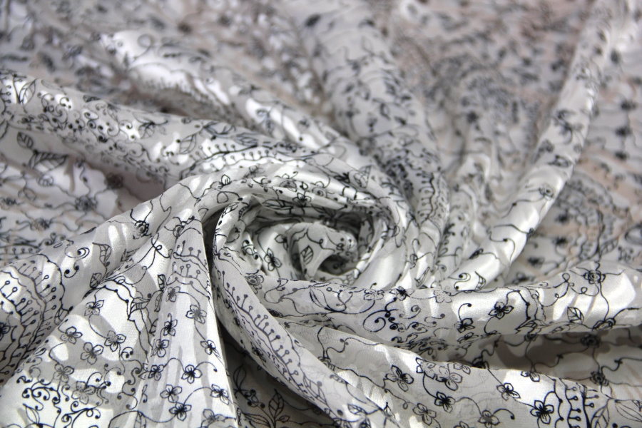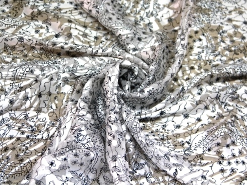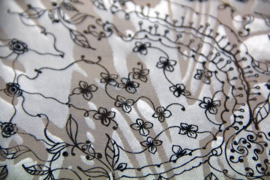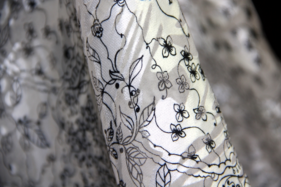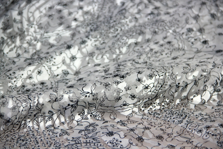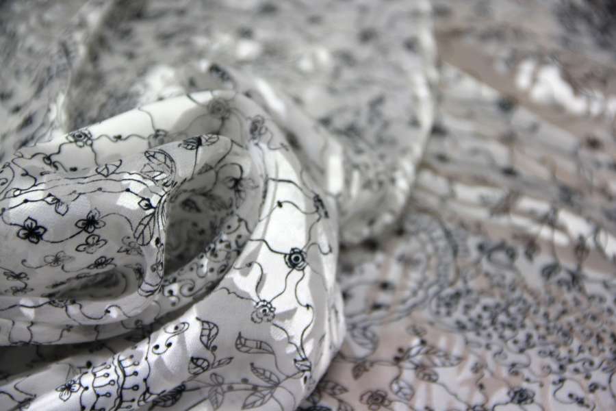 CHIFFON WITH CHARACTERISTIC GLOSSY AND MATT WORKING WHITE BOTTOM WITH BLACK STYLIZED DRAWINGS. SUITABLE FOR: ELEGANT DRESSES, BLUES, SKIRTS, ETC.