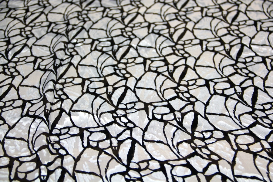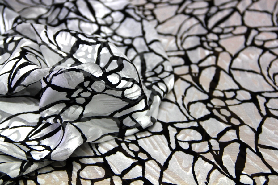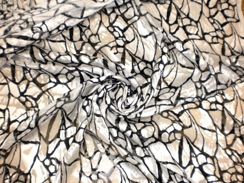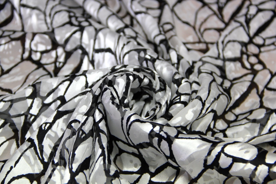 BY GALITZINE STOCK CHIFFON WITH CHARACTERISTIC GLOSSY PROCESS AND MATT WHITE BOTTOM WITH BLACK STYLIZED DESIGNS. SUITABLE FOR: ELEGANT DRESSES, BLUES, SKIRTS, ETC.