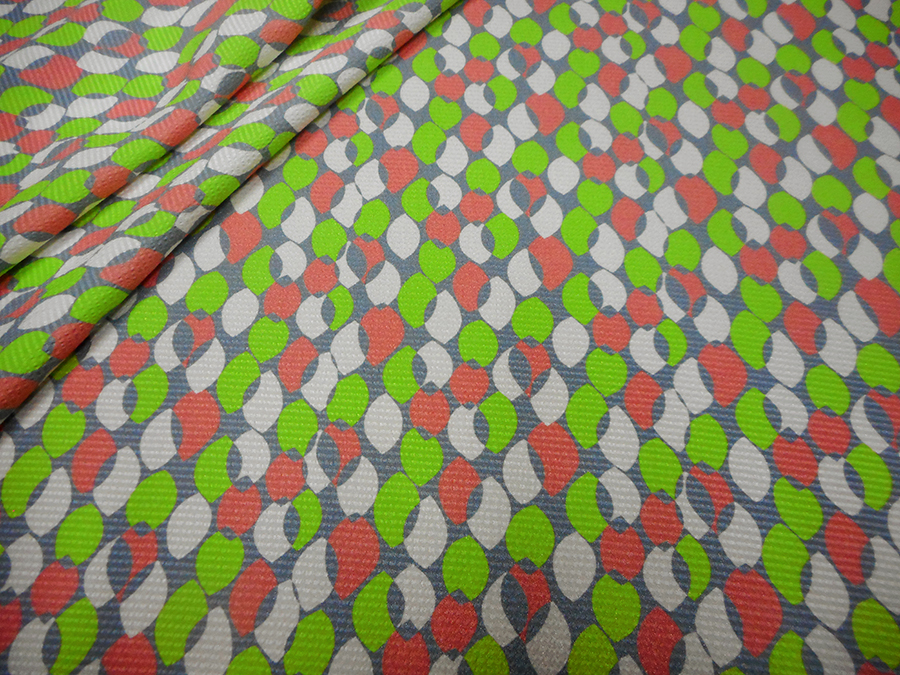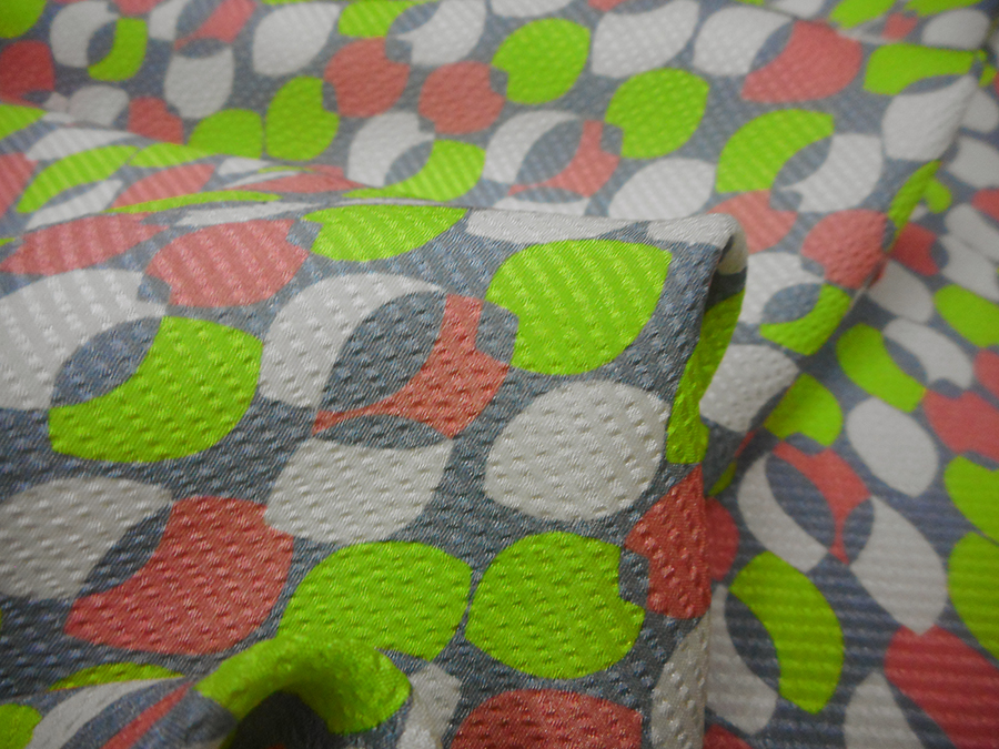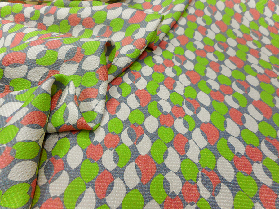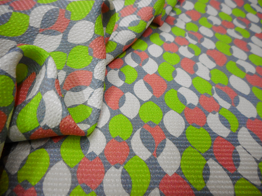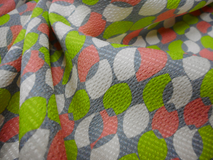 MORBIDISSIMO TESSUTO SETIFICATO CON PARTICOLARE LAVORAZIONE CLOQUET FONDO GRIGIO E DISEGNI STILIZZATI CORALLO E VERDE ACIDO. INDICATA PER:ABITI, CASACCHE, PANTALONI, GONNE, ECC..