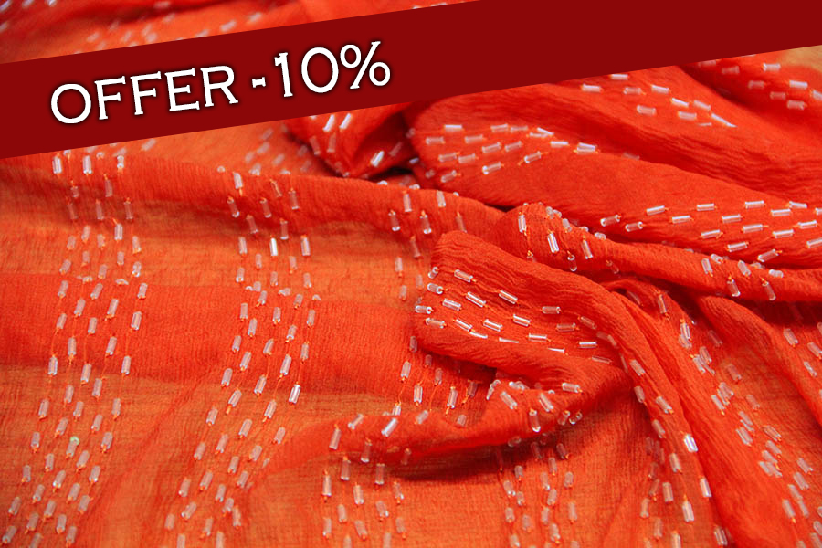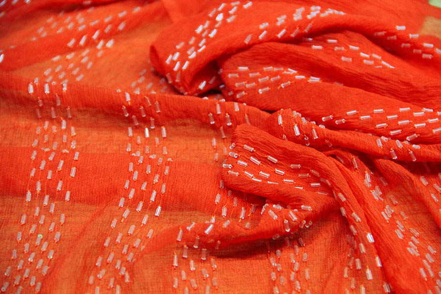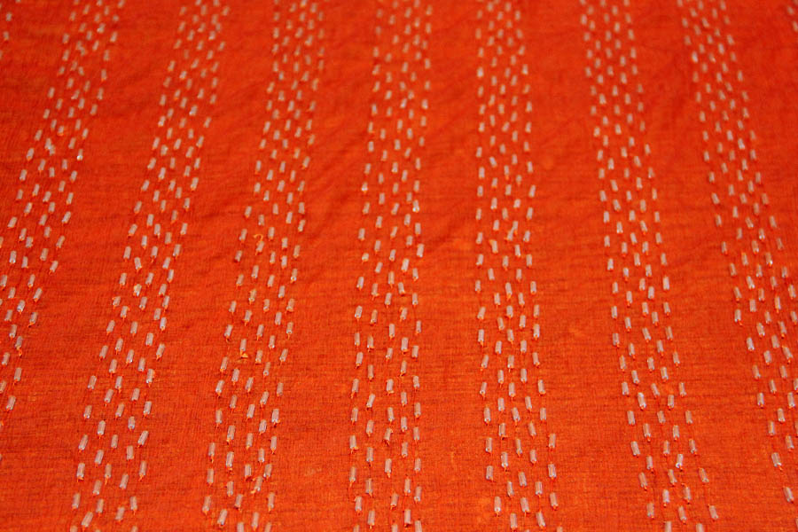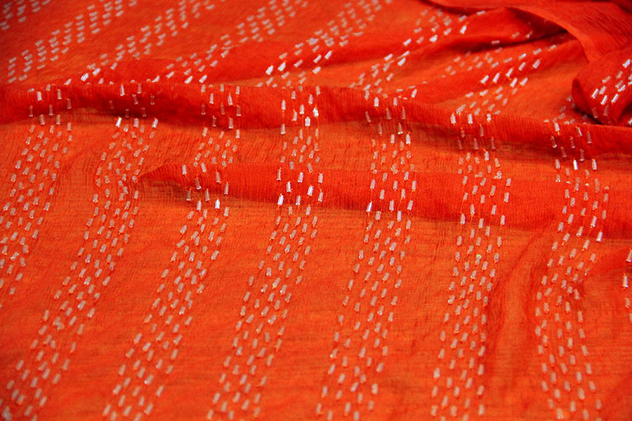 MORBIDA GEORGETTE RICAMATA CON TUBICINI IN VETRO TESSILE TINTA SU TINTA CON RICAMO EFFETTO RIGA IN VERTICALE. COLORE: ARANCIONE. INDICATA PER ABITI ELEGANTI.