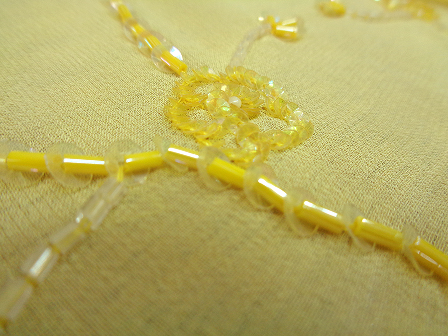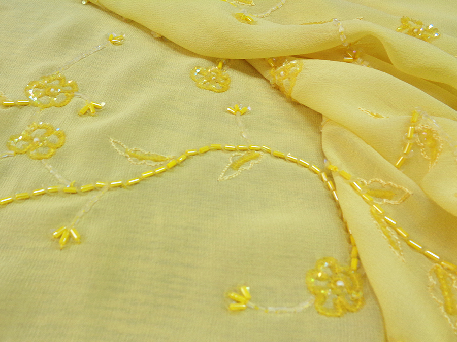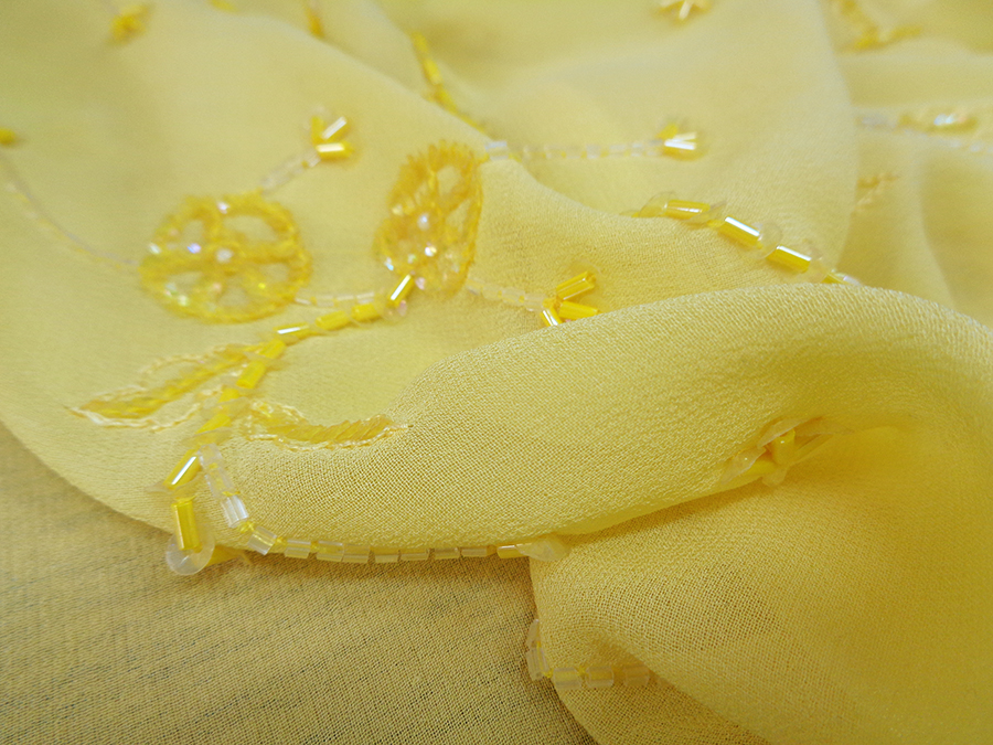 GEORGETTE RICAMATA A MANO CON PICCOLE PAILETTES GIALLE, TRASPARENTI E TUBICINI IN VETRO TESSILE IN GIALLO BRILLANTE. INDICATO PER: ABITI ELEGANTI.