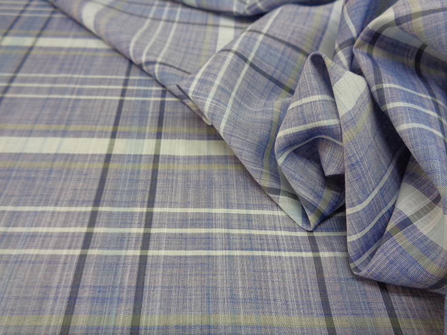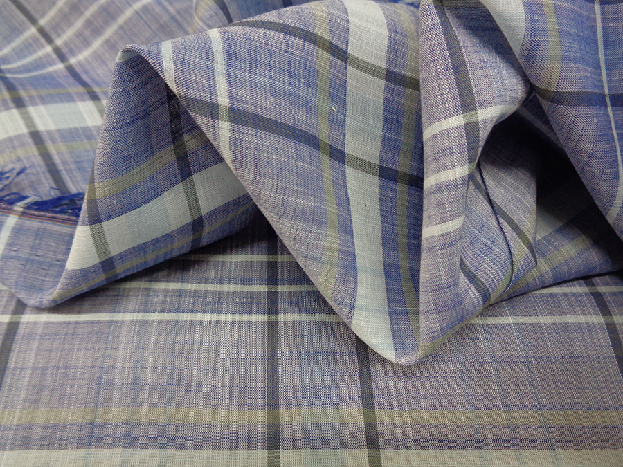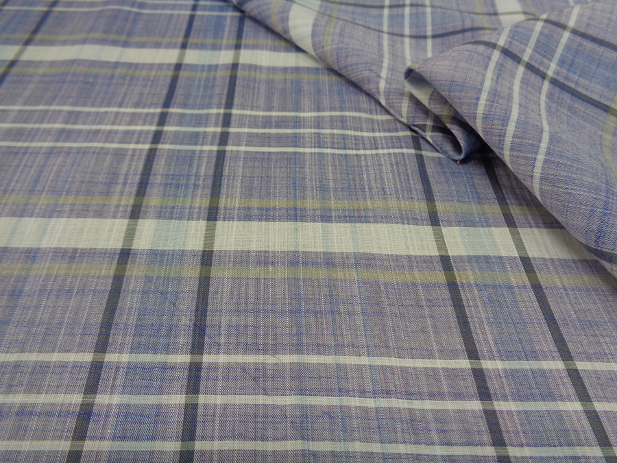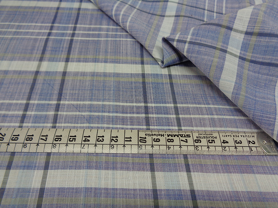 PREGIATA BATISTA SVIZZERA IN PURO COTONE, MORBIDISSIMA, LEGGERA, SOFFICE, CONFORTEVOLE E LEGGERMENTE VELATA. FONDO AZZURRO JEANS MELANGE CON SCOZZESE SUI TONI DELL’AZZURRO E IMPERCETTIBILE RIGA BEIGE.