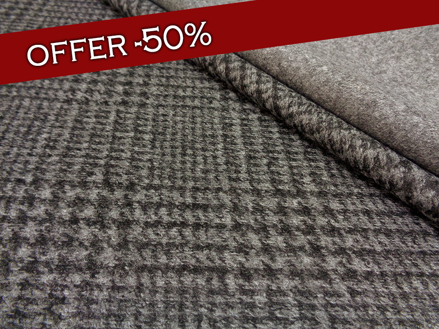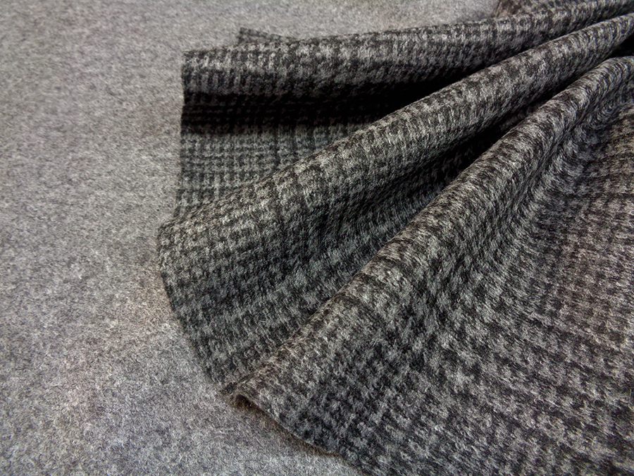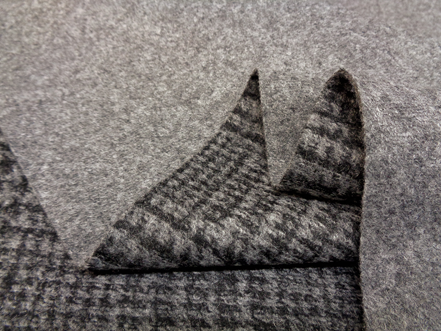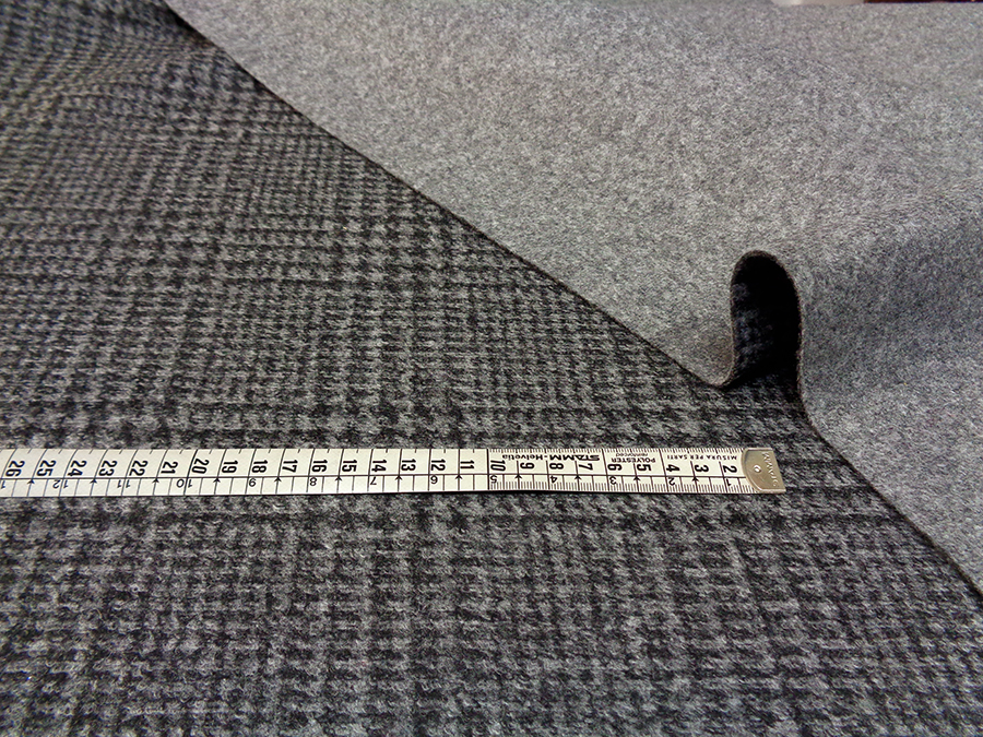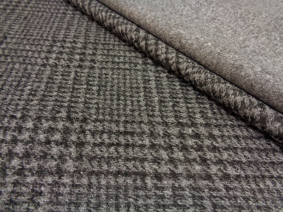 ESCLUSIVO TESSUTO IN JERSEY TECNICO DOUBLEFACE APRIBILE. COMPATTO, CORPOSO, RASATO E LEGGERMENTE RIGIDO. DA UN LATO CON GRANDE PRINCIPE DI GALLES SUI TONI DEL GRIGIO, E DALL’ALTRO LATO GRIGIO MEDIO MELLANGE. I DUE LATI DEL TESSUTO SONO ADESIVATI L’UNO ALL’ALTRO (NO CUCITI). LA PARTICOLARE LAVORAZIONE MANTIENE L’ELASTICITA’ DEL TESSUTO UNITO ALL’ EFFETTO TECNICO E SPORTIVO. POSSIBILITA’ DI LAVORAZIONE DA AMBO I LATI. TESSUTO UNISEX INDICATO PER: CAPPOTTI, GIACCONI E MONTGOMERY.