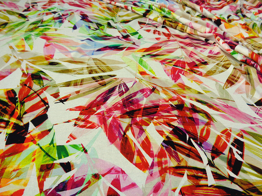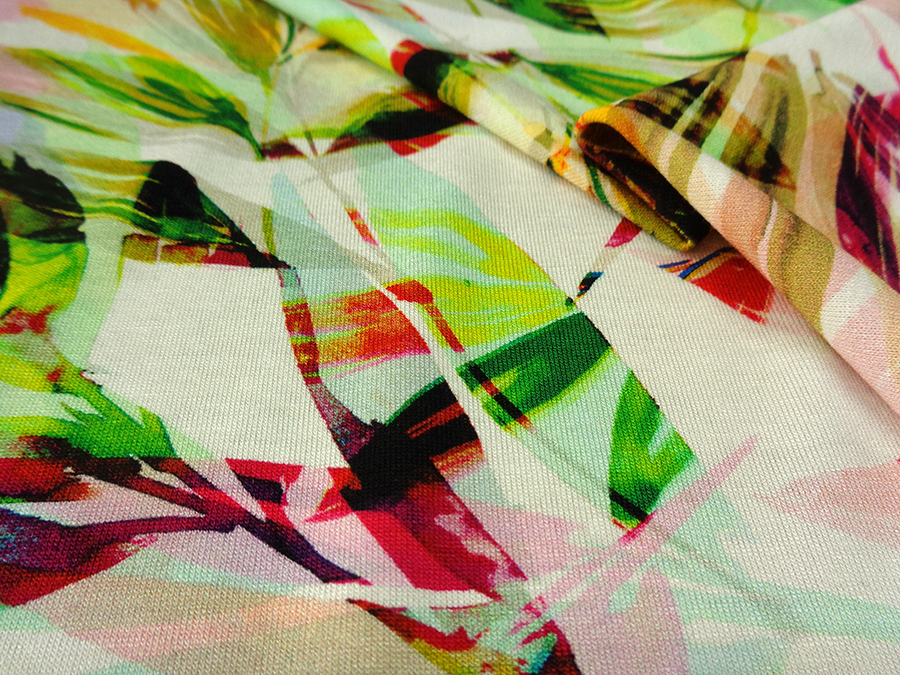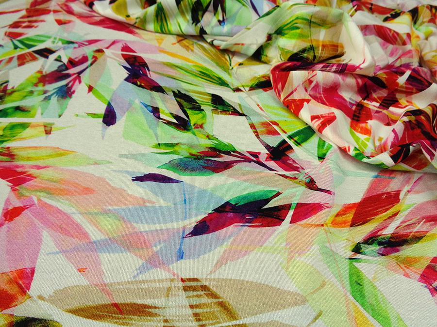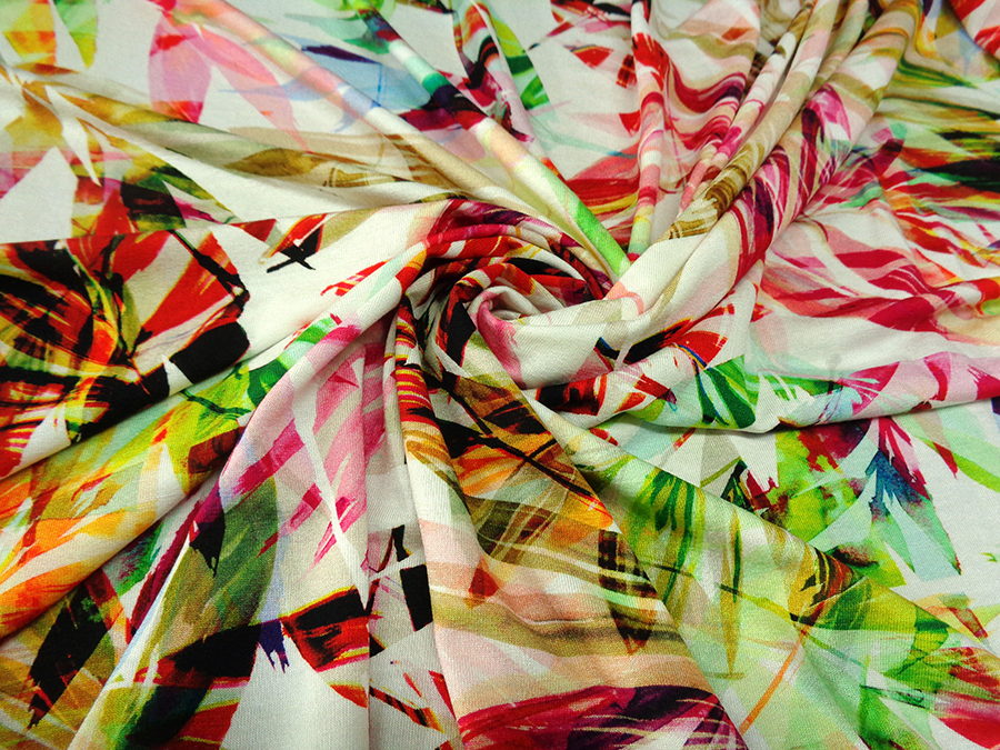 MORBIDO, CONFORTEVOLE ED OPACO JERSEY IN VISCOSA STAMPATO CON FANTASIA MULTICOLOR FLOREALE STILIZZATA. INDICATO PER: ABITI, GONNE, TUTE, BLUSE, TOP, ECC..