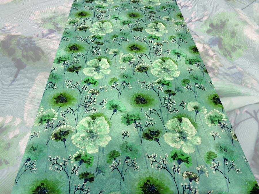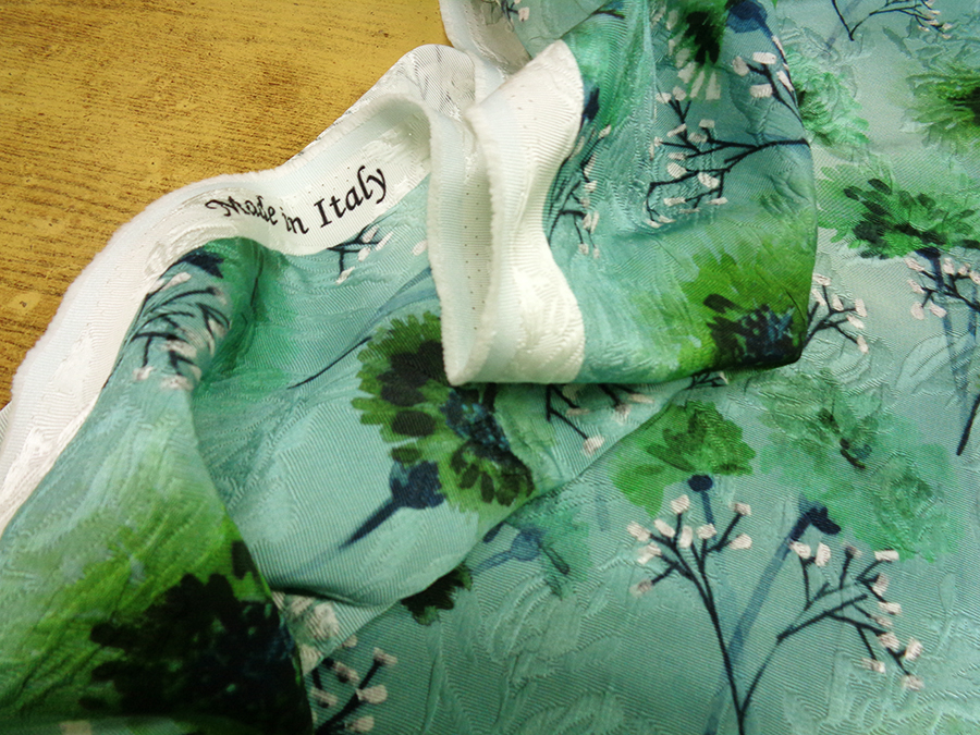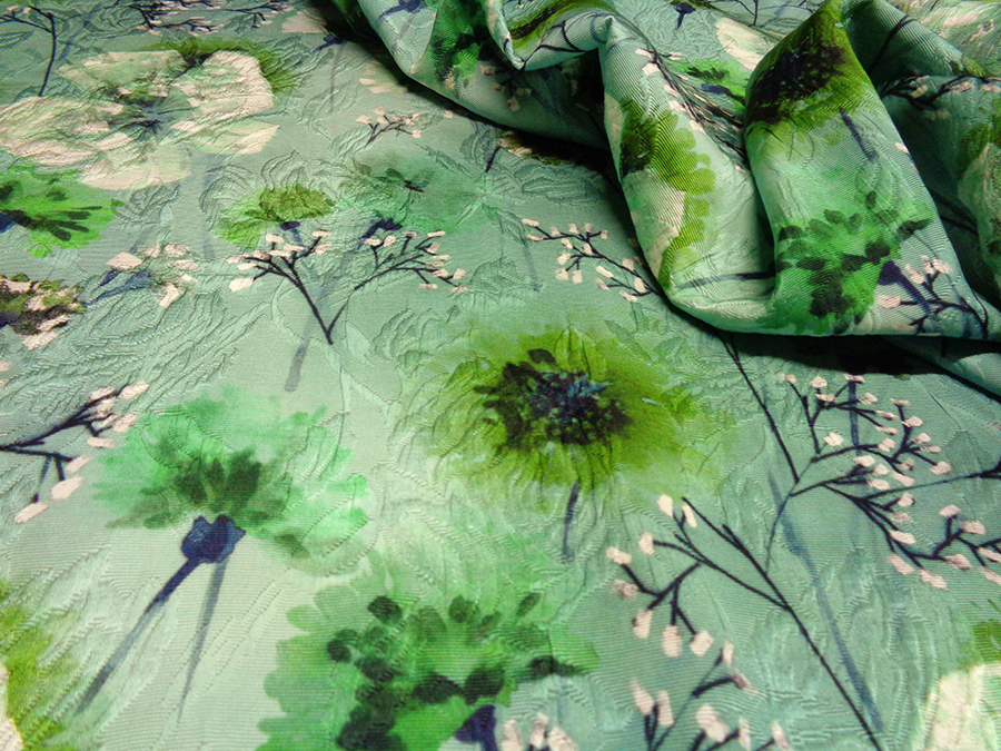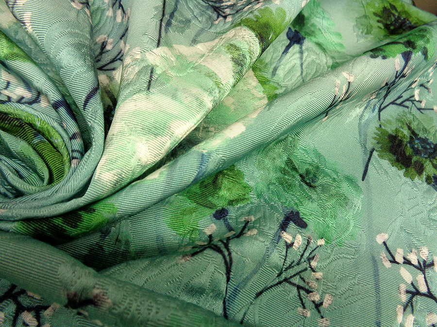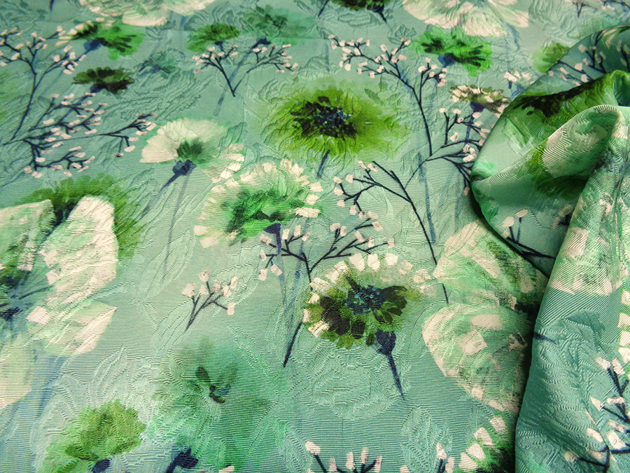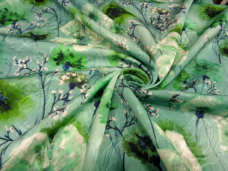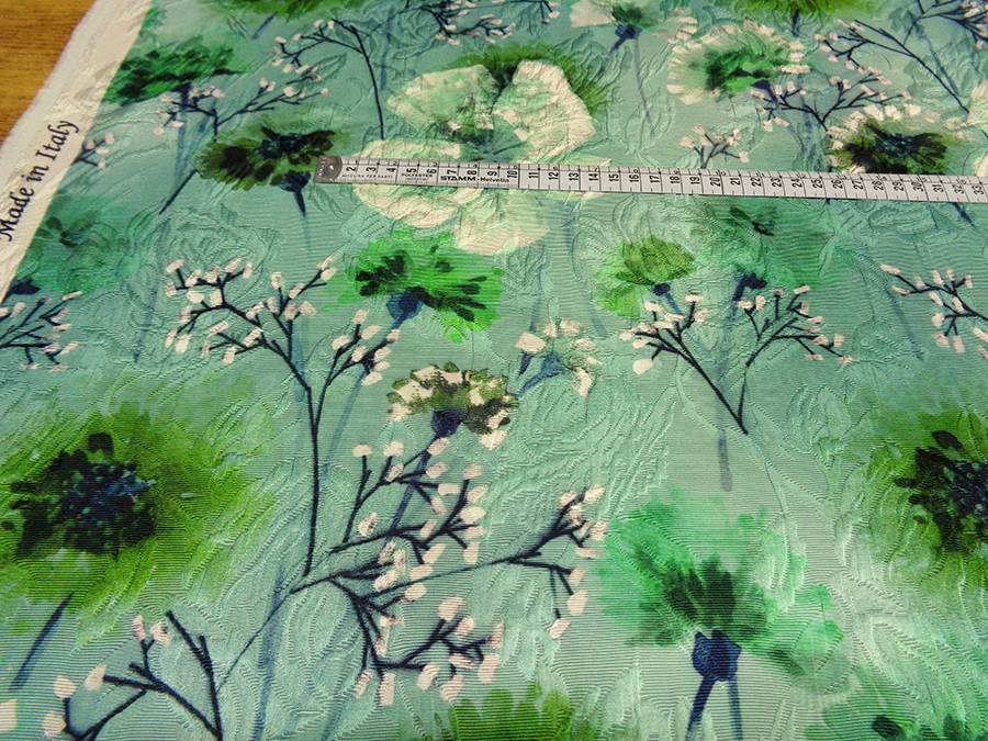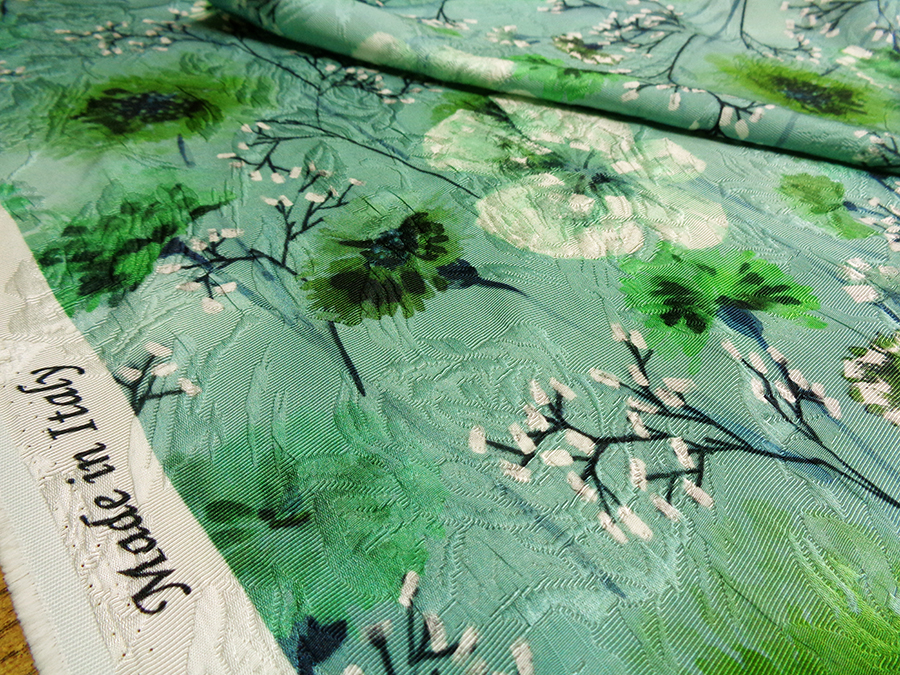 PREGIATO ED ESCLUSIVO BROCCATO IN COTONE E SETA, PESO MEDIO, CORPOSO E CONSISTETE. FONDO VERDE ACQUA CON PARTICOLARE LAVORAZIONE JAQUARD LUCIDA / OPACA TINTA SU TINTA E FANTASIA SUI TONI DEL VERDE, BIANCO E BLU. INDICATO PER: GIACCHE, GONNE, ABITI, COMPLETI, ECC..