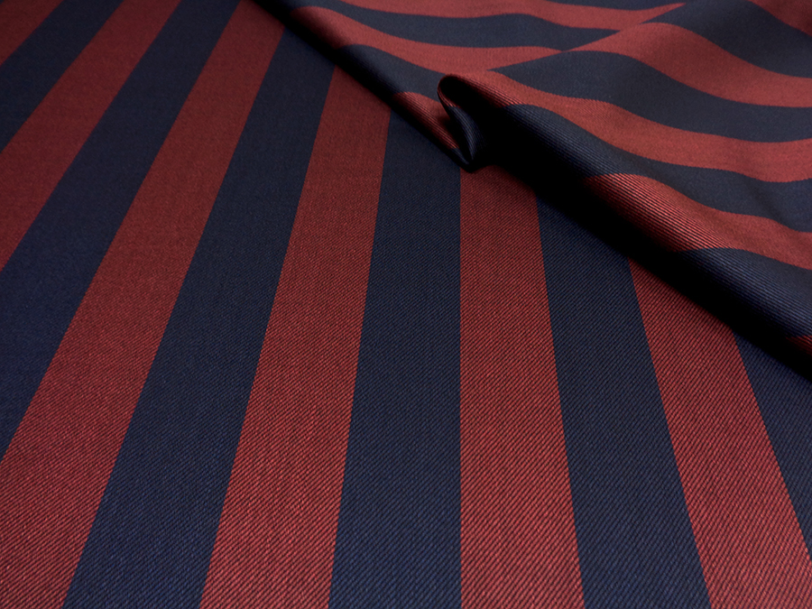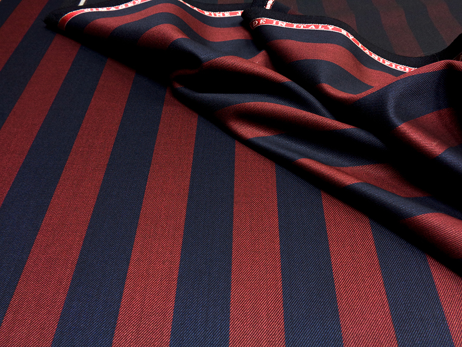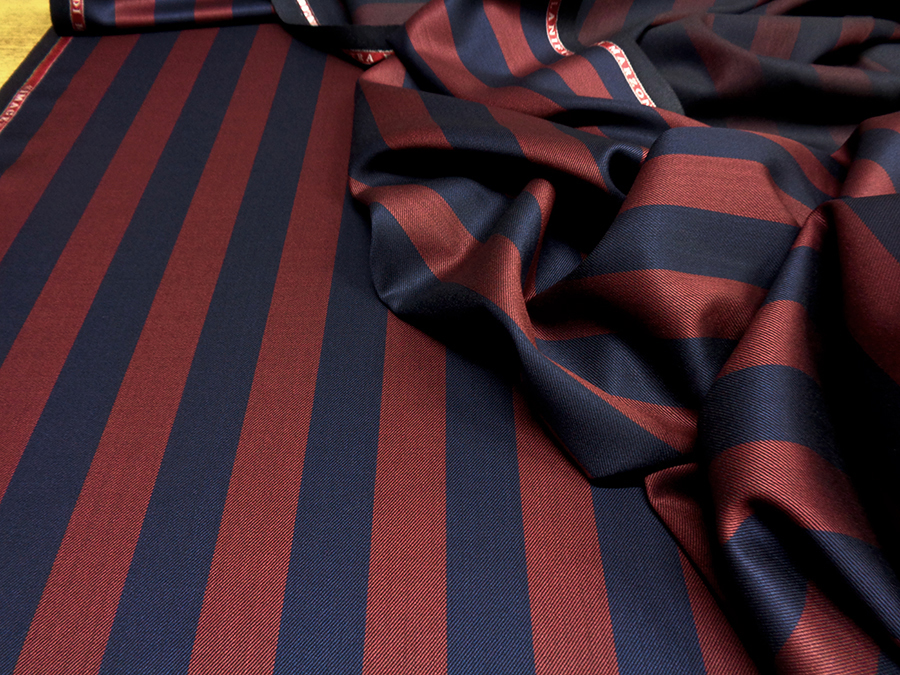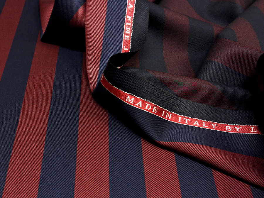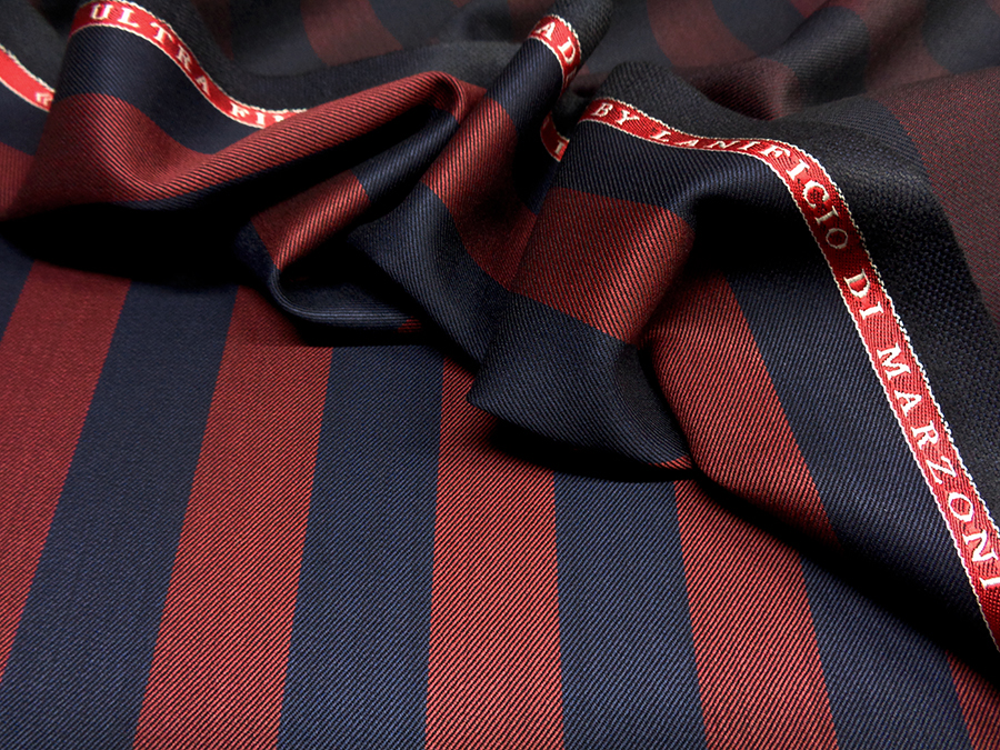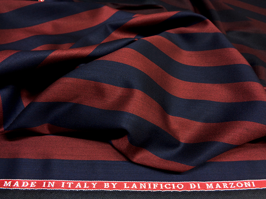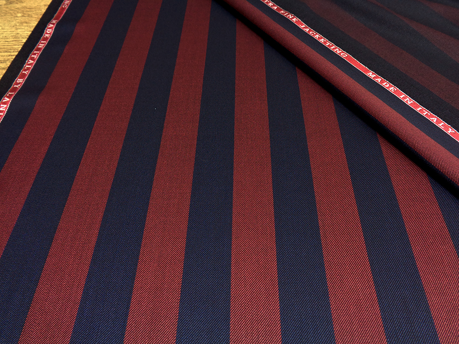 CIMOSSATO  ‘’ULTRA FINE JACKETING MADE IN ITALY BY LANIFICIO MARZONI’ (STOCK. NO CORREDATO DA ETICHETTE). ESCLUSIVO E PREGIATISSIMO TESSUTO IN LANA TASMANIA ULTRAFINE. LEGGERISSIMA, SETOSA, FRESCA, SCATTANTE E LEGGERMENTE LUMINOSA. PARTICOLARE FANTASIA A GRANDI RIGHE DI 2,5 CM BORDEAUX E 3 CM LE BLU. UN PERFETTO MIX DI LEGGEREZZA E SETOSITA’, CON LEGGERA ELASTICIZZAZIONE NATURALE SENZA L’AGGIUNTA DI ELASTAME. ANTI PIEGA E TRASPIRANTE LA LEGGEREZZA DEL TESSUTO LO RENDE IDEALE PER LA STAGIONE PRIMAVERA ESTATE MA IDONEA ANCHE PER LE 4 STAGIONI. INDICATA PER GIACCHE, ABITI, PANTALONI, ECC..