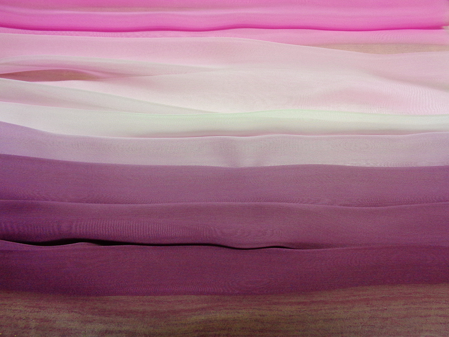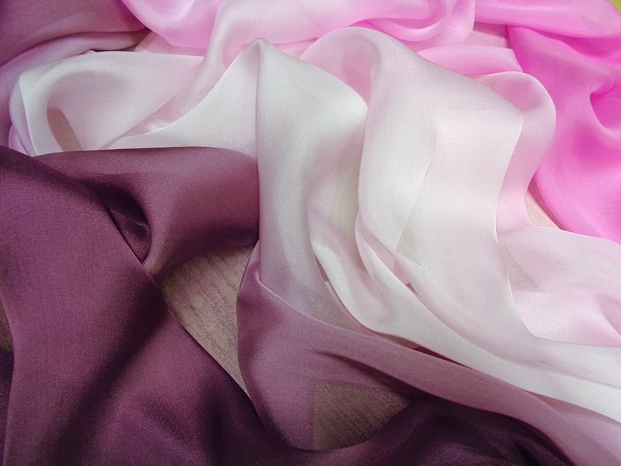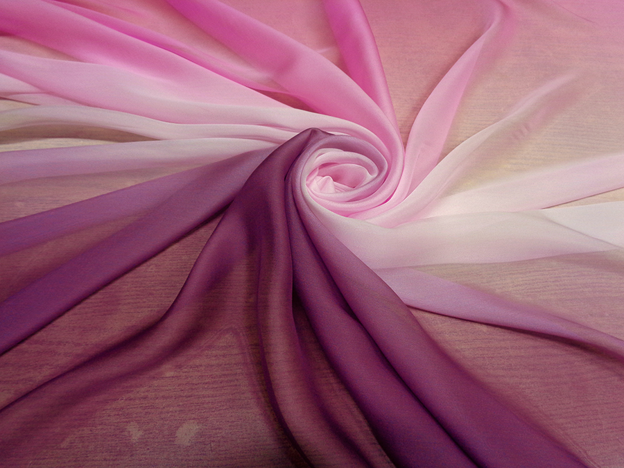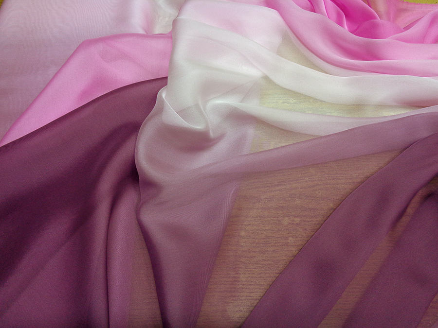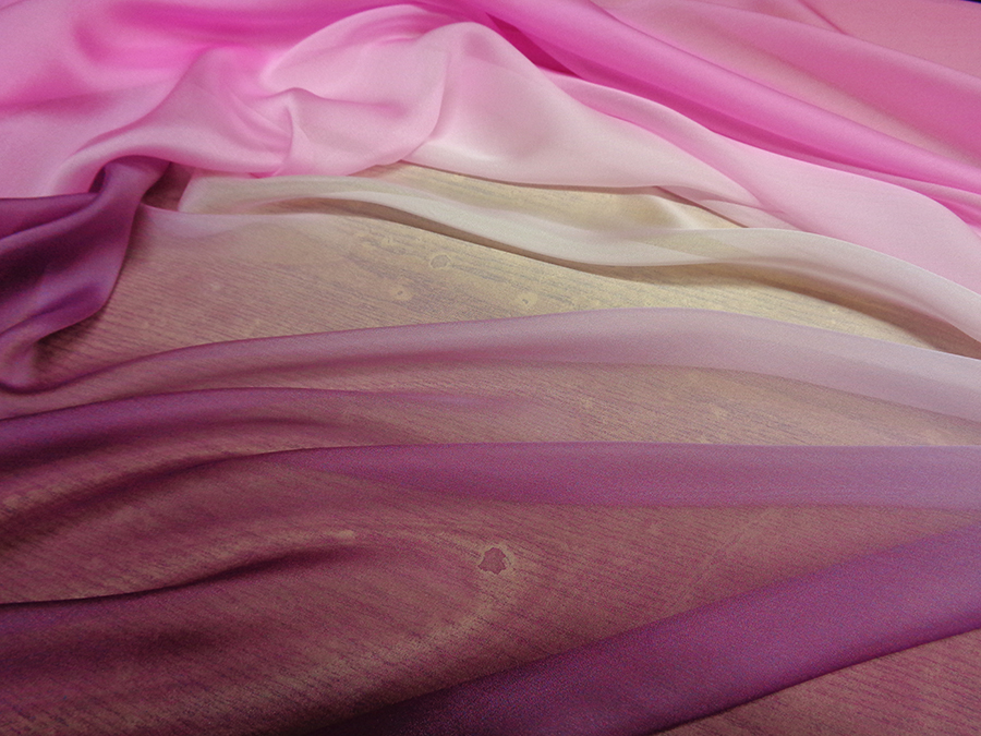 PREGIATO, CHIFFON IN SETA PURA SFUMATO DA CIMOSA A CIMOSA DAL COLOR MALVA AL COLOR  CICLAMINO CON UN INTERMEZZO CHIARISSIMO TRA I DUE COLORI VELATO ED IMPALPABILE CON FINITURA LUMINOSA A CHARMEAUSE. INDICATO PER: ABITI ELEGANTI, BLUSE, ABITI DA SPOSA, ECC..