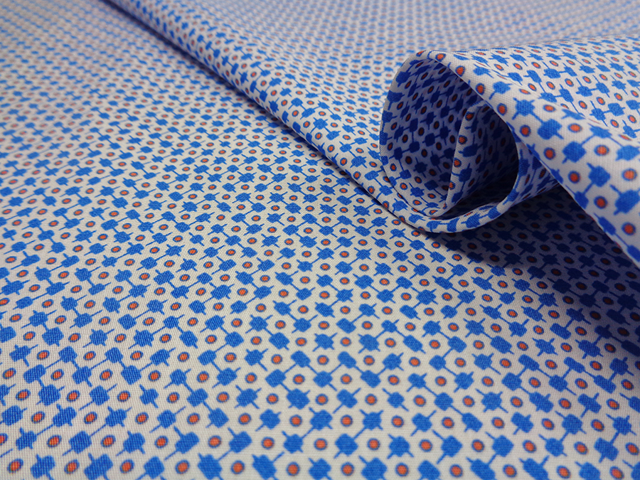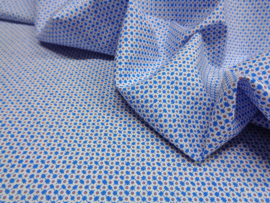 PREGIATO POPELINE DI PURO COTONE SETIFICATO DOPPIO RITORTO. LEGGERO, MORBIDO E SETOSO, FONDO BIANCO CON PICCOLO DISEGNO CRAVATTA AZURRO. TESSUTO UNISEX INDICATO PER: CAMICIE, ABITI, CAMICIONI, GONNE, ECC..