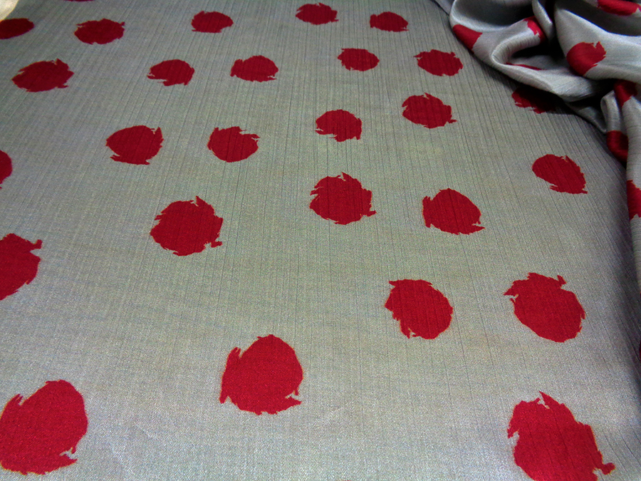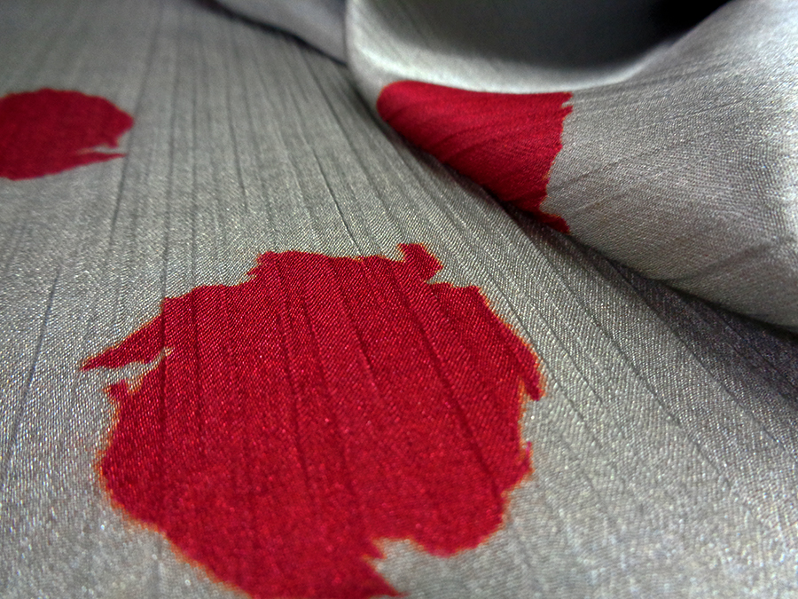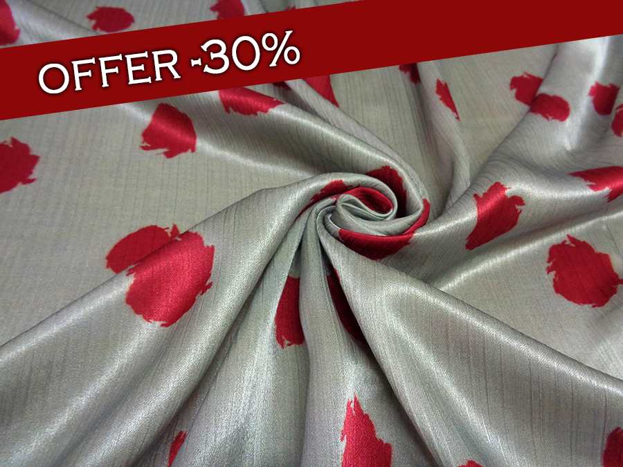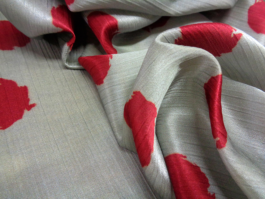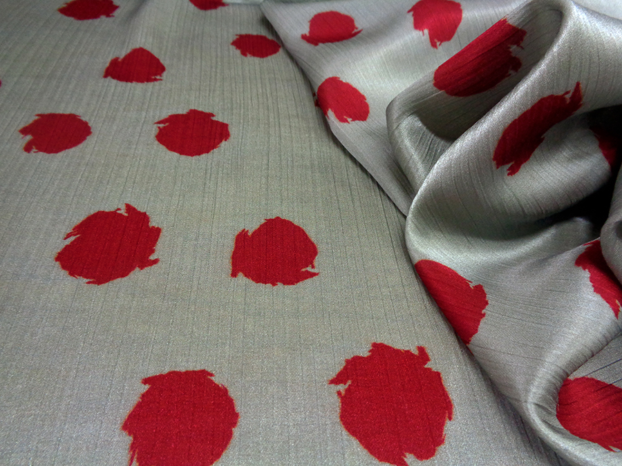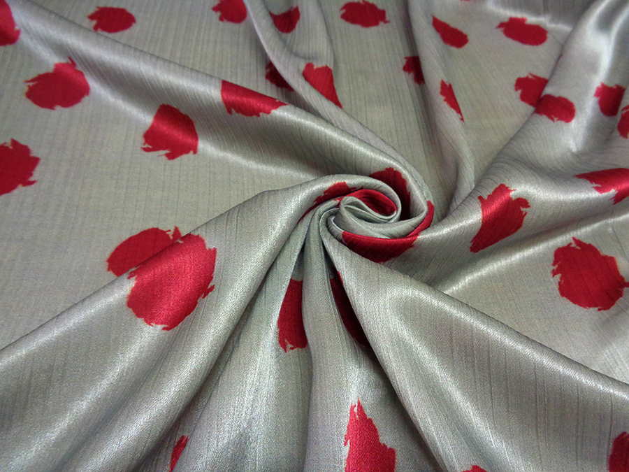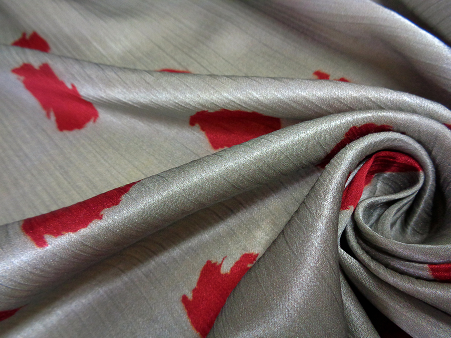 PREGIATO TESSUTO IN SATIN CRESPO DI SETA PURA ALTA MODA. FONDO GRIGIO MEDIO CON MACCHIE STILIZZATE COLORE BORDEAUX BRILLANTE. MORBIDO, SETOSO E COPRENTE CON LEGGERA ED IMPERCETTIBILE TRAMA CRESPA. INDICATO PER: ABITI, GONNE, BLUSE, CAFTANI, PIGIAMA PALAZZO, ECC..