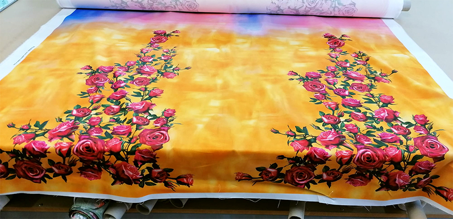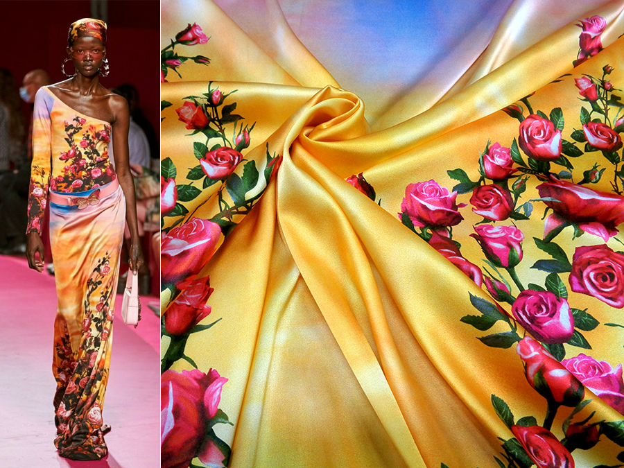 ESCLUSIVO TESSUTO IN RASO SATIN DI SETA ELASTICIZZATA CON FANTASIA ALTA MODA. MORBIDISSIMO, LUMINOSO, COPRENTE ED ELASTICIZZATO IN LARGHEZZA. FONDO SFUMATO IN DEGRADE’ SUI TONI DEL BLUETTE, ROSA E GIALLO E FANTASIA A ROSE SUI TONI DEL FRAGOLA (TRA IL ROSSO ED IL FUCSIA) OGNI PANNELLO E’ COMPOSTO DA 2 RAMAGE FLOREALI. TESSUTO ESCLUSIVO AD ESAURIMENTO SCORTE. INDICATO PER: ABITI, CASACCHE, GONNE, PIGIAMA PALAZZO, CAFTANI, ECC..