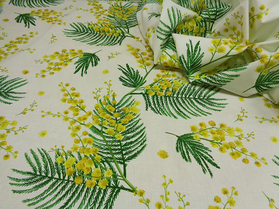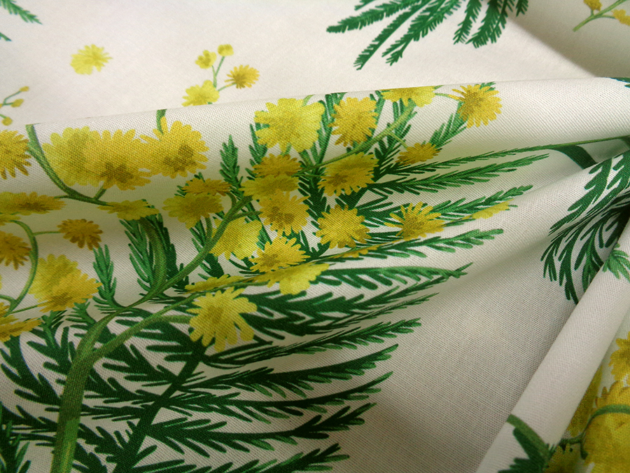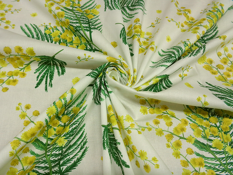 ESCLUSIVO E PREGIATO TESSUTO IN POPELINE DI COTONE LEGGERMENTE ELASTICO IN LARGHEZZA. MORBIDO, LEGGERO, FRESCO, SETOSO, COPRENTE ED OPACO. FONDO BIANCO CON MIMOSE GIALLE E FOGLIE VERDI. INDICATO PER: ABITI, BLUSE, GONNE, ECC..