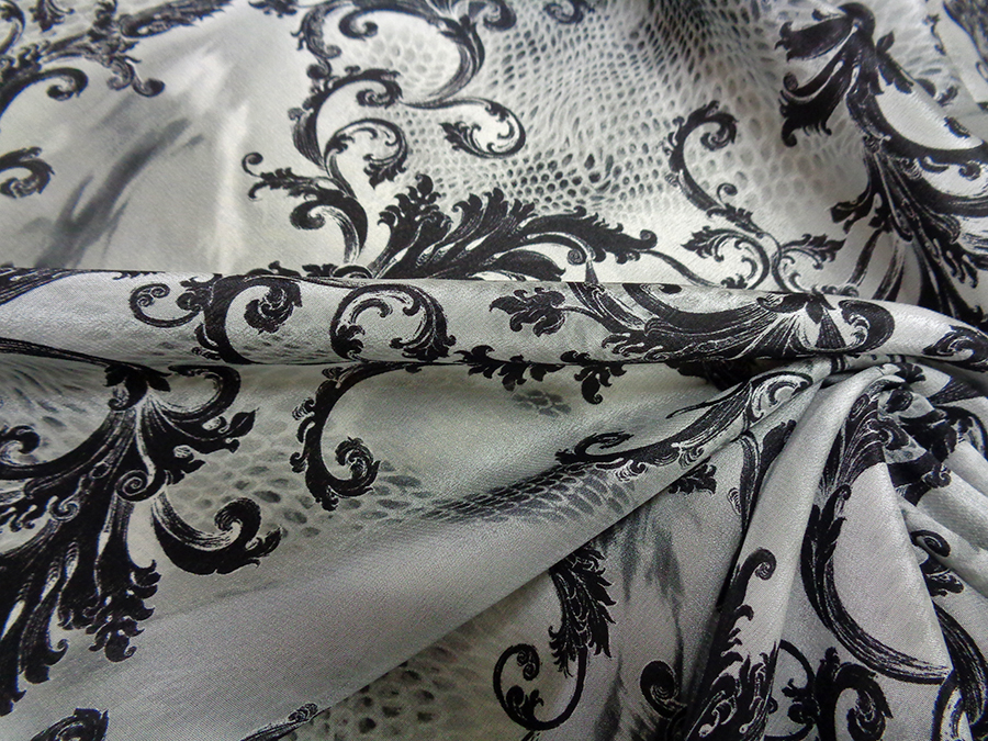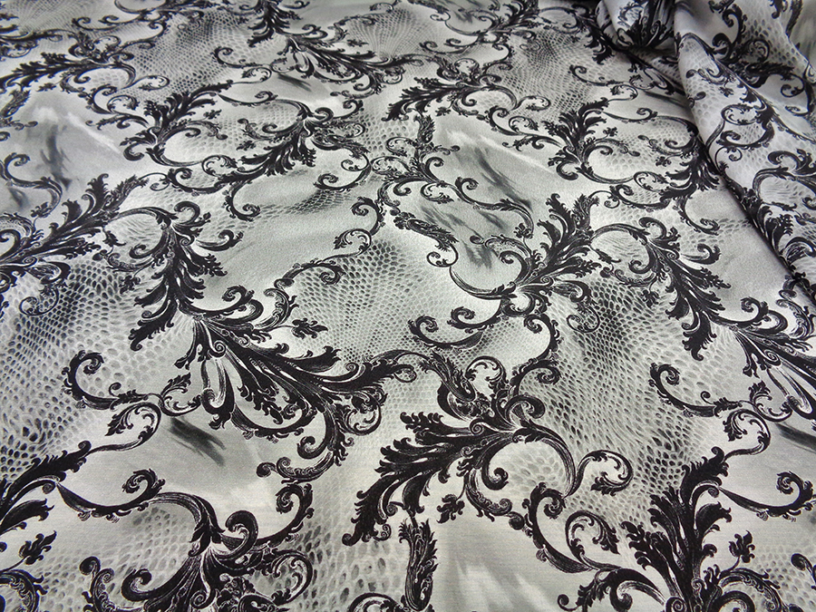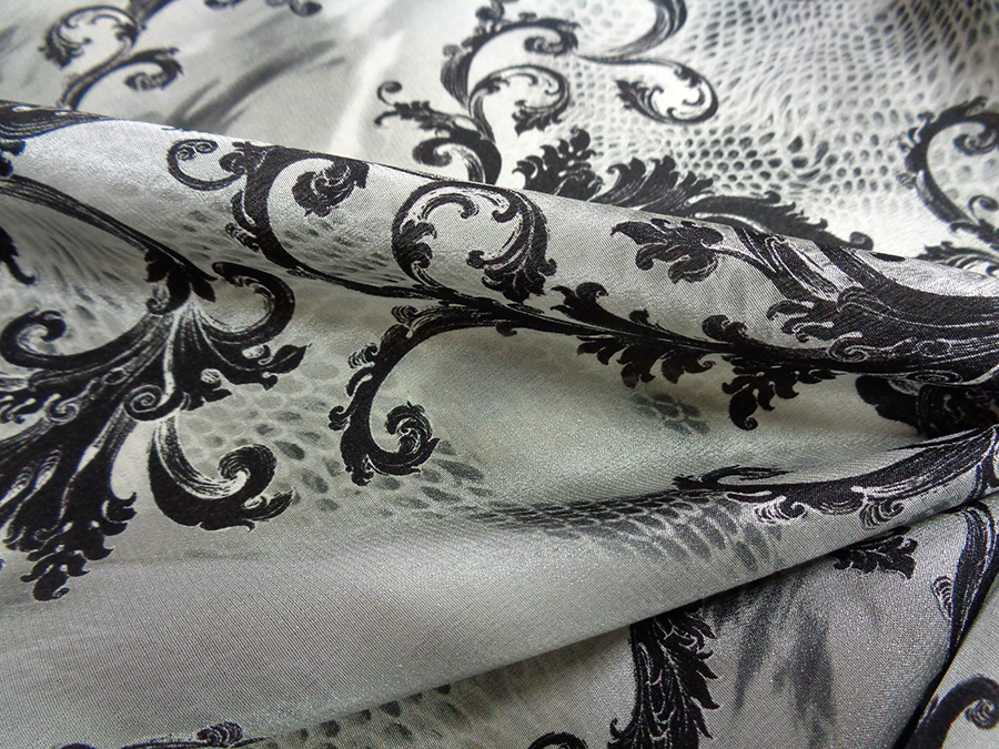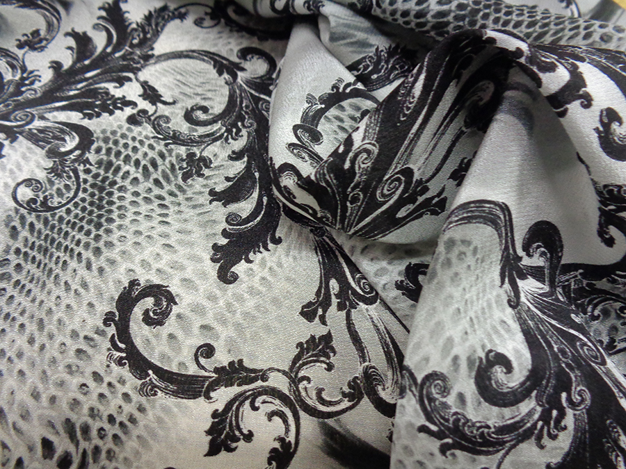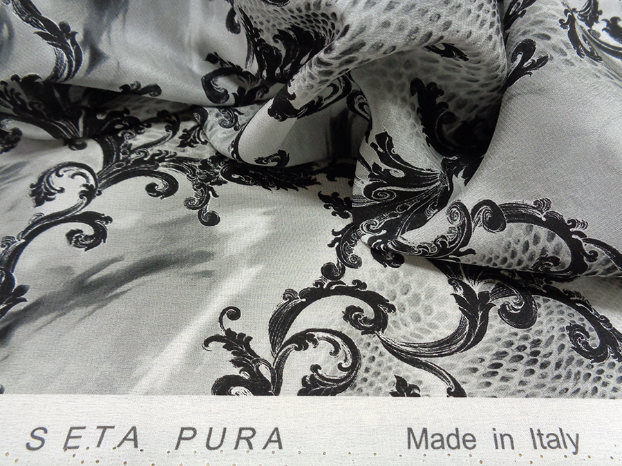 PREGIATO ED ESCLUSIVO TESSUTO IN CREPE DE CHINE DI SETA PURA ALTA MODA, LEGGERO, MORBIDO, SETOSO, OPACO E COPRENTE. FANTASIA SFUMATA SUI TONI DEL  GRIGIO E RAMAGE NERO. INDICATO PER: CAMICIE, ABITI, GONNE, BLUSE, CAFTANI, PIGIAMA PALAZZO, ECC..