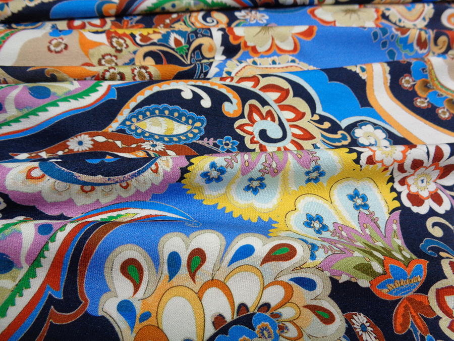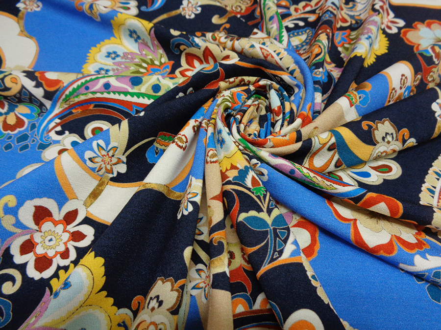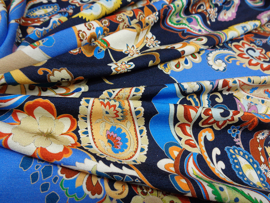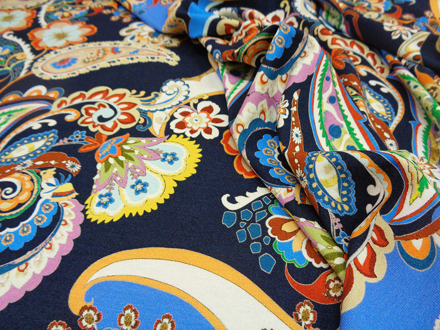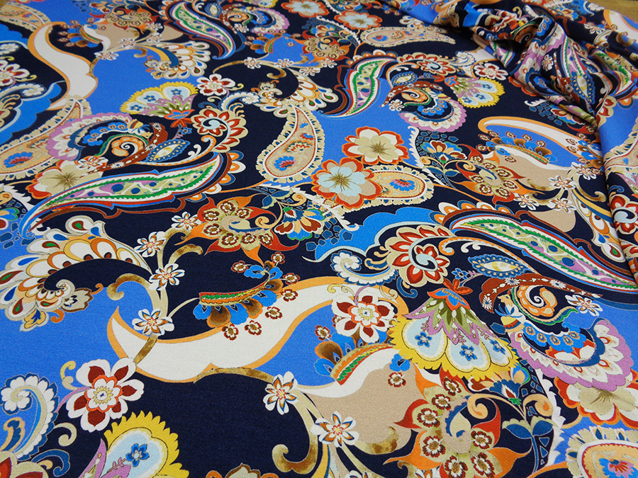 MORBIDO, CONFORTEVOLE ED OPACO JERSEY IN VISCOSA STAMPATO, FONDO BLU CON DISEGNI CASHMERE E FIORI SUI TONI DELL’AZZURRO INDACO, ARANCIO, LILLA, VERDE, ECC. INDICATO PER: ABITI, GONNE, TUTE, BLUSE, TOP, PANTALONI, PIGIAMA PALAZZO ECC..
