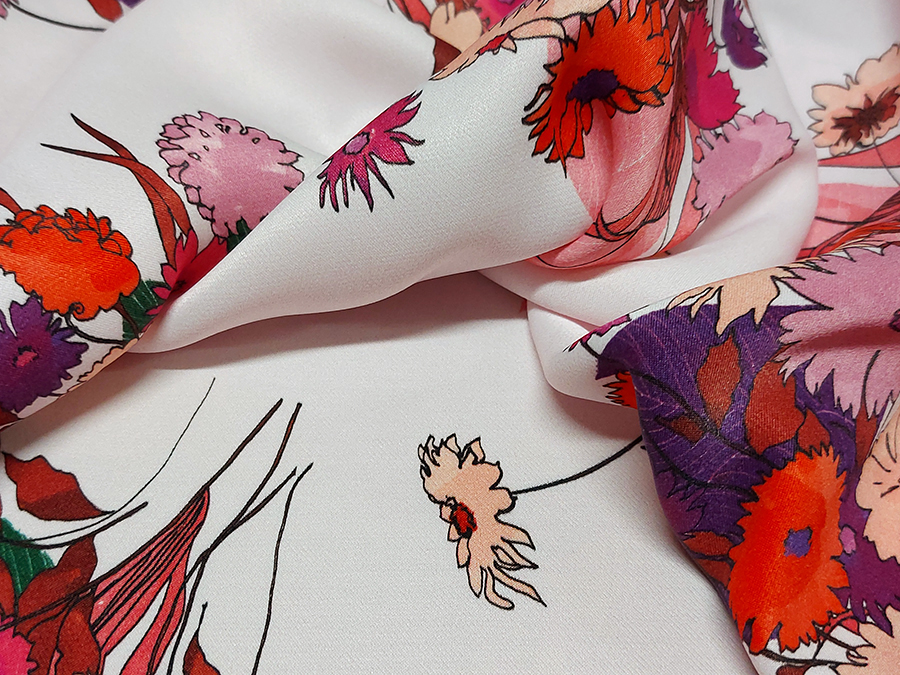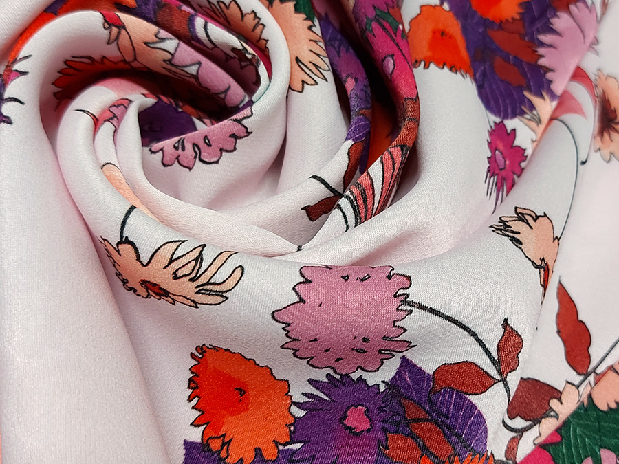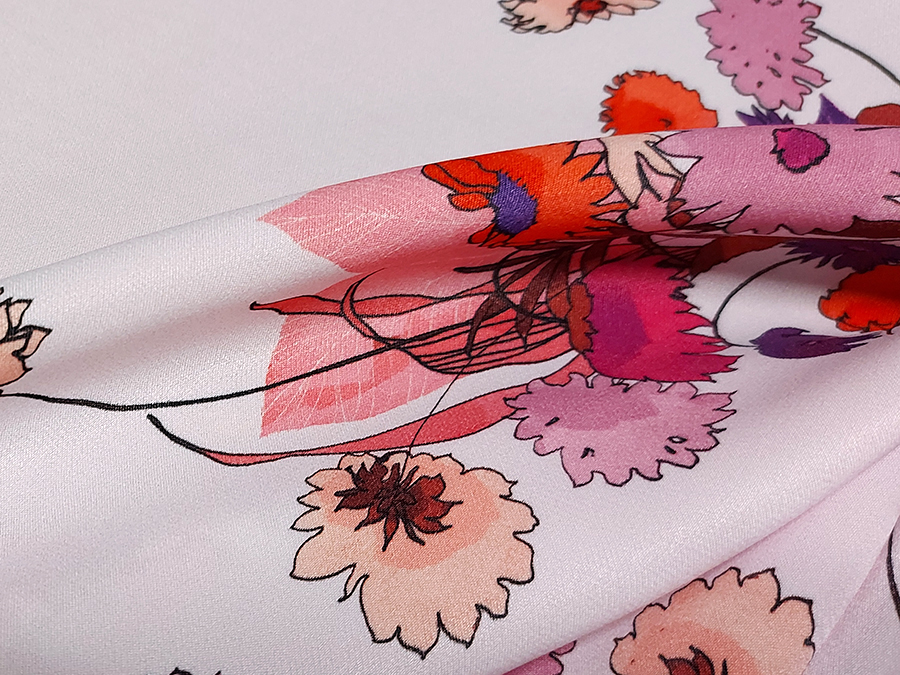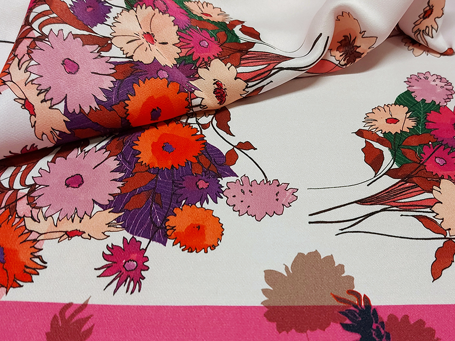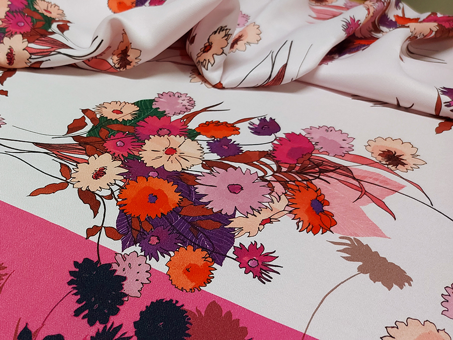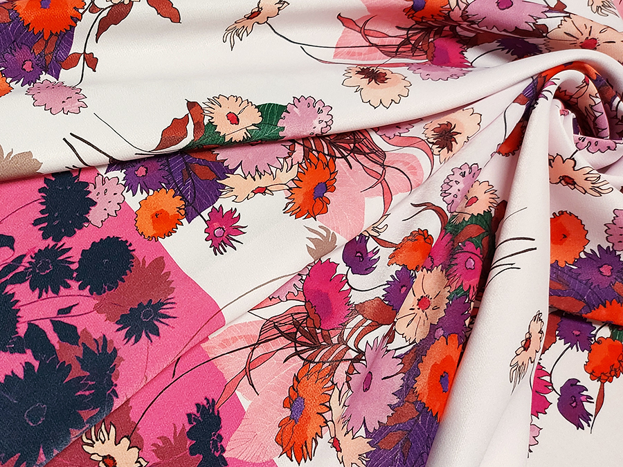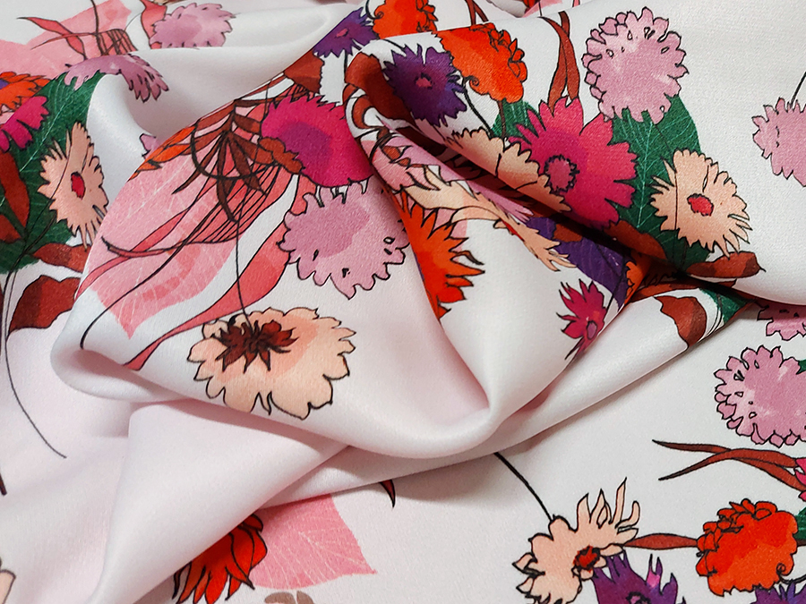 PREGIATO ED ESCLUSIVO PANNELLO  CADY STAMPATO . MORBIDO, CORPOSO, CADENTE E COPRENTE. FONDO ROSA CIPRIA CHIARISSIMO CON FANTASIA FLOREALE SUI TONI DEL FUCSIA, CICLAMINO, ROSA ANTICO E VIOLA.. INDICATO PER: TOP, CANOTTA, GONNA