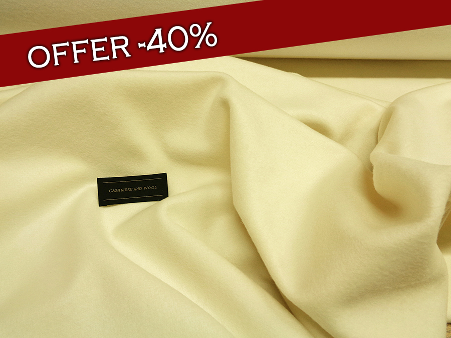 PREZIOSO ED ESCLUSIVO TESSUTO IN CASHMERE E LANA DOUBLE FACE APRIBILE, COMPATTO, PESANTE, CORPOSO, RASATO E LEGGERMENTE LUMINOSO COLORE AVORIO CHIARO DA AMBO I LATI. INDICATO PER: CAPPOTTI, MANTELLE, ACCOPPIATI CON PELLICCE, ACCOPPIATI CON CAPI IN PELLE, COPERTE, PLAIDS, CAPPELLI, ECC..