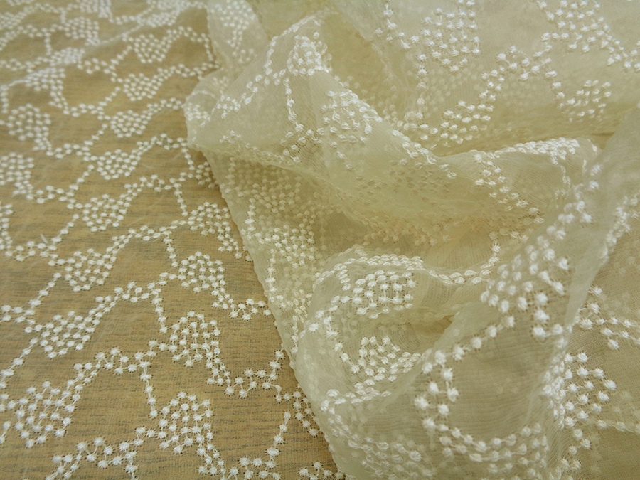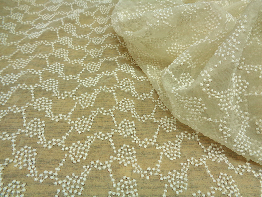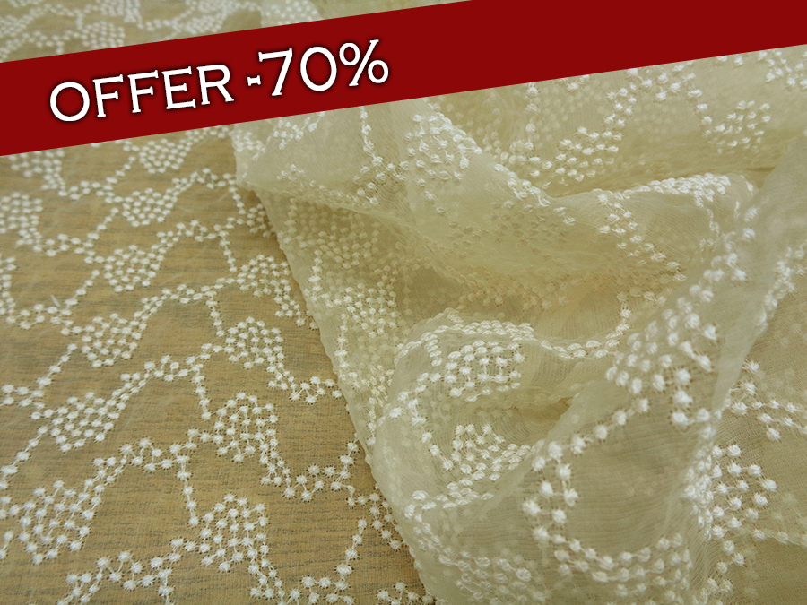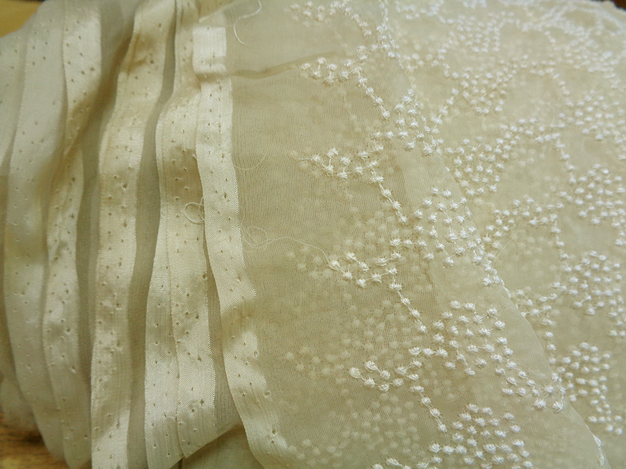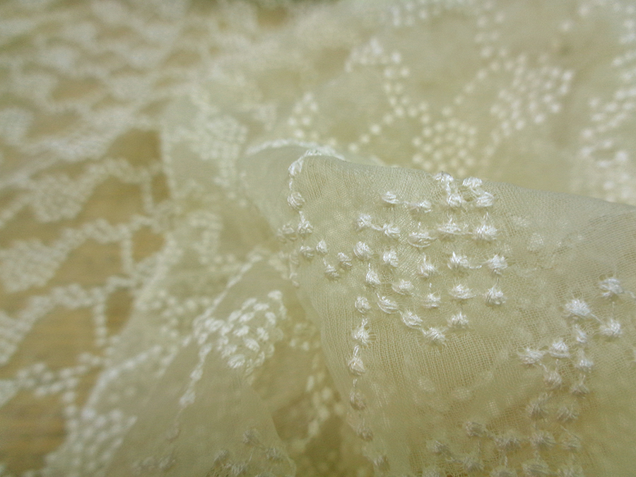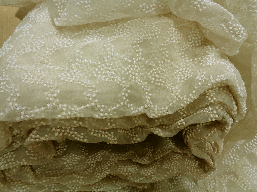 AUTENTICO VINTAGE ANNI 70. PREGIATA ORGANZA IN SETA, LEGGERISSIMA CON PICCOLI RICAMI EFFETTO PERLINE. COLORE AVORIO. INDICATA PER: ABBIGLIAMENTO,ARREDAMENTO.