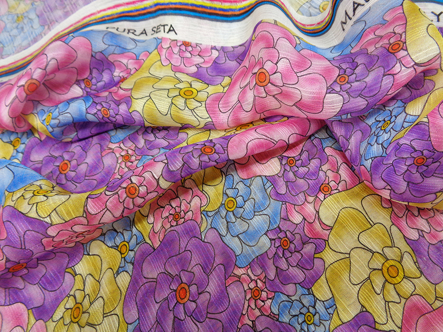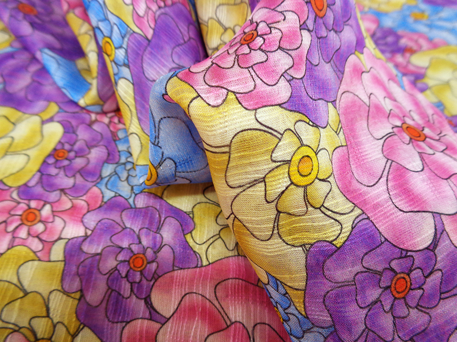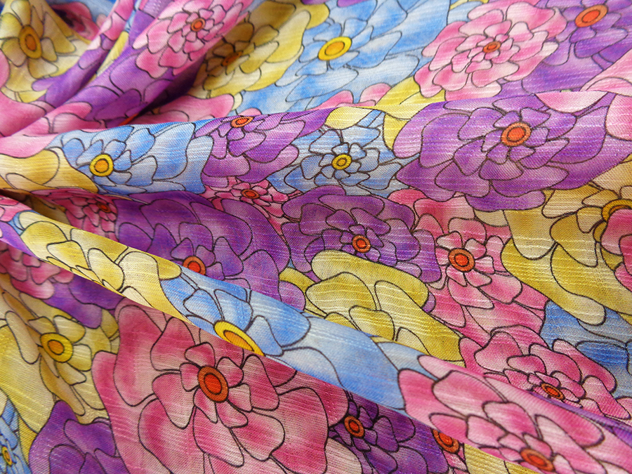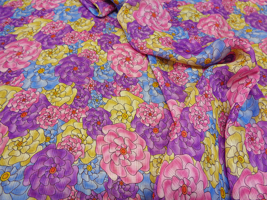 ESCLUSIVO TESSUTO IN GEORGETTE DI SETA CON FANTASIA ALTA MODA. LEGGERISSIMA, MORBIDA E LEGGERMENTE TRASPARENTE E CON PARTICOLARE LAVORAZIONE A RIGHE LUMINOSE IN TRAMA. FANTASIA FLOREALE SUI TONI DEL ROSA INTENSO, VIOLA, AZZURRO E GIALLO. TESSUTO ESCLUSIVO AD ESAURIMENTO SCORTE. INDICATO PER: ABITI, CASACCHE, GONNE, PIGIAMA PALAZZO, CAFTANI, ECC..