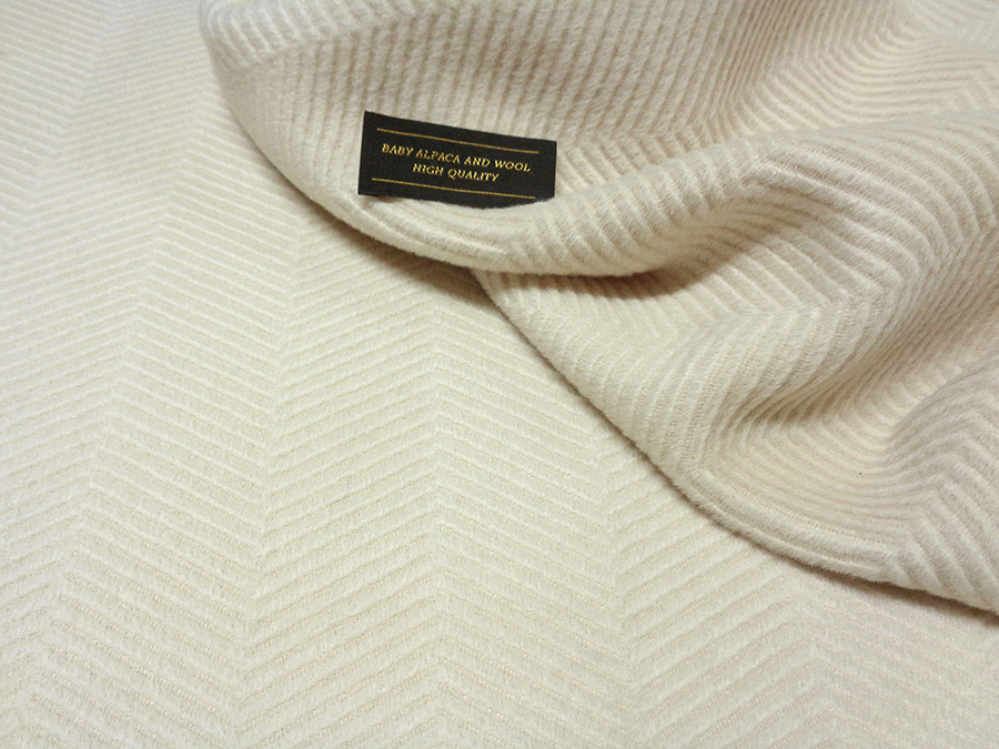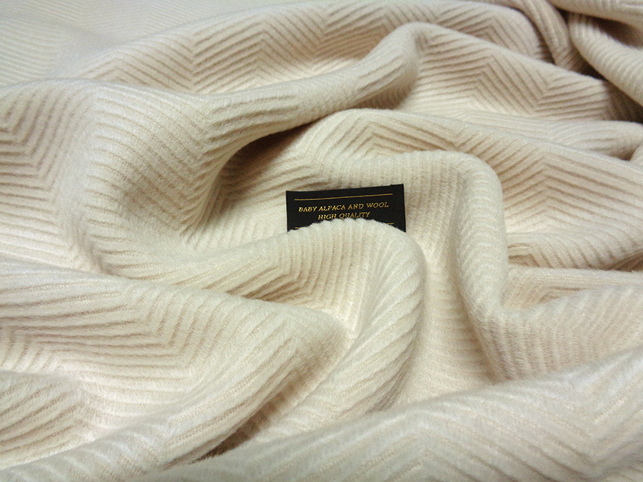ESCLUSIVO E PREGIATO TESSUTO IN BABY ALPACA E LANA SOFFICE, MORBIDISSIMO, SETOSO E CALDO. COLORE BEIGE LEGGERMENTE CIPRIATO CON PARTICOLARE LAVORAZIONE A SPINA DI PESCE IN RILIEVO OTTENUTA DALLA LAVORAZIONE EPILATA DEL FILATO IN BABY ALPACA. IL FILATO IN BABY ALPACA  E’ OTTENUTO DALL’UNICA TOSA DEI CUCCIOLI DI ALPACA ENTRO L’ANNO DI ETA’, E CONFERISCE UNA MORBIDEZZA E SETOSITA’ INCOMPARABILI. TESSUTO UNISEX INDICATO PER: CAPPOTTI, GIACCONI, CAPPOTTI A VESTAGLIA, MANTELLE, COPERTE, ECC..