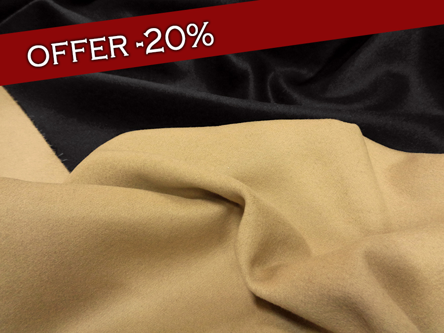 PREGIATO TESSUTO DOUBLE FACE APRIBILE, COMPATTO, MORBIDO, SETOSO, RASATO E LEGGERMENTE LUMINOSO, COLORE CAMMELLO DA UN LATO E NERO DALL’ALTRO LATO.  POSSIBILITA’ DI UTILIZZO DA AMBO I LATI. INDICATO PER: CAPPOTTI, MANTELLE, ACCOPPIATI CON PELLICCE, ACCOPPIATI CON CAPI IN PELLE, COPERTE, PLAIDS, CAPPELLI, ECC..