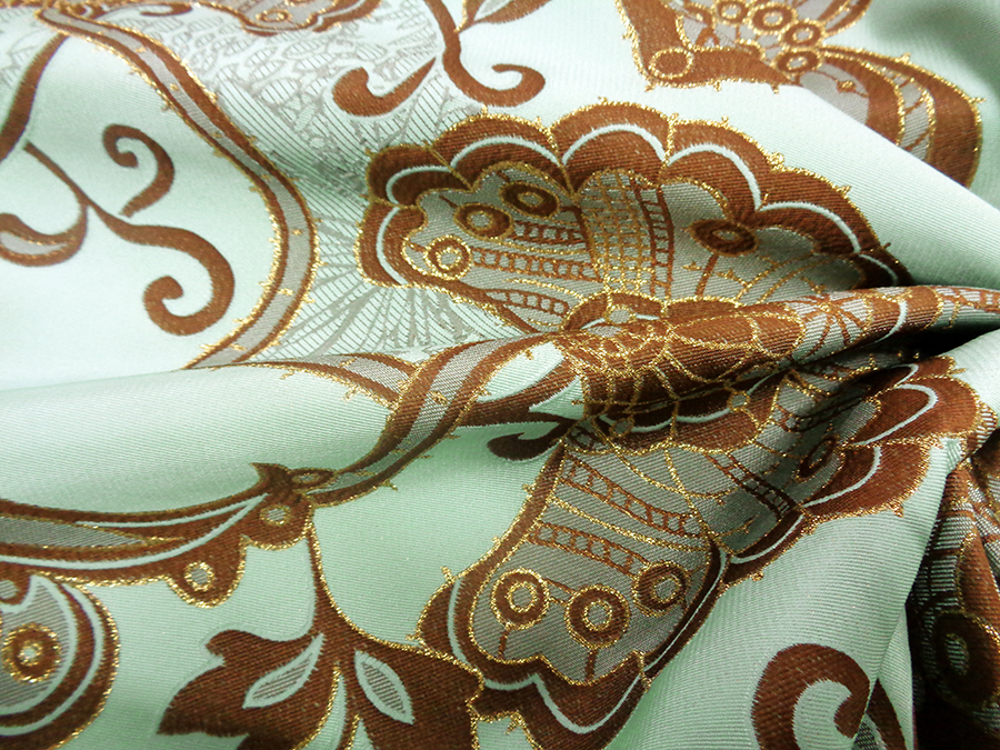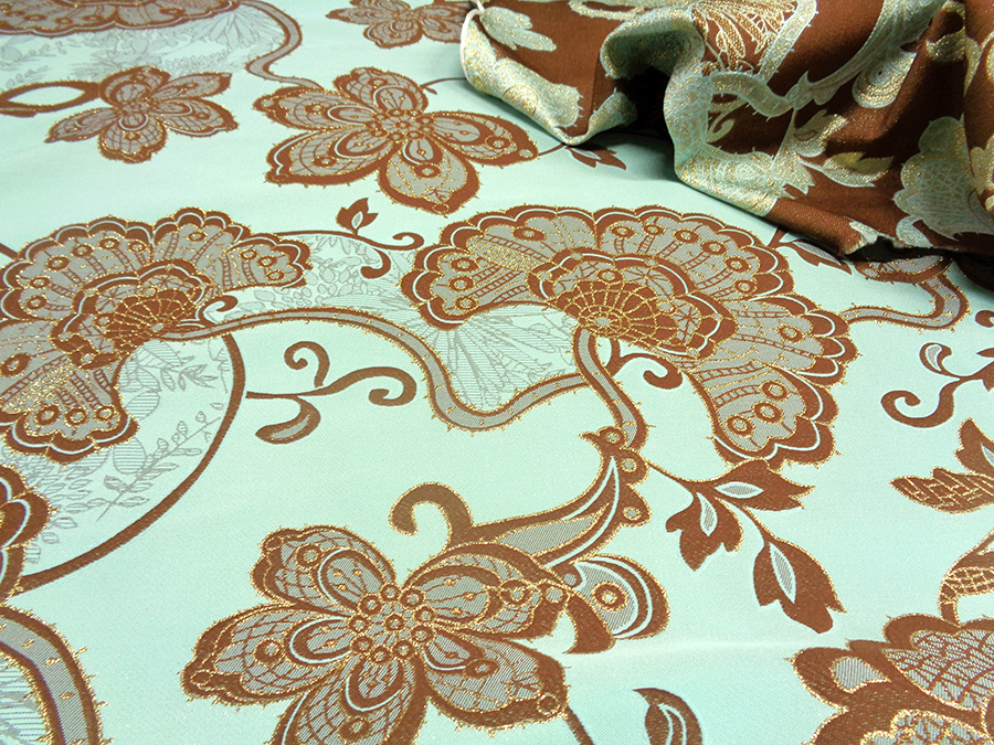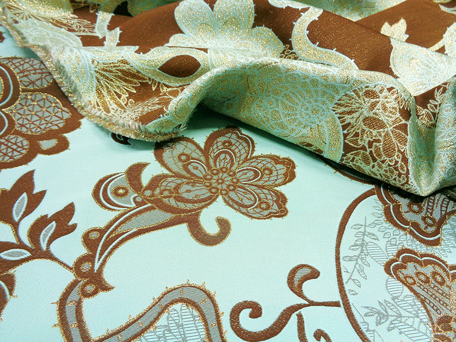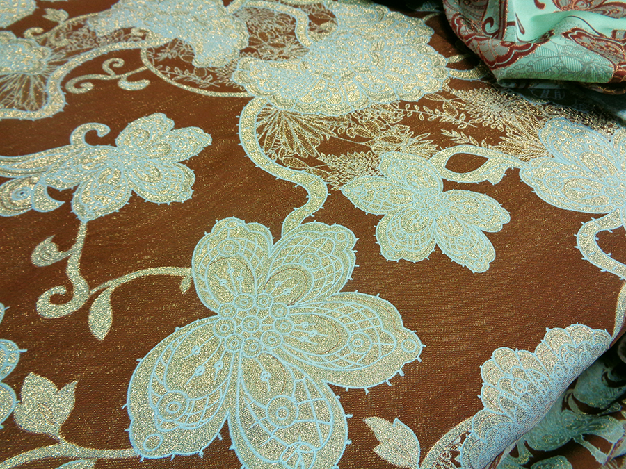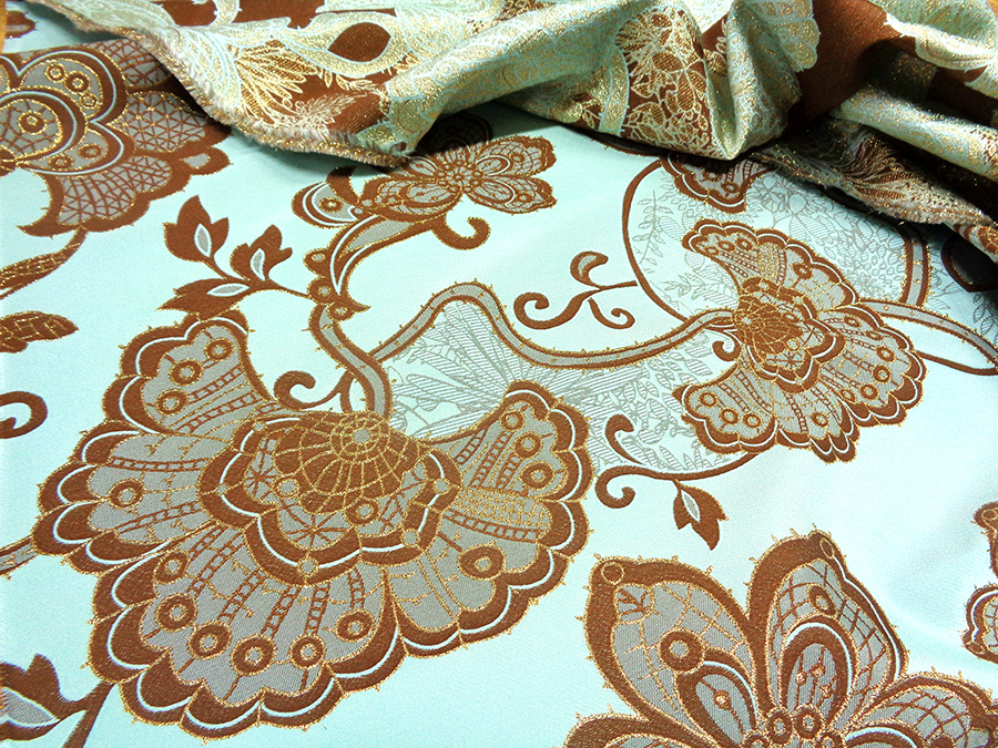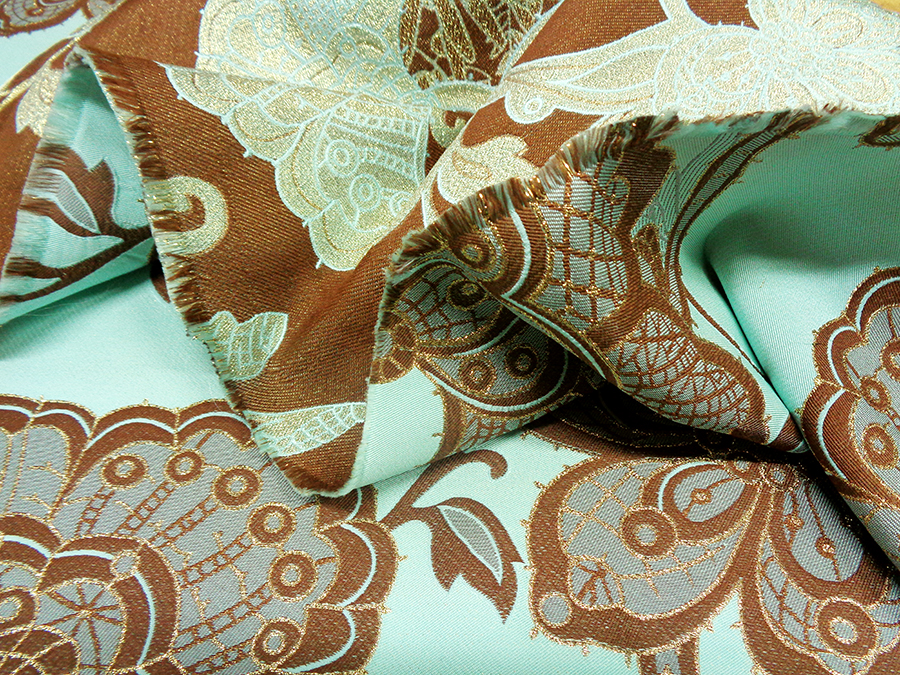 ESCLUSIVO E PREGIATO DAMASCATO IN SETA JAQUARD DOUBLEFACE ALTA MODA. CORPOSO, COMPATTO, SEMIRIGIDO. DA UN LATO FONDO TIFFANY CON GRANDI DISEGNI ORIENTALI MARRONI CON LUREX ORO EFFETTO RICAMO. DALL’ALTRO LATO FONDO MARRONE CON DISEGNI JAQUARD TIFFANY CON LUREX ORO EFFETTO RICAMO. POSSIBILITA’ DI UTILIZZO DA AMBO I LATI. TESSUTO UNISEX INDICATO PER: GIACCHE, CAPPOTTI, SOPRABITI  GONNE, ABITI, COMPLETI, PANTALONI,VESTAGLIE DA CAMERA  ECC..