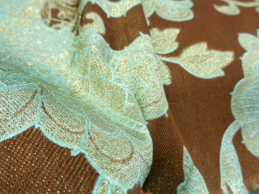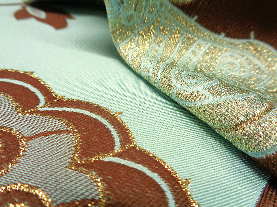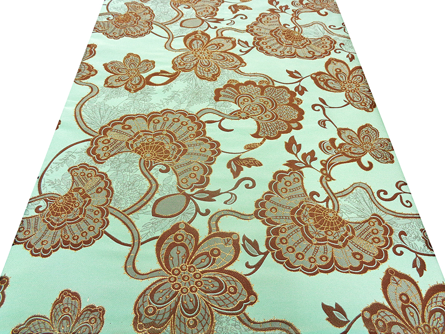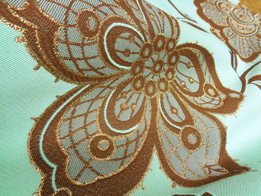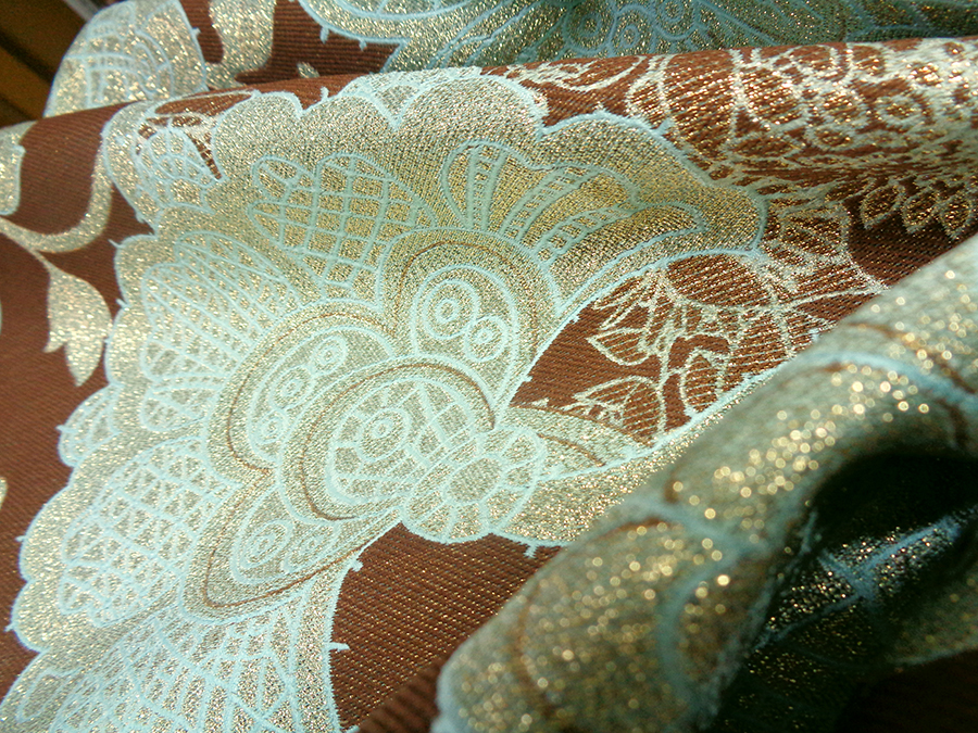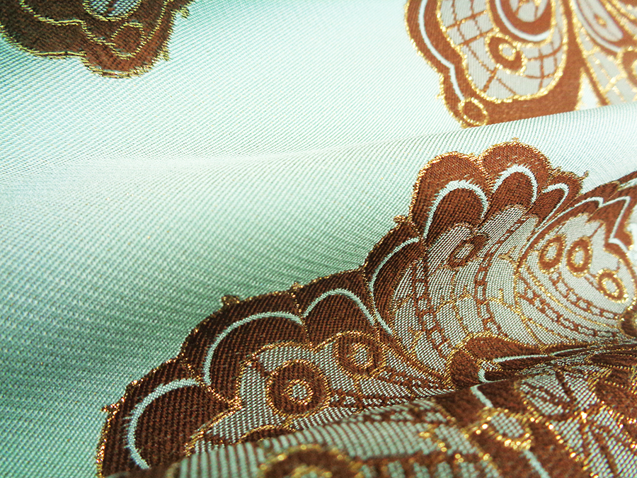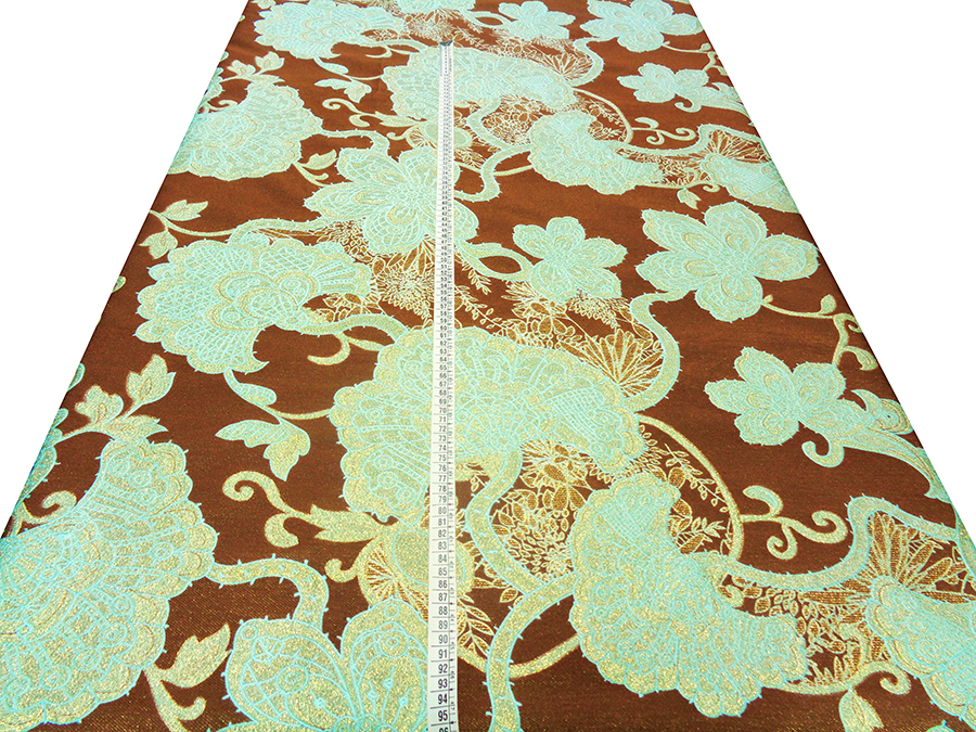 ESCLUSIVO E PREGIATO DAMASCATO IN SETA JAQUARD DOUBLEFACE ALTA MODA. CORPOSO, COMPATTO, SEMIRIGIDO. DA UN LATO FONDO TIFFANY CON GRANDI DISEGNI ORIENTALI MARRONI CON LUREX ORO EFFETTO RICAMO. DALL’ALTRO LATO FONDO MARRONE CON DISEGNI JAQUARD TIFFANY CON LUREX ORO EFFETTO RICAMO. POSSIBILITA’ DI UTILIZZO DA AMBO I LATI. TESSUTO UNISEX INDICATO PER: GIACCHE, CAPPOTTI, SOPRABITI  GONNE, ABITI, COMPLETI, PANTALONI,VESTAGLIE DA CAMERA  ECC..