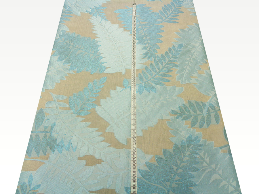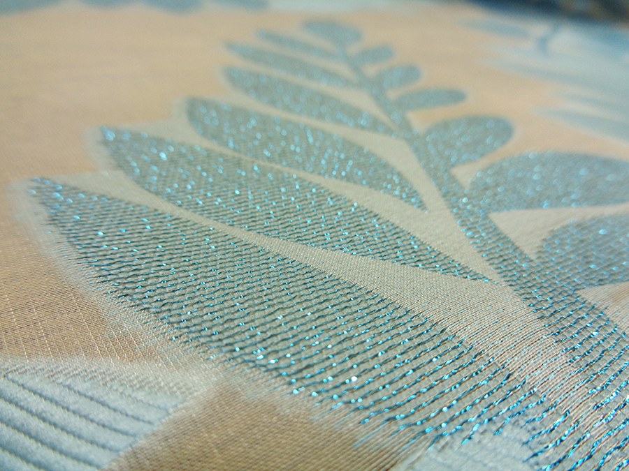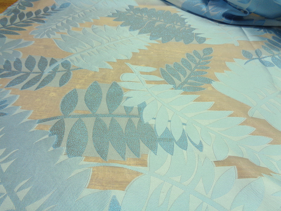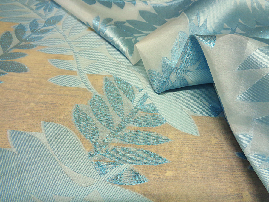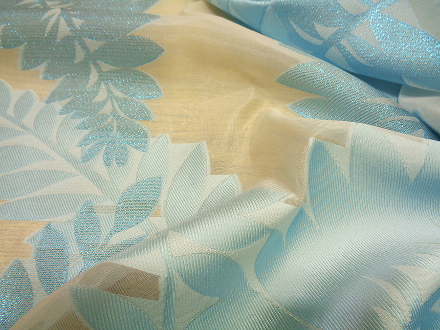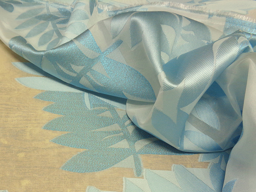 PREGIATO ED ESCLUSIVO TESSUTO IN ORGANZA DI SETA LEGGERA, CROCCANTE E LEGGERMENTE TRASPARENTE. FONDO AZZURRO CHIARISSIMO CON PARTICOLARE LAVORAZIONE JACQUARD A FOGLIE IN LUREX TURCHESI E FOGLIE IN IN DRILL SEMILUCIDO. INDICATO PER: CASACCHE, GIACCHE, ABITO, GONNA, CAMICIE, ECC..