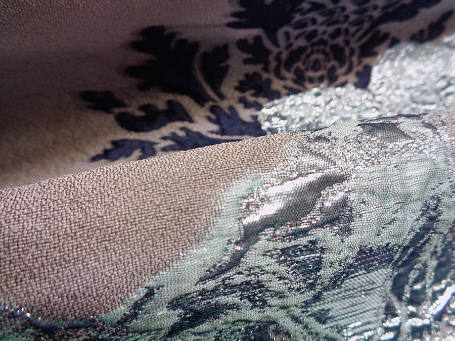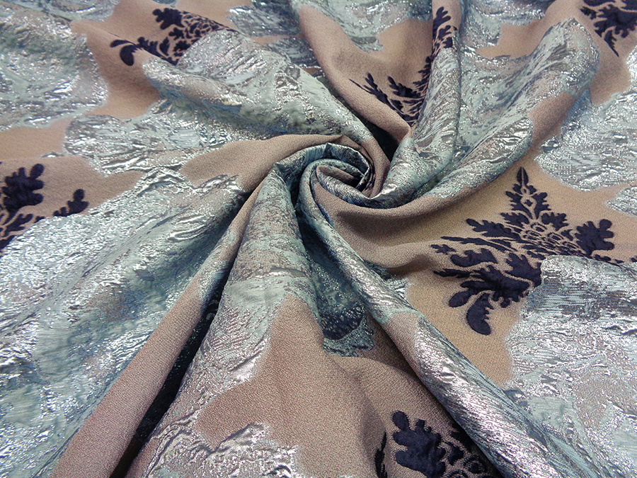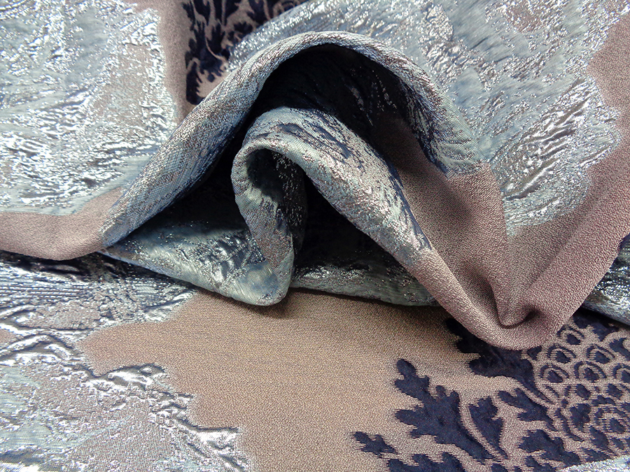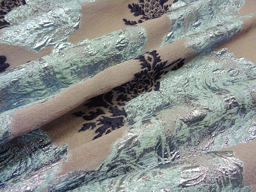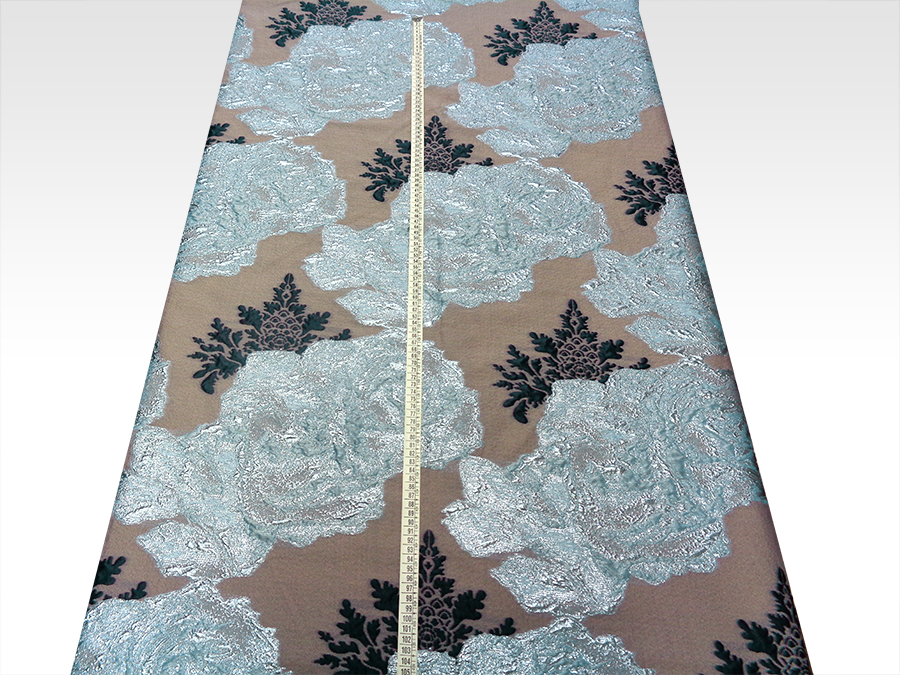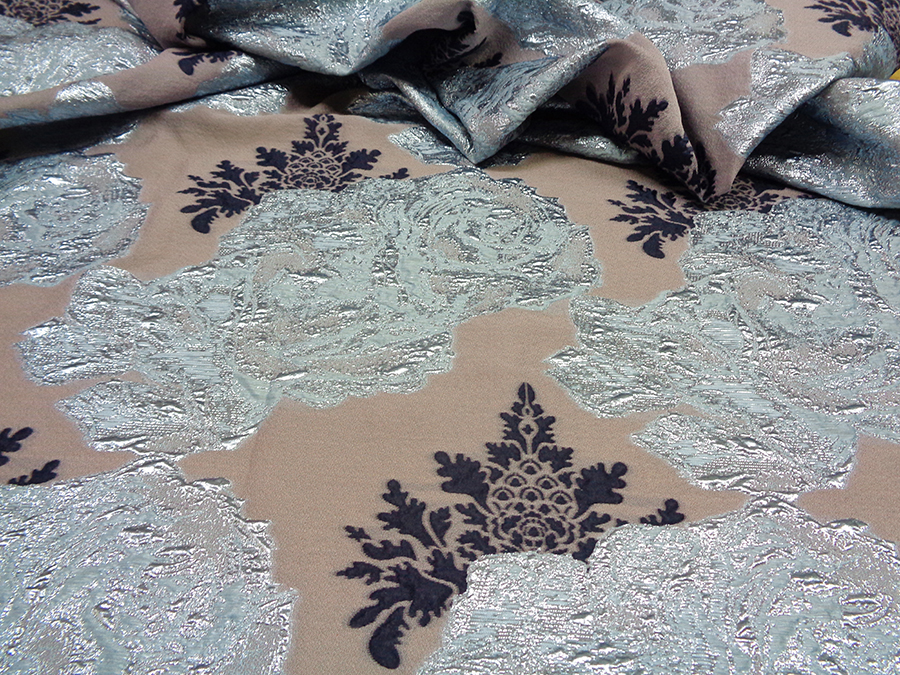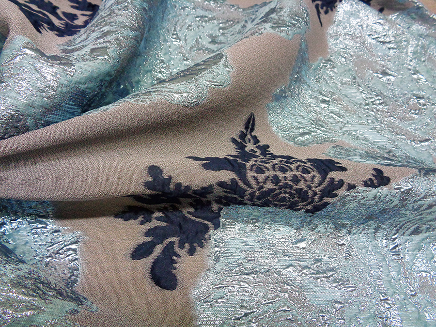 ARMANI STOCK (NO FIRMATO, NO CORREDATO DA ETICHETTA) ESCLUSIVO E PREGIATO TESSUTO JAQUARD ALTA MODA. LEGGERO, CROCCANTE, SOFFICE E LEGGERMENTE RIGIDO. FONDO IN ORGANZA PESANTE LEGGERMENTE TRASPARENTE CON LAVORAZIONE A CREPE COLORE TAUPE’ E GRANDI ROSE STILIZZATE JAQUARD IN LUREX E METALLO COLORE AZZURRO POLVERE CANGIANTE E FIORI JAQUARD BLU. INDICATO PER: ABITI ELEGANTI, GIACCHE, GONNE, SOPRABITI, STOLE, ECC..