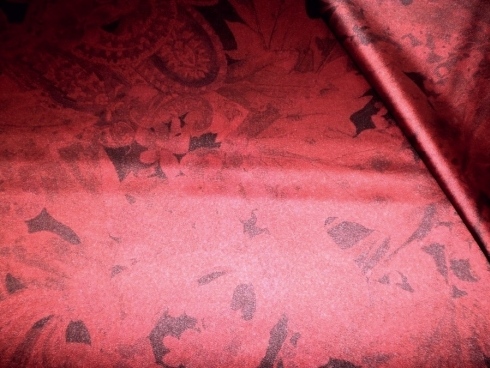 TESSUTO IMPERMEABILIZZATO SEMILUCIDO CON DISEGNI A FOGLIE E CASHMERE SUI TONI DEL BORDEAUX. INDICATO PER: CAPI, ANTIPIOGGIA, ANTIVENTO.