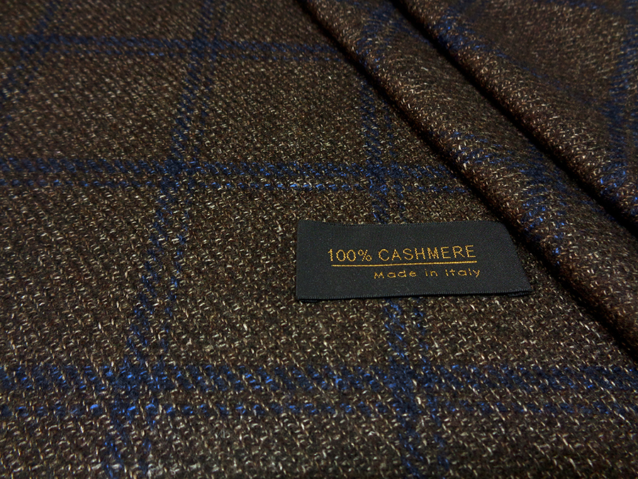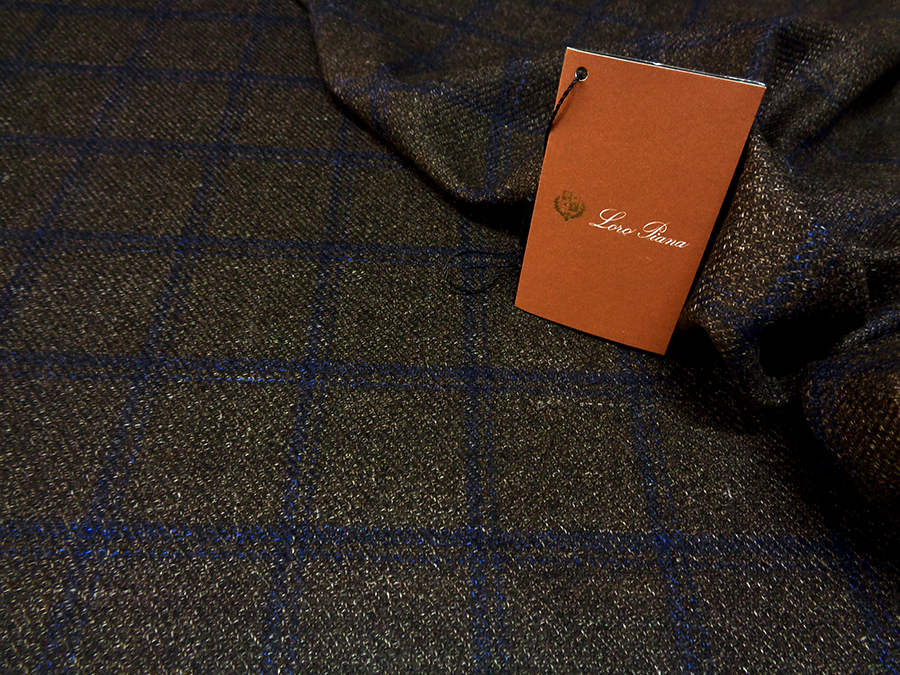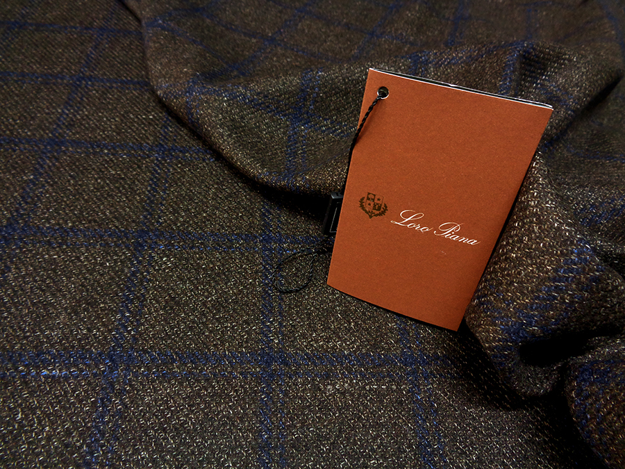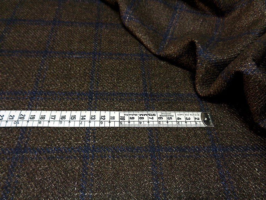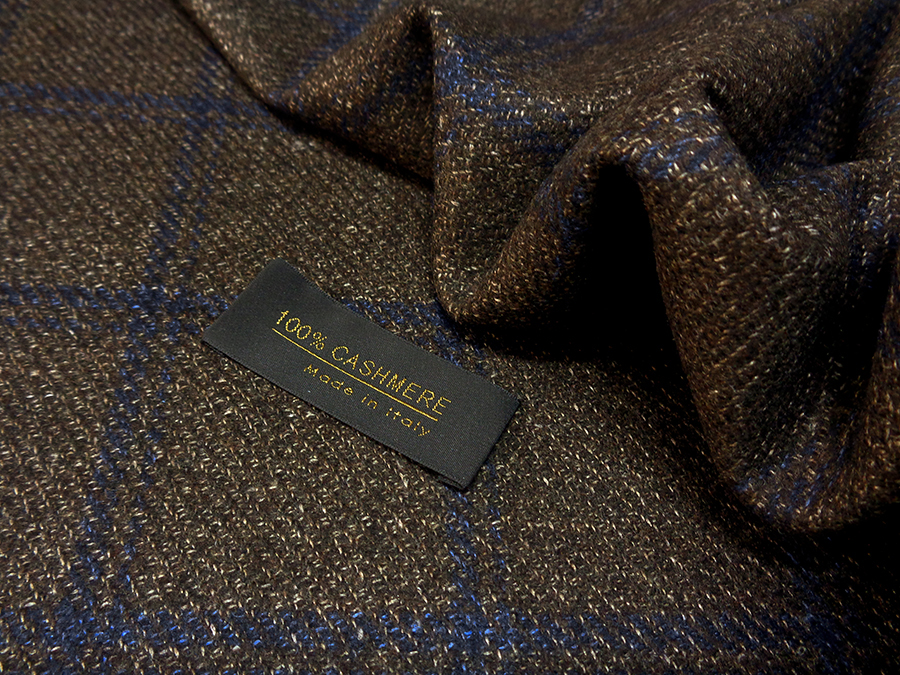 LORO PIANA STOCK (NO FIRMATO, NO CORREDATA DA ETICHETTE) PREGIATISSIMO TESSUTO IN PURO CASHMERE, PESO MEDIO, MORBIDO, SETOSO E RASATO. FONDO MARRONE MELANGE CON TRAMA DIAGONALE E FINESTRATO BLU. TESSUTO UNISEX. INDICATO PER: GIACCHE, ABITI, SOPRABITI CAPPOTTI, PANTALONI ECC..