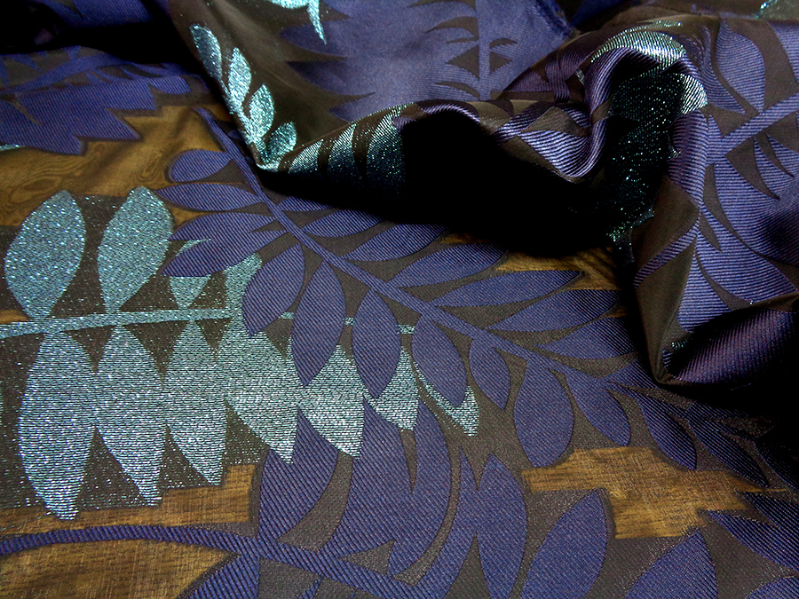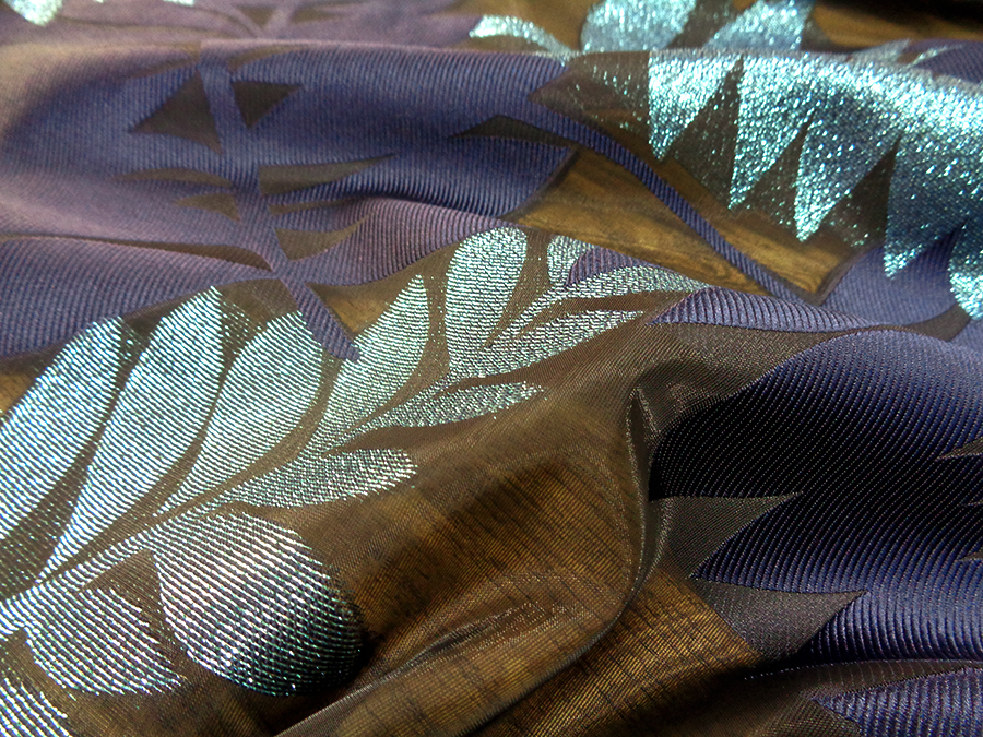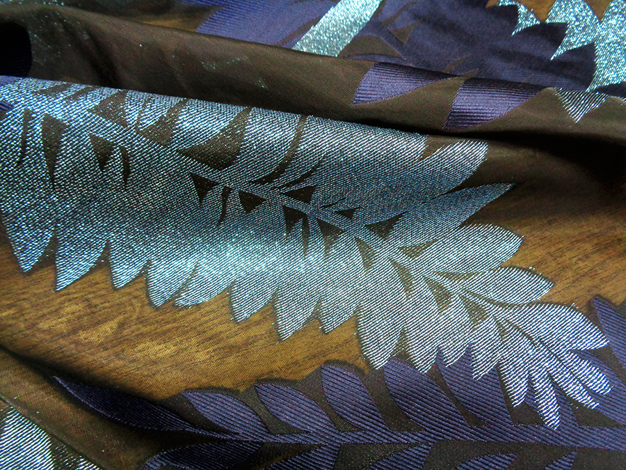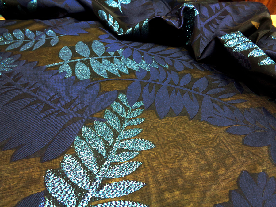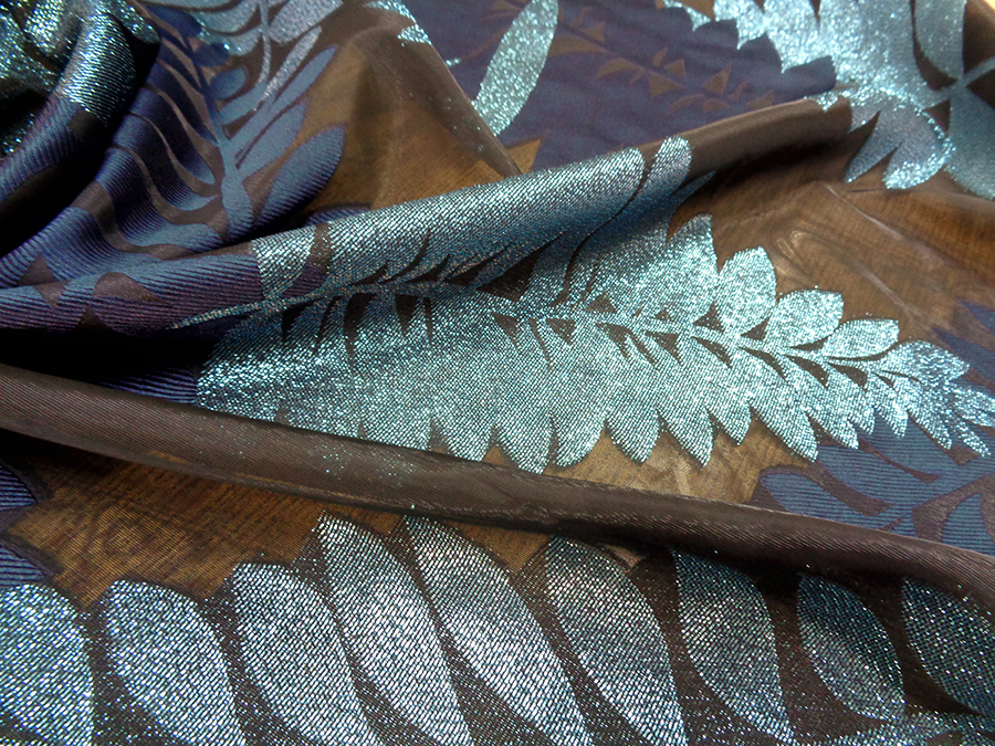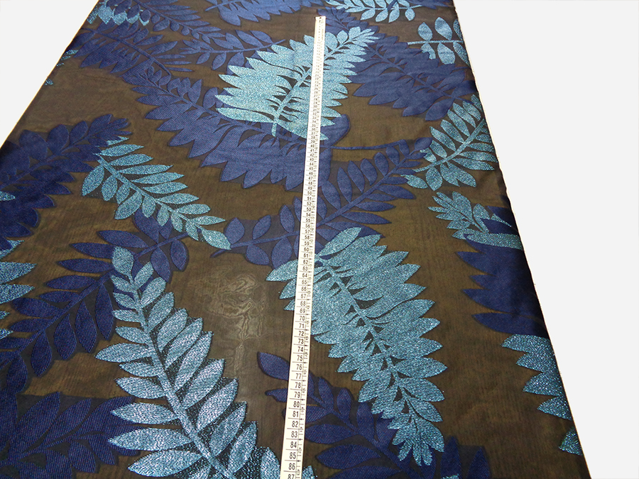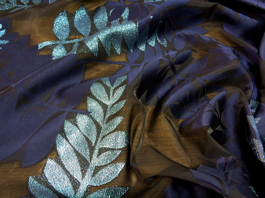 PREGIATO ED ESCLUSIVO TESSUTO IN ORGANZA DI SETA: LEGGERA, CROCCANTE E LEGGERMENTE TRASPARENTE. FONDO BLU SCURO CON PARTICOLARE LAVORAZIONE JACQUARD A FOGLIE IN LUREX IN COLOR TURCHESE SCURO E FOGLIE IN DRILL SEMILUCIDO BLU. INDICATO PER: CASACCHE, GIACCHE, ABITO, GONNA, CAMICIE, ECC..