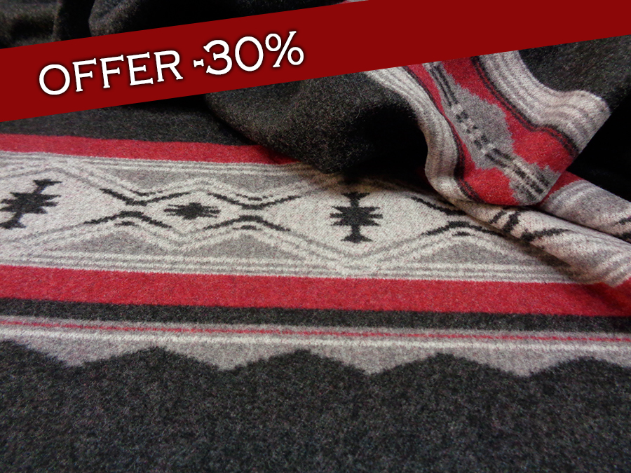 PREGIATO E PARTICOLARE TESSUTO CON FANTASIA ATZEKA. COMPATTO, CORPPOSO, PESANTE, MORBIDO E CALDO. FONDO GRIGIO SCURO MELANGE CON FASCE SUI TONI DEL BORDEAUX E GRIGIO CHIARO. NELL’ALTEZZA IL TESSUTO PRESENTA 3 FASCE (VEDI FOTO). DRITTOFILO CON FASCE IN VERTICALE. PER AVERE LE FASCE IN ORIZZONTALE LAVORARE IL TESSUTO IN CIRCONFERENZA. TESSUTO UNISEX INDICATO PER: CAPPOTTI, GIACCONI, SOPRABITI, GIACCHE PESANTI, MANTELLE, COPERTE, CAPPELLI,BORSE, ECC..