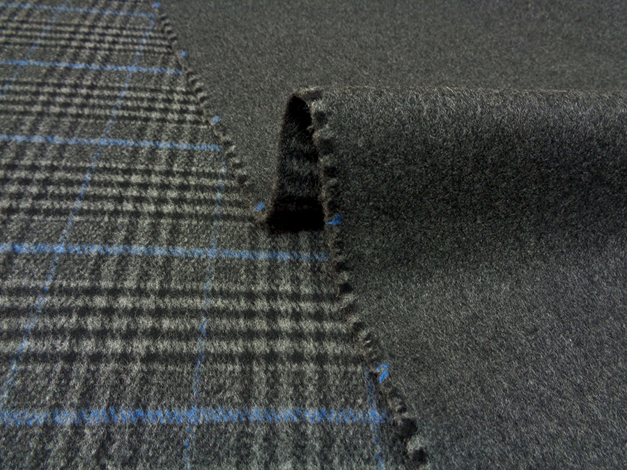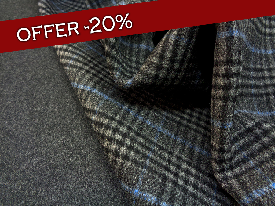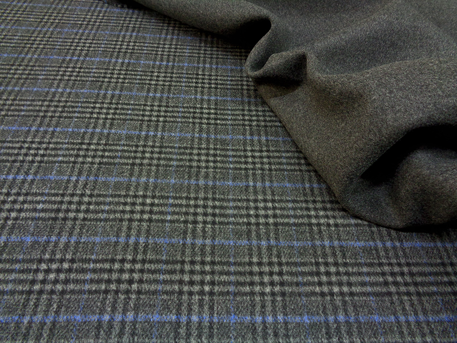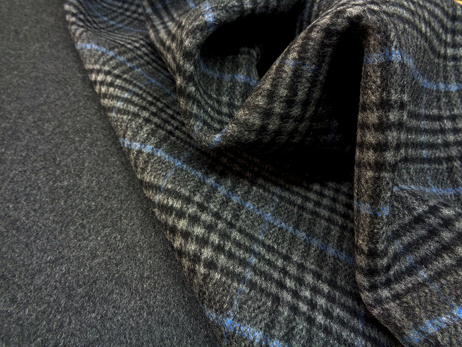 PREGIATO TESSUTO IN LANA E CASHMERE  DOUBLEFACE APRIBILE: PESANTE, CORPOSO, COMPATTO E CALDISSIMO DA UN LATO GRIGIO MEDIO MELANGE, DALL’ALTRO LATO CON PRINCIPE DI GALLES SUI TONI DEL GRIGIO, ANTRACITE  CON RIGA AZZURRA . POSSIBILITA’ DI ESSERE INDOSSATO E LAVORATO DA AMBO I LATI. TESSUTO UNISEX. INDICATO PER: CAPPOTTI, MONTGOMERY, GIACCONI, MANTELLE, COPERTE, CAPPELLI, BORSE, ECC..