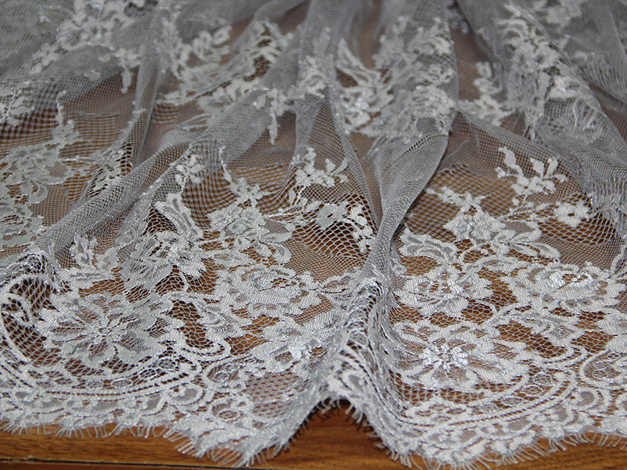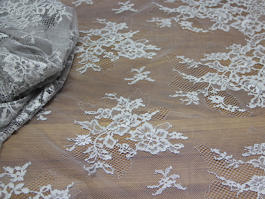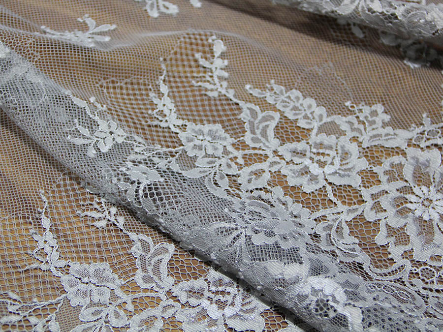 PREGIATO PIZZO VALENCIENNE, MORBIDO E LEGGERO SU BASE TULLE CON LAVORAZIONE LEGGERMENTE LUMINOSA RIFINITO CON DUE FESTONI UGUALI DA AMBO I LATI. INDICATO PER: SPOSA, CERIMONIA, ABITI ELEGANTI, ECC..