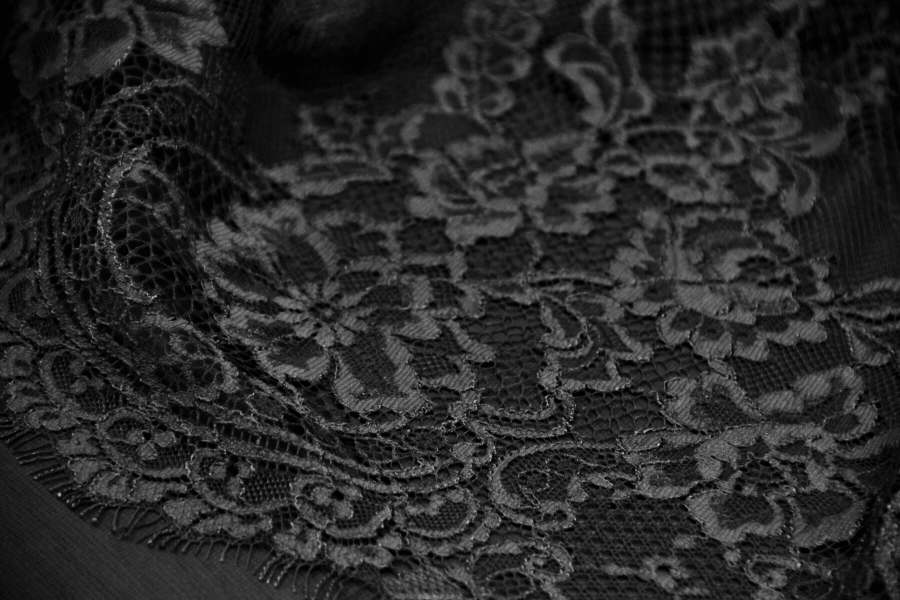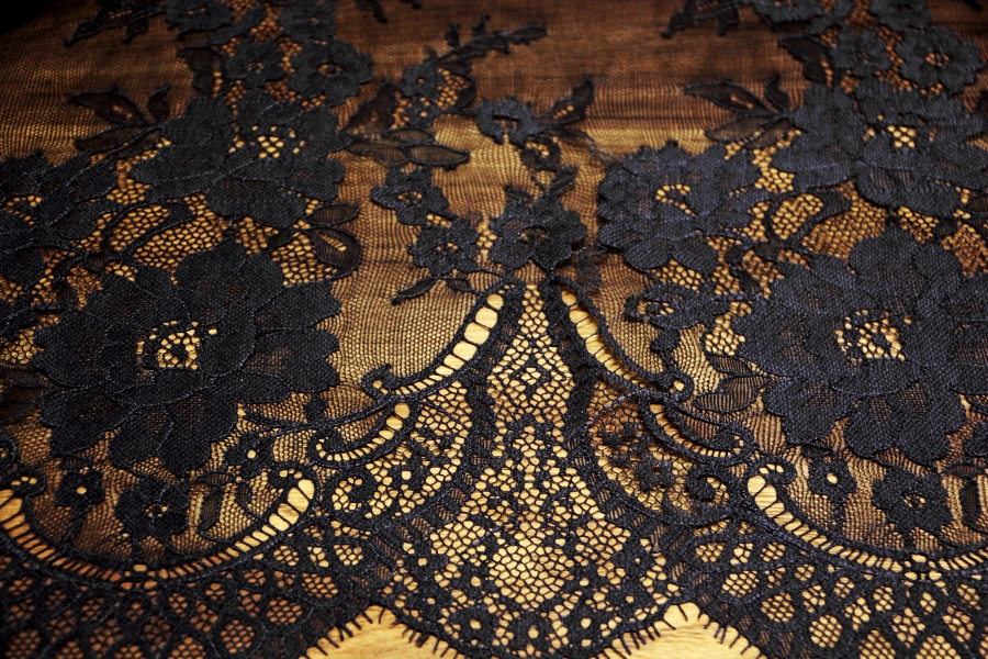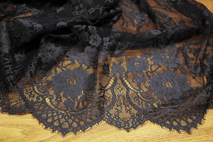 PREGIATO PIZZO VALENCIENNE, MORBIDO E LEGGERO SU BASE TULLE CON LAVORAZIONE LEGGERMENTE LUMINOSA RIFINITO CON DUE FESTONI UGUALI DA AMBO I LATI. INDICATO PER: SPOSA, CERIMONIA, ABITI ELEGANTI, ECC..