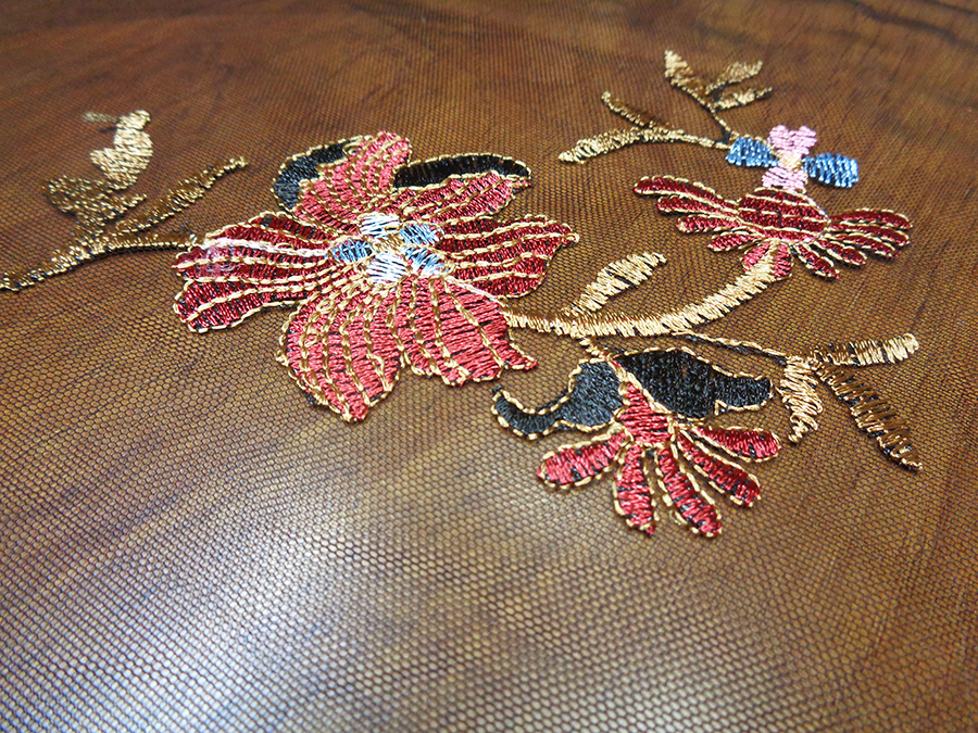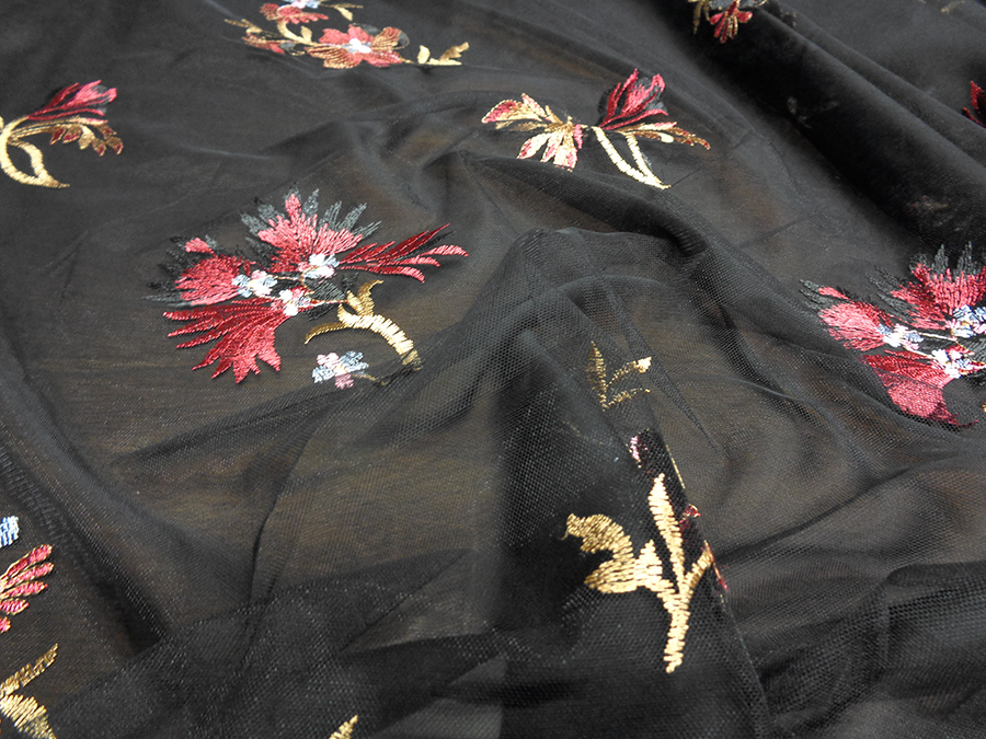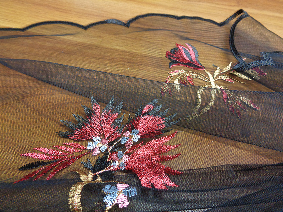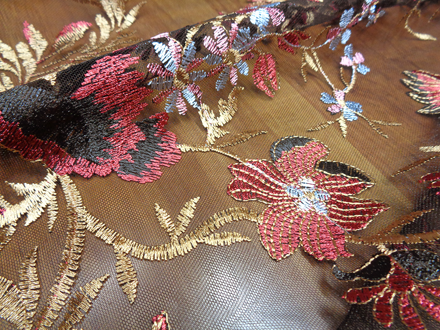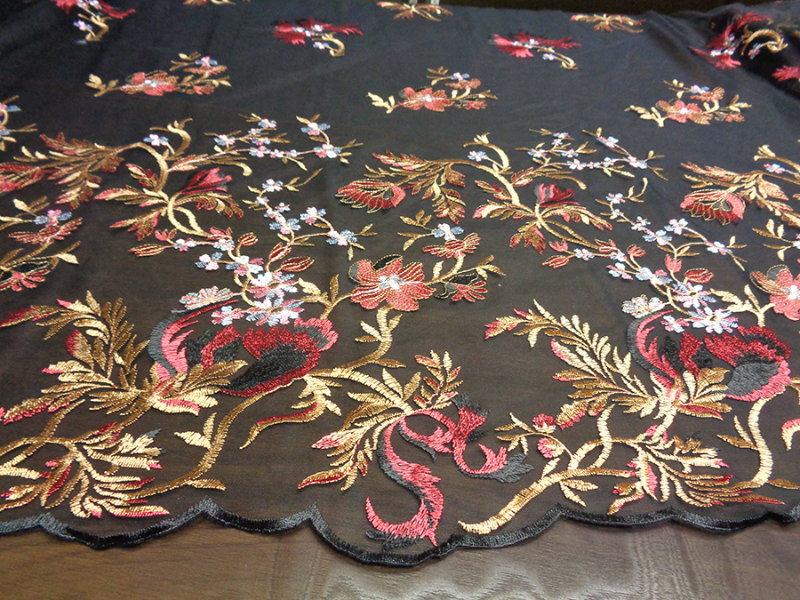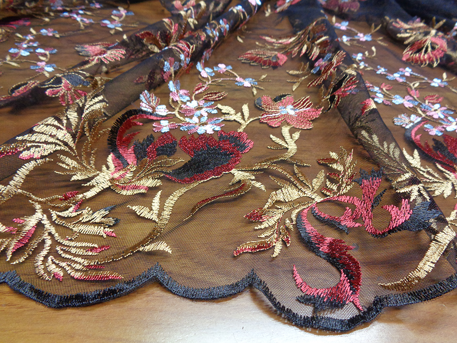 ELEGANTE E PARTICOLARE TULLE RICAMATO DEGRADE’. LEGGERISSIMO E TRASPARENTE. BASE TULLE COLOR NERO CON RICAMI IN DEGRADE’ DA CIMOSA A CIMOSA SUI TONI DEL BORDEAUX, CAMMELLO DORATO, ROSA E AZZURRO. RIFINITO AI 2 LATI CON FESTONI DIVERSI. INDICATO PER: ABITI ELEGANTI, GONNE, CAMICIE, TOP, CASACCHE, ECC..