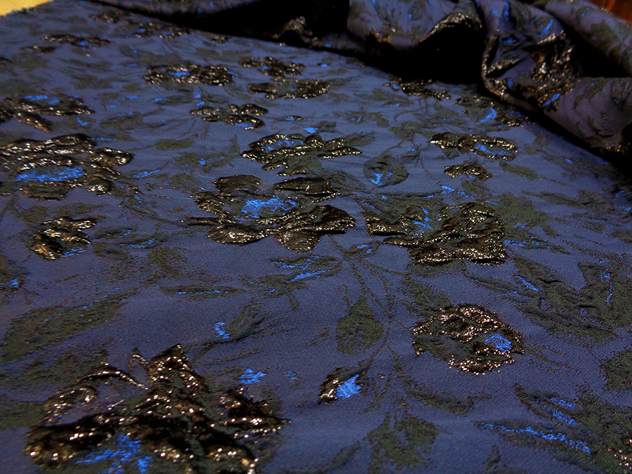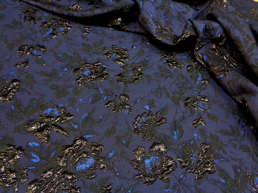 PREGIATO ED ESCLUSIVO BROCCATO IN SETA. PESO MEDIO, CORPOSO, LEGGERMENTE MORBIDO E SETOSO. FONDO BLU CON PREZIOSA LAVORAZIONE FLOREALE IN RILIEVO IN LUREX NERO E BLU CHIARO. INDICATO PER: ABBIGLIAMENTO E ARREDAMENTO, ECC..
