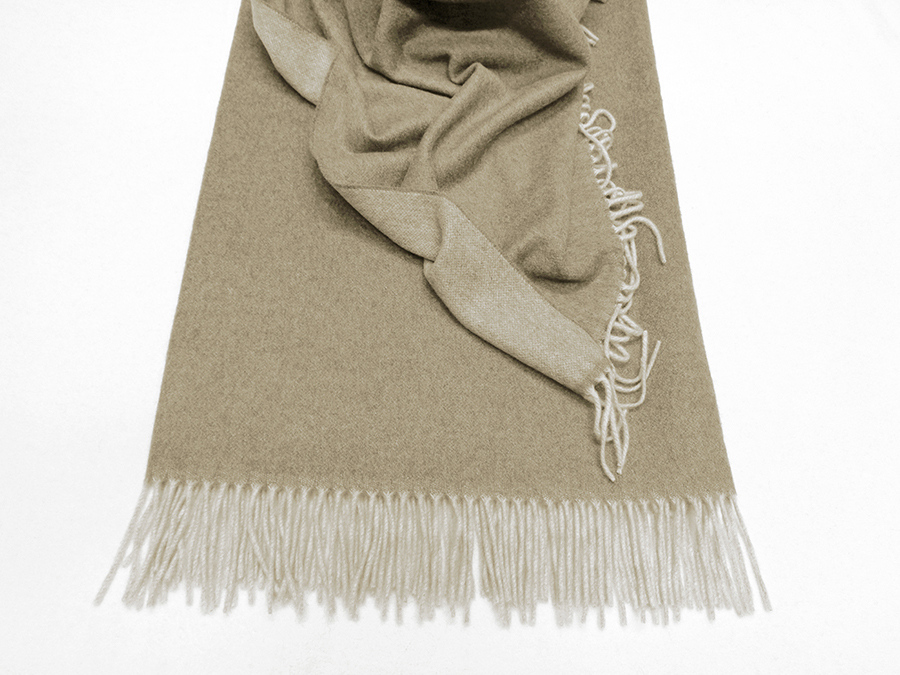 PREGIATISSIMO PLAID DOUBLEFACE REALIZZATO A TELAIO CON FILATO NATURALE NON TINTEGGIATO TOP MONGOLIA  ULTRASOFT, CON PARTICOLARE LAVORAZIONE AIRCASH* CHE RENDE LA FIBRA  INCREDIBILMENTE MORBIDA, CALDA E SOFFICE.  COLORE NATURALE MELANGE  DA UN LATO (NON TINTEGGIATO) E TONALITA’ LEGGERMENTE PIU’ CHIARA DALL’ALTRO LATO. POSSIBILITA’ DI UTILIZZO DA AMBO I LATI. FRANGIA COLORE NATURALE. MORBIDEZZA E CALORE UNICI ED INCOMPARABILI. PLAID UNISEX.