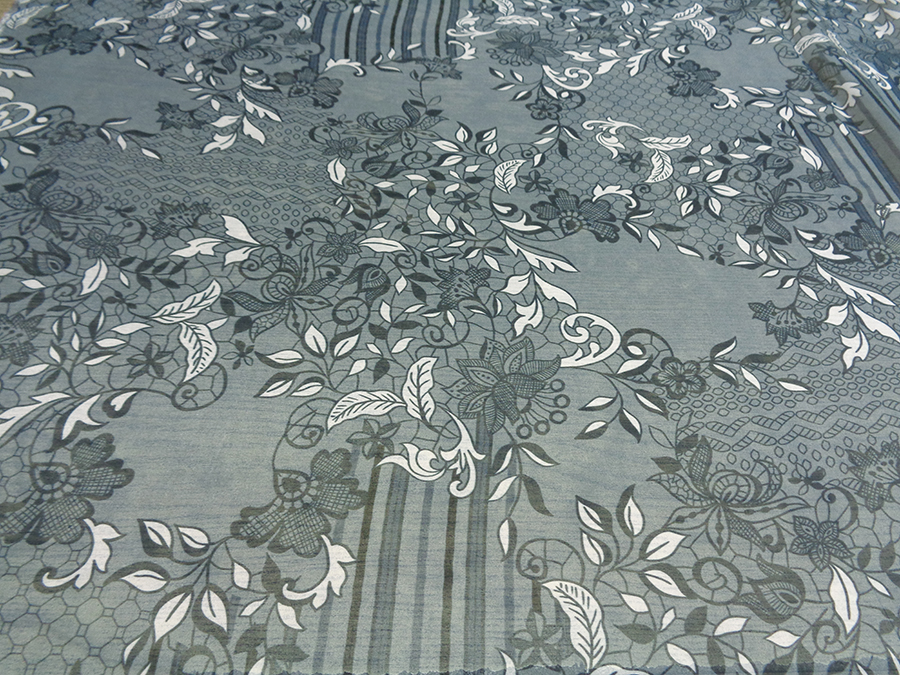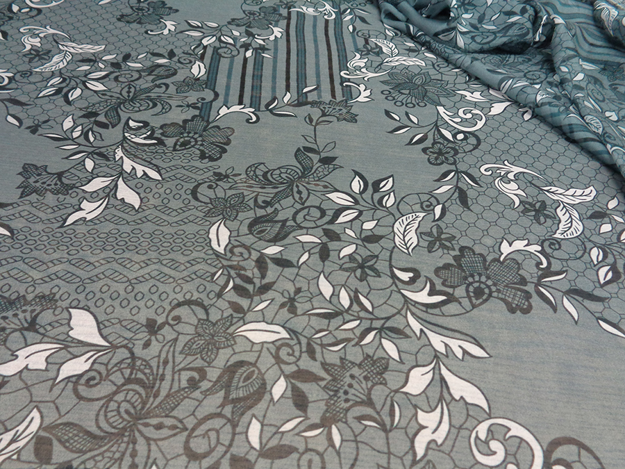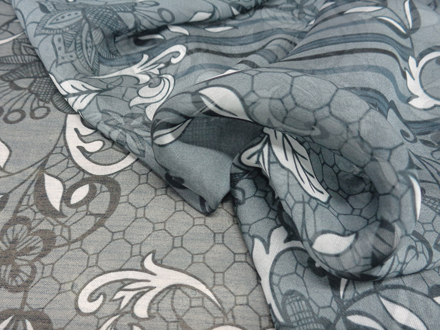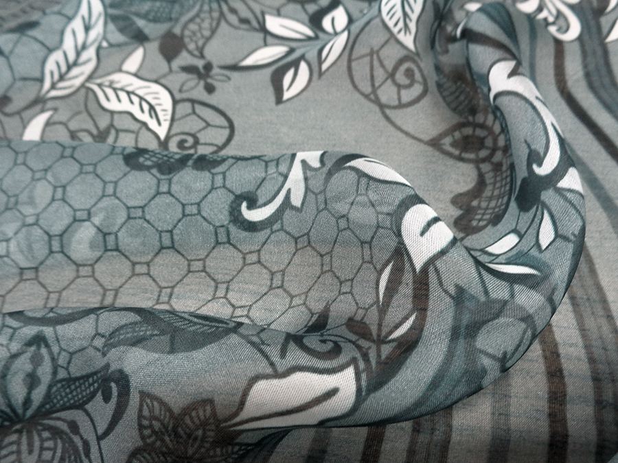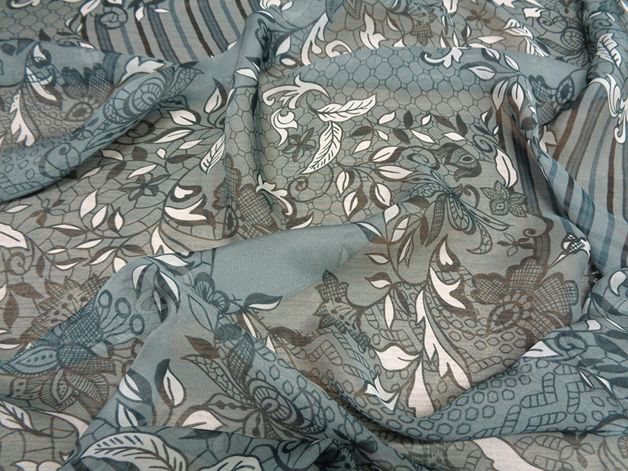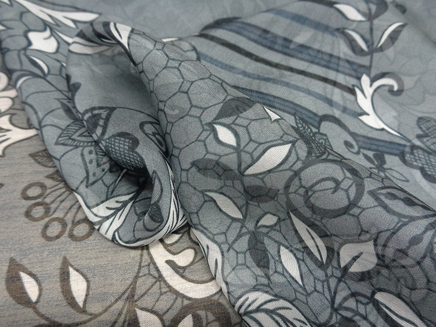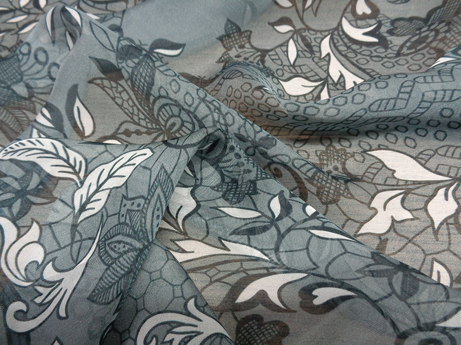 PREGIATO CHIFFON CON FINITURA CHARMEAUSE (LEGGERMENTE LUMINOSO ) VELATO, LEGGERO E MORBIDISSIMO, FONDO GRIGIO AZZURRATO CON FANTASIA SUI TONI DEL BIANCO E GRIGIO SCURO. INDICATO PER: ABITI, BLUSE, GONNE, CAFTANI, ECC..
